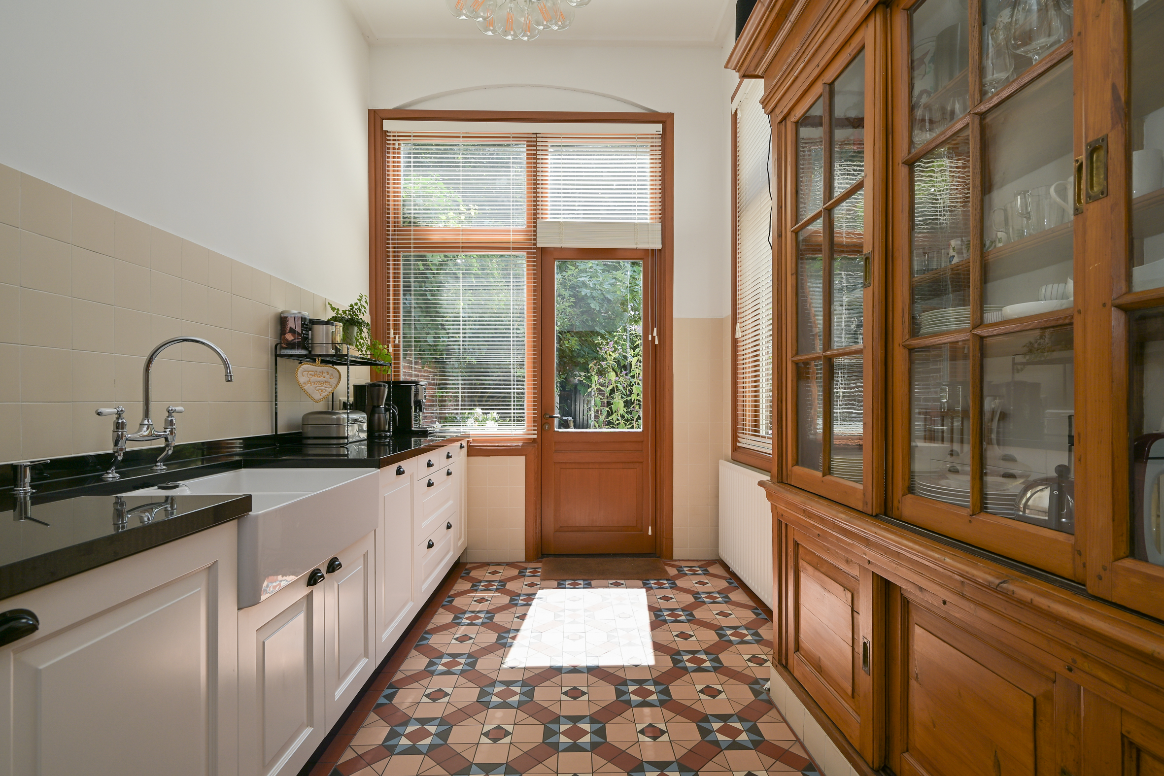 The ground floor features generous reception rooms with parquet and marble flooring, along with a modern kitchen equipped with integrated appliances and a statement original crockery cupboard. Both kitchen and sun room flow into the garden, while a cellar sits below for practical storage. Upstairs, the principal rooms continue the theme of tall ceilings, original mantels, and fitted cabinetry, connected by a graceful staircase. The bathroom is equipped with a design bathtub, double vanity, walk-in shower, and underfloor heating. The upper level, illuminated by a skylight, includes wooden flooring throughout, multiple bedrooms, laundry space, and options for an additional bathroom. Solar panels, double glazing, insulation, and energy class C underline a commitment to modern living. Period character meets energy efficiency in this carefully maintained Duinoord townhouse.