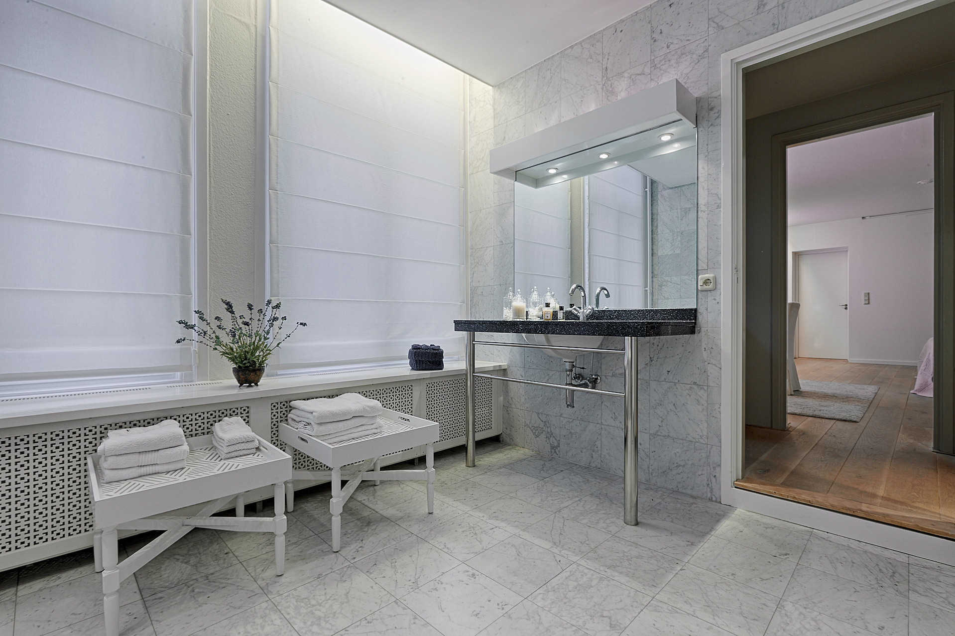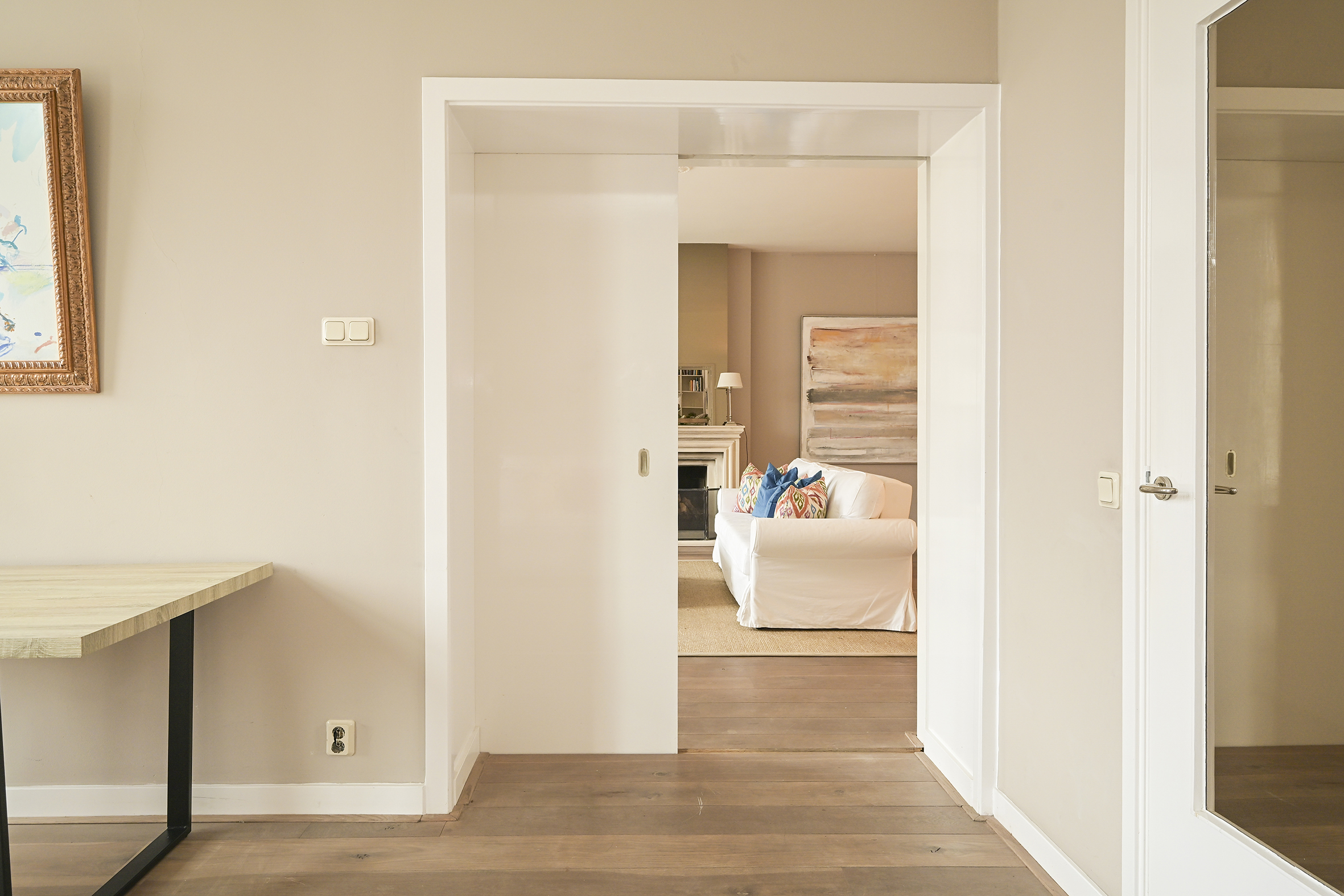 At the front of the building is the imposing living room, high ceilings, a stylish fireplace, and a phenomenal view of the Hofvijver. From the living room, there is an elegant passageway to a spacious library or bedroom, complete with open bookcases. Adjacent is a hallway with ample closet space and a finished marble bathroom with a vanity, shower, and toilet. The kitchen is equipped with built-in appliances and ample closet space. At the rear of the apartment is the very spacious master bedroom, offering peace and privacy. This room opens onto a hallway with a walk-in closet and space for the gas central heating boiler. There is also a separate laundry room with connections for a washer and dryer and additional storage space. The second, luxurious marble bathroom features a bathtub, a spacious walk-in shower, a stylish vanity with a built-in vanity, and a toilet.