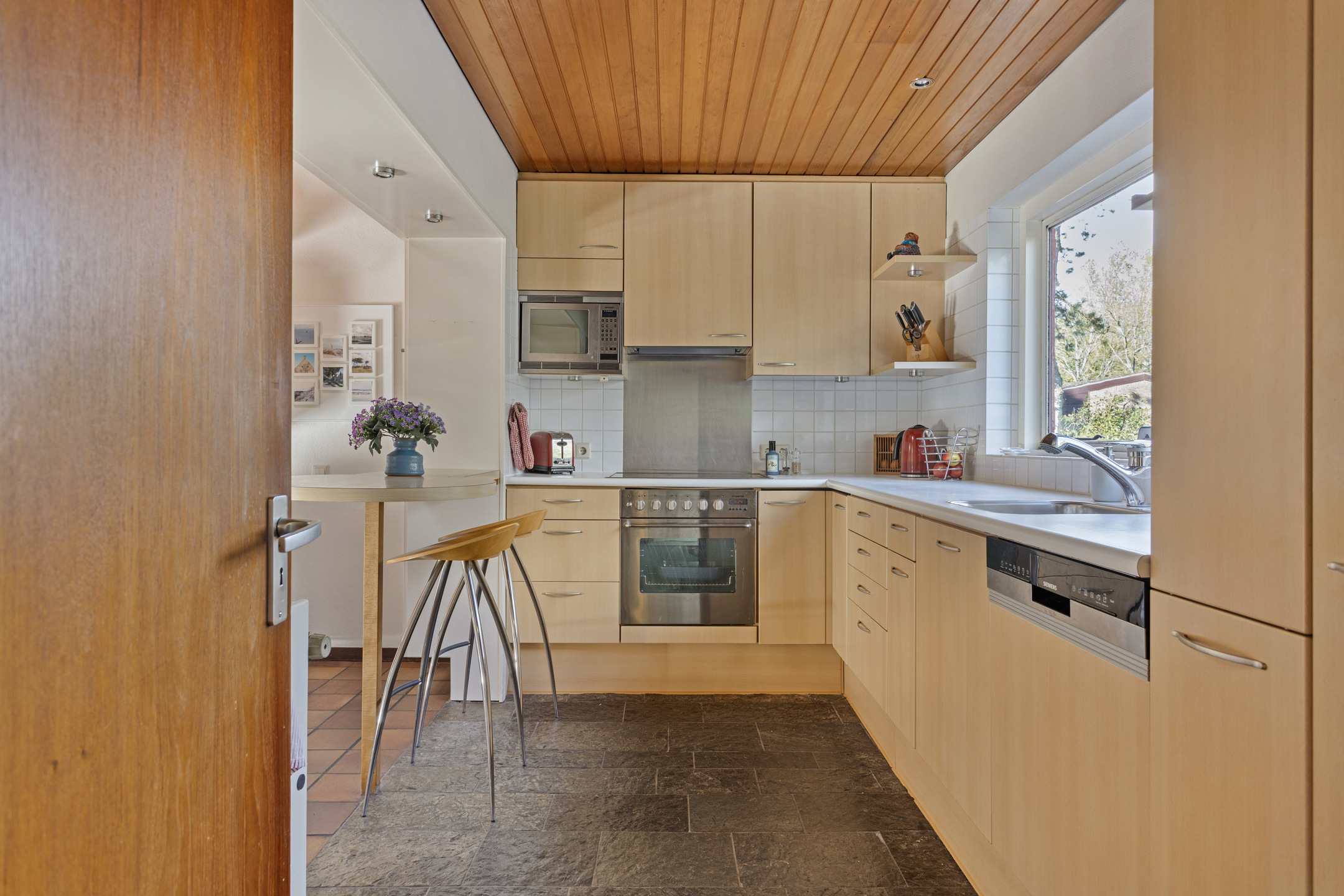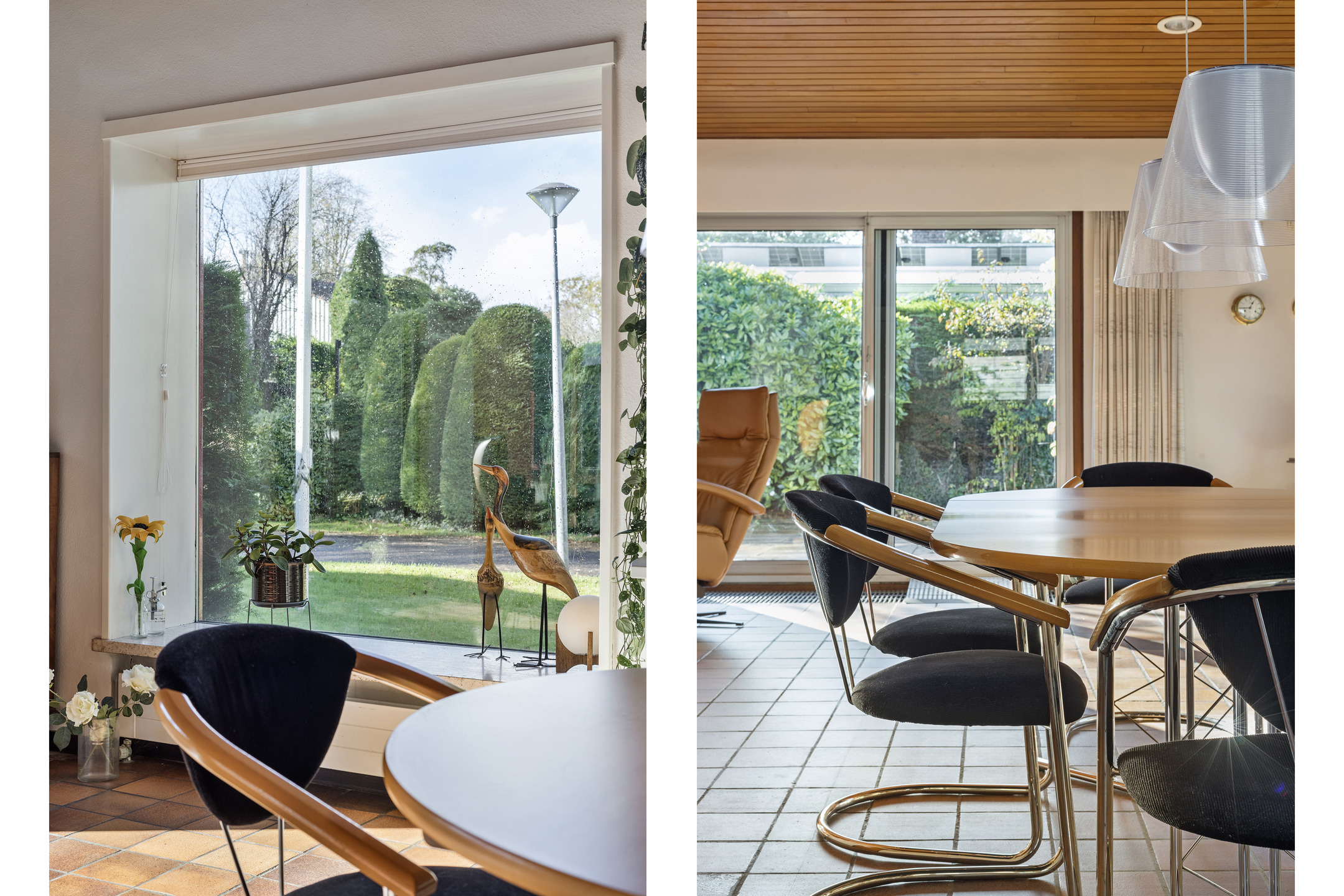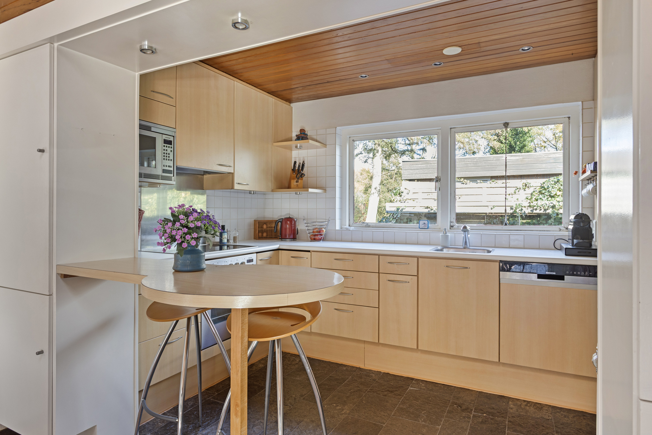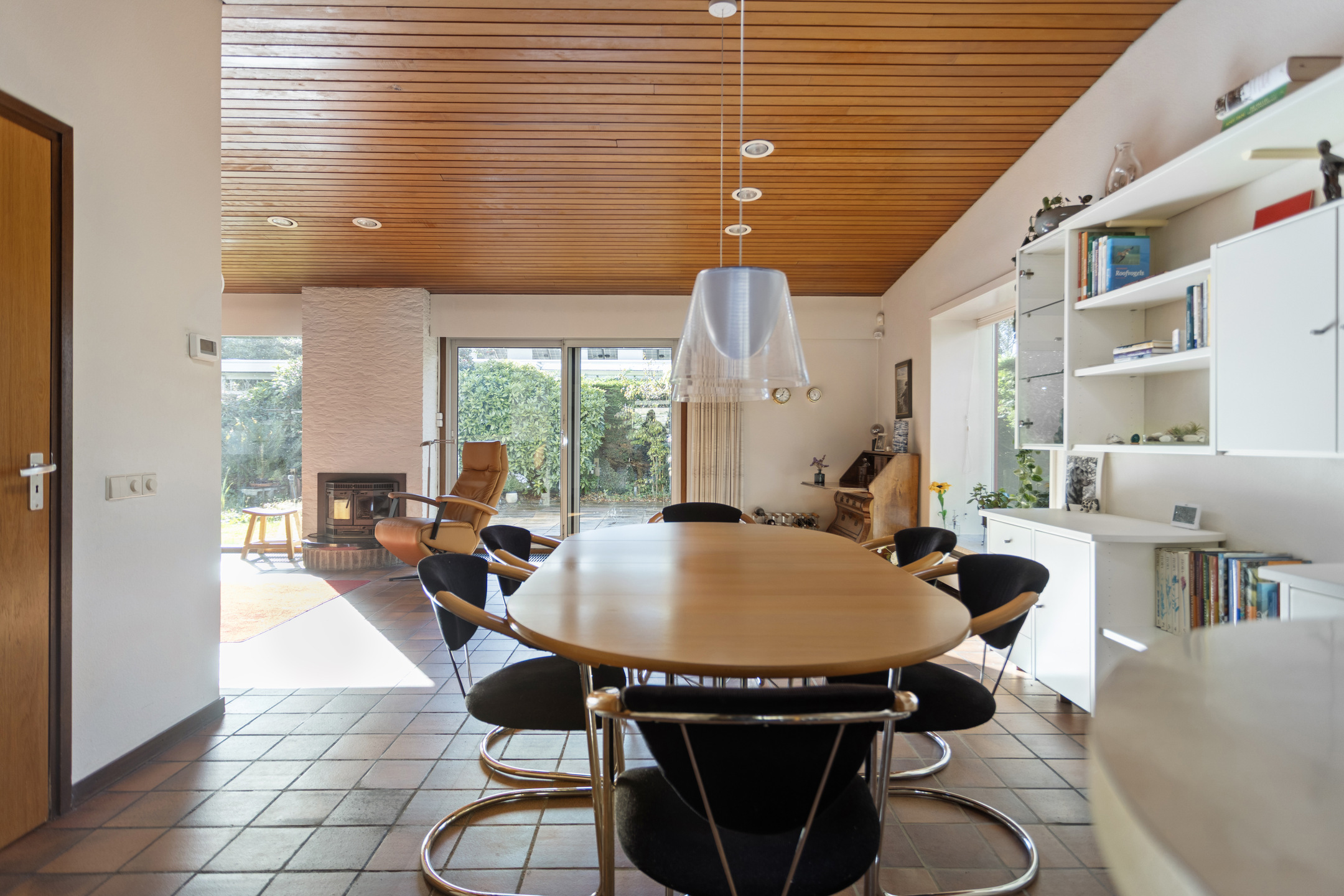 De royale woonkamer met grote raampartijen, schuifpui en open haard biedt een sfeervolle leefruimte met prachtig zicht op de tuin. Aansluitend de eetkamer en de halfopen keuken, uitgerust met onder andere een oven, vaatwasser, elektrische kookplaat en koelkast. De houten plafondafwerking zorgt voor een warme, karakteristieke uitstraling.
