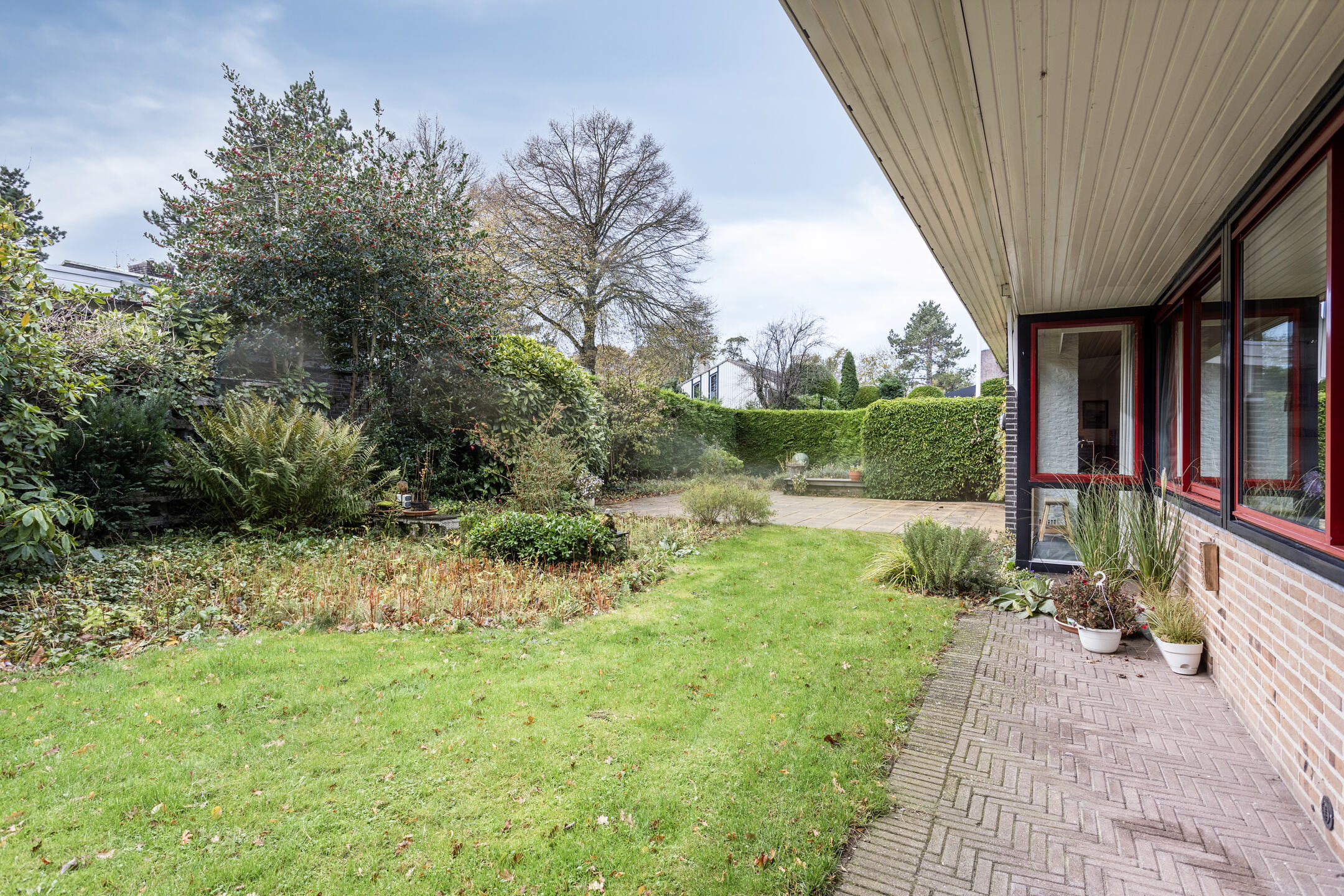 De fraai aangelegde tuin op het zuiden biedt veel privacy, groen en meerdere terrassen. Hier kunt u volop genieten van de zon, rust en ruimte. De oprit biedt ruimte voor meerdere auto’s.