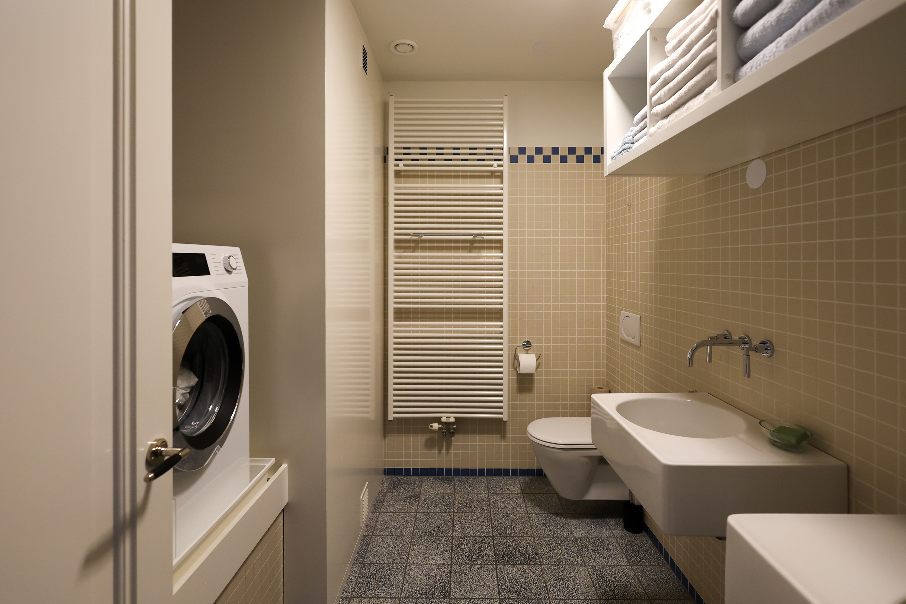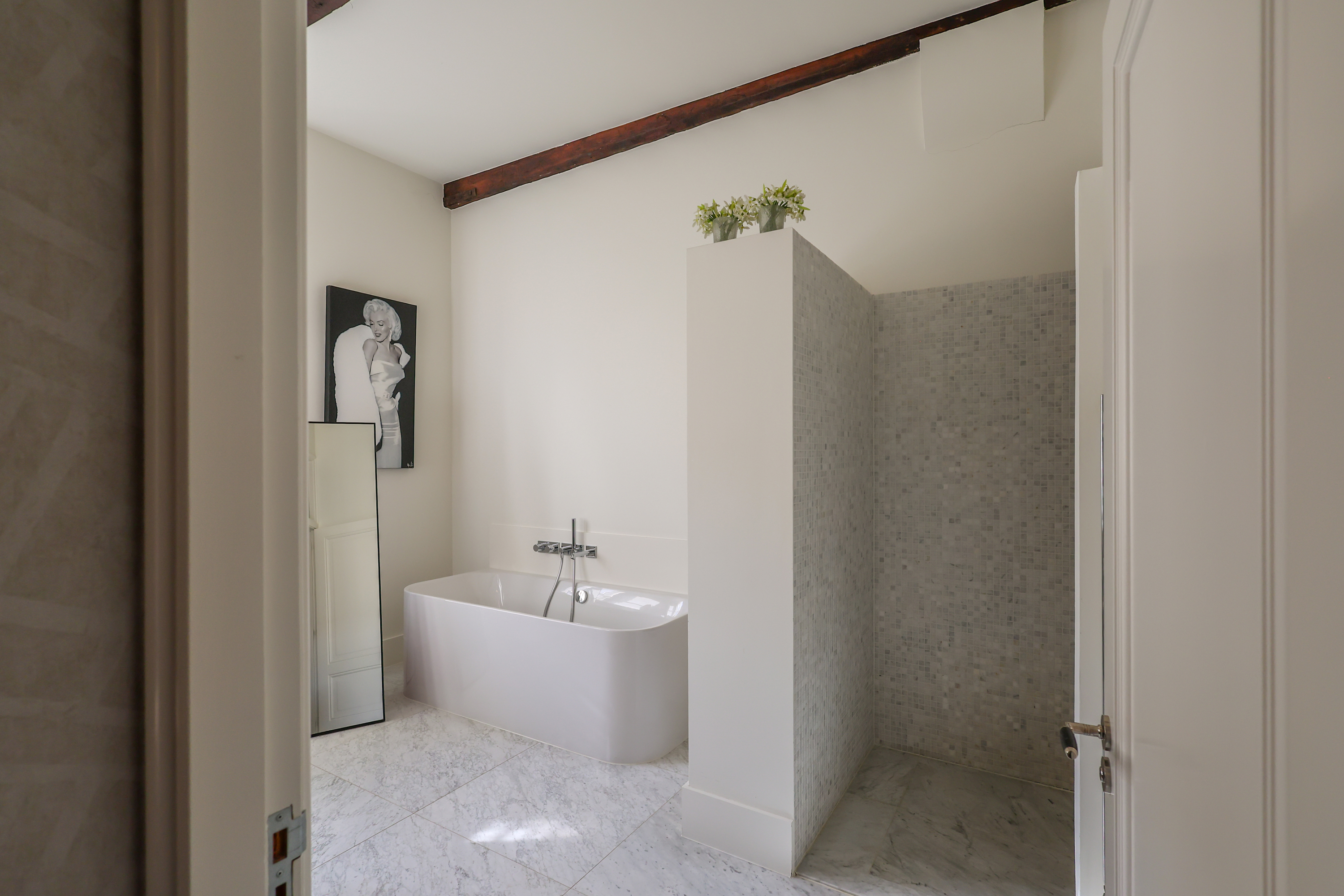 The first floor offers a spacious primary bedroom with a walk-in closet fitted with custom cabinetry, and a modern, stylish bathroom with double sinks, a bathtub, and a walk-in shower. On the landing, you’ll also find a practical laundry room/toilet. The impressive work/play/bedroom, with its exposed section of the old city wall and full-width skylights, is a wonderful space to work, play, or unwind.