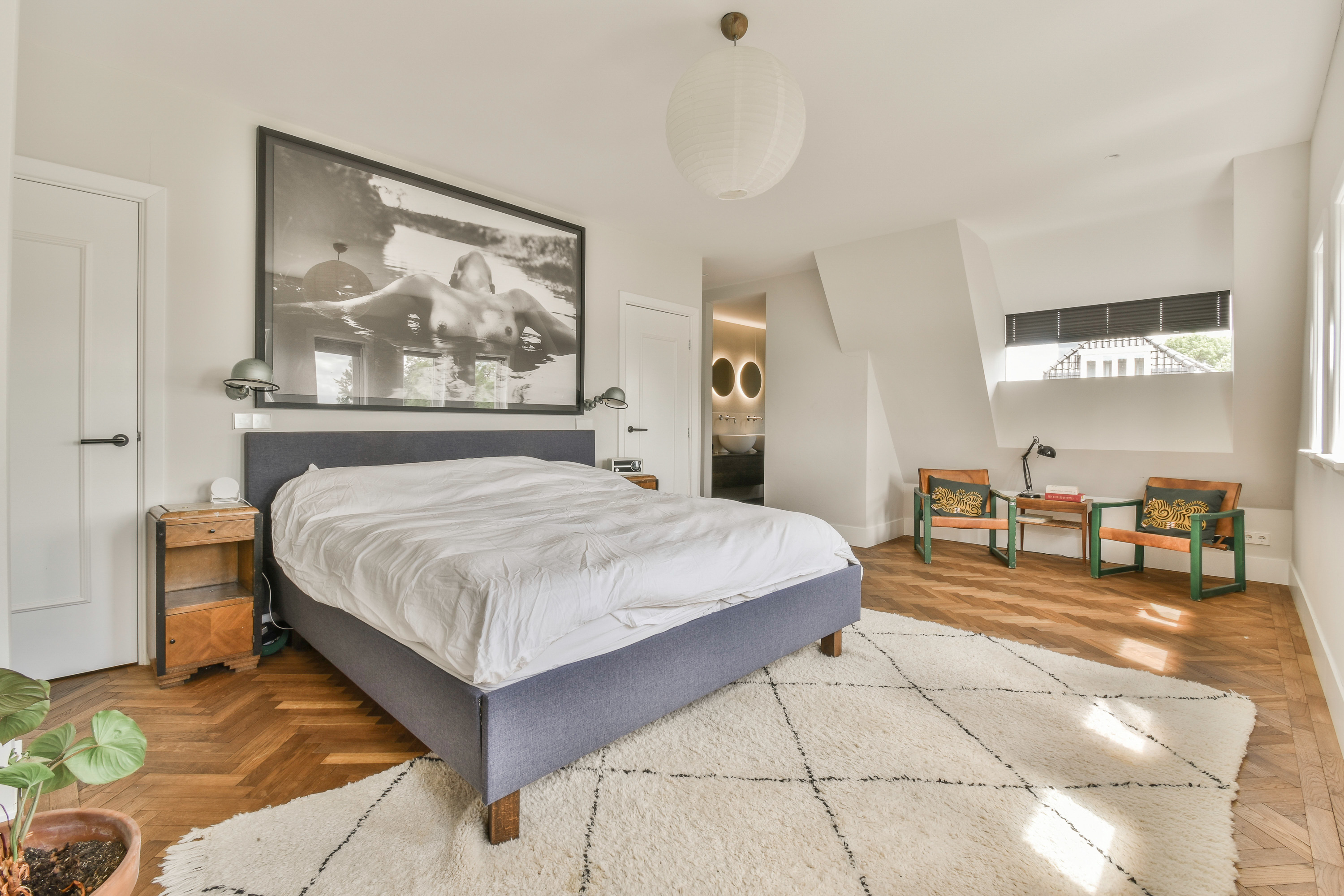 A staircase leads to the first floor, where peace and privacy are key. At the front of the home is the spacious bedroom, offering panoramic views of the Amstel. This room includes a large walk-in closet and a luxurious en-suite bathroom with a freestanding bathtub, double vanity, walk-in shower and toilet. At the rear is a second large bedroom, also with an en-suit bathroom. This bathroom is equipped with a double sink, walk-in shower and toilet. A bright landing connects the rooms and enhances the overall sense of space and refinement.