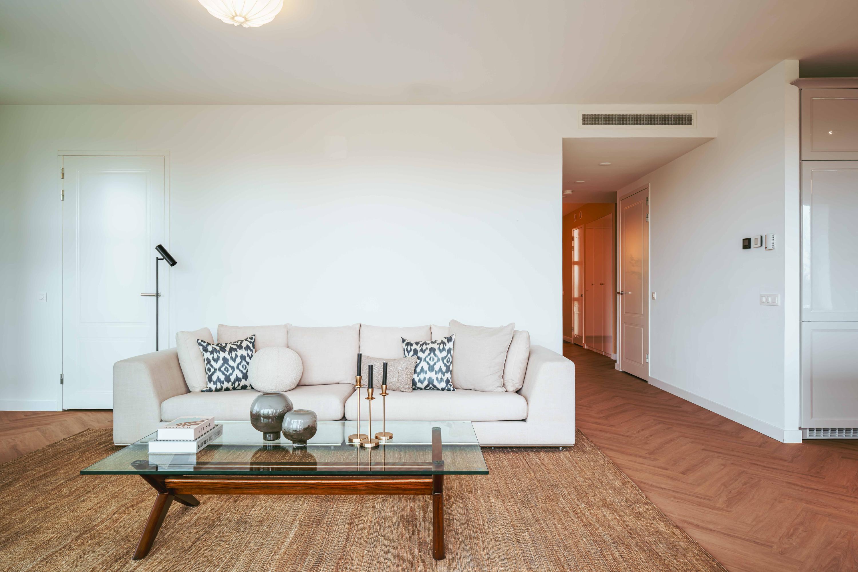 The beautiful, large living room receives abundant natural light through its many windows. The Siematic kitchen island is a true centerpiece, equipped with various built-in appliances including an induction hob with integrated extraction, oven, combination oven-microwave, Quooker, and a large refrigerator. There is also a separate pantry with space for a wine climate cabinet and freezer. The sunny balcony faces southwest, providing a delightful spot to relax and enjoy unobstructed views.