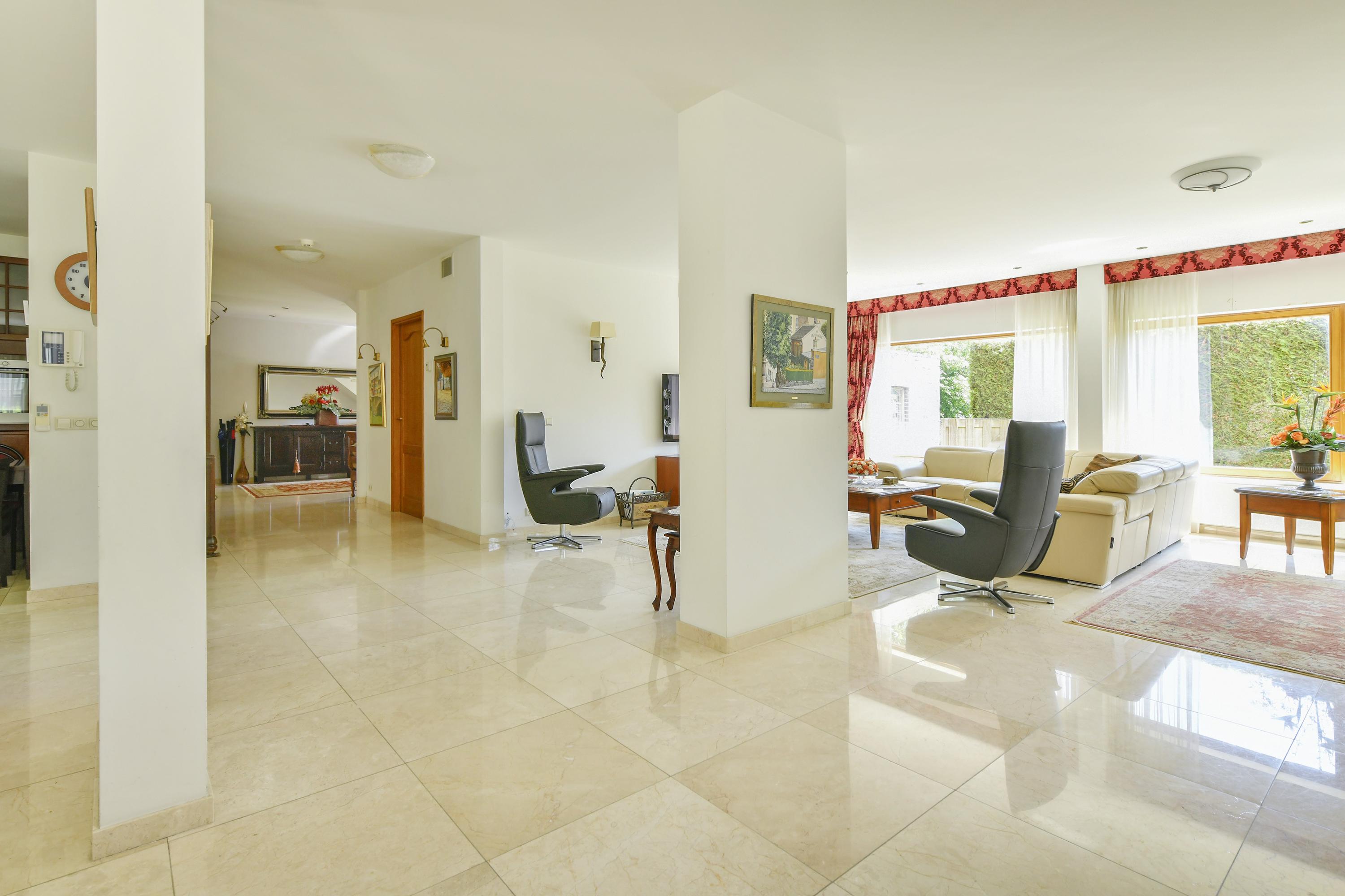 Through the broad front door you enter the spacious hallway with cloakroom and toilet. From here you walk through an open connection into the living room with open-plan kitchen. The bright living room extends across the full width of the house and features large windows and French doors opening onto the garden. Its southwest orientation allows you to enjoy natural light throughout the day as well as beautiful views of the garden.