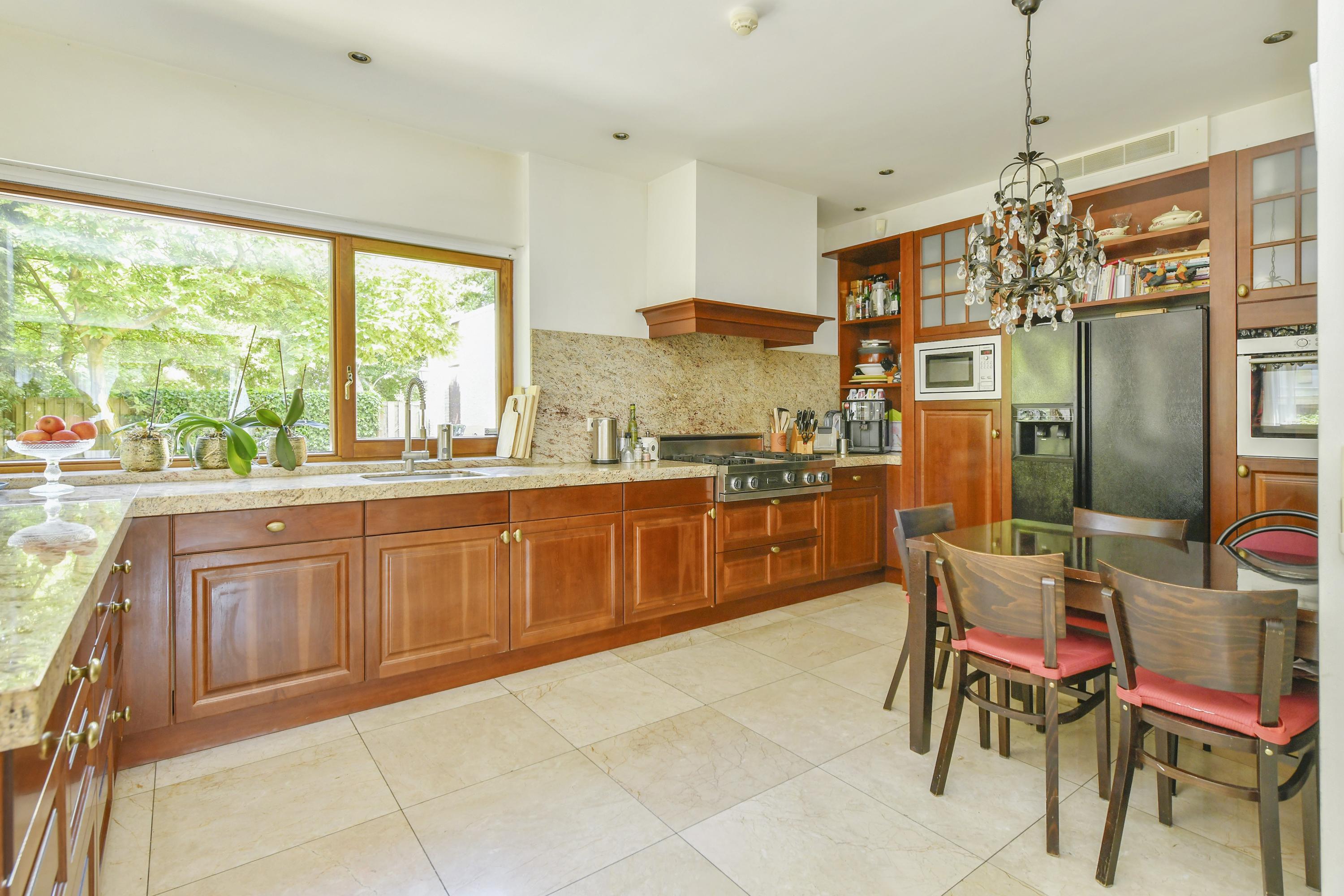 The open kitchen is equipped with built-in appliances. Its spacious and open design creates an inviting living area where cooking, dining and spending time together blend seamlessly.