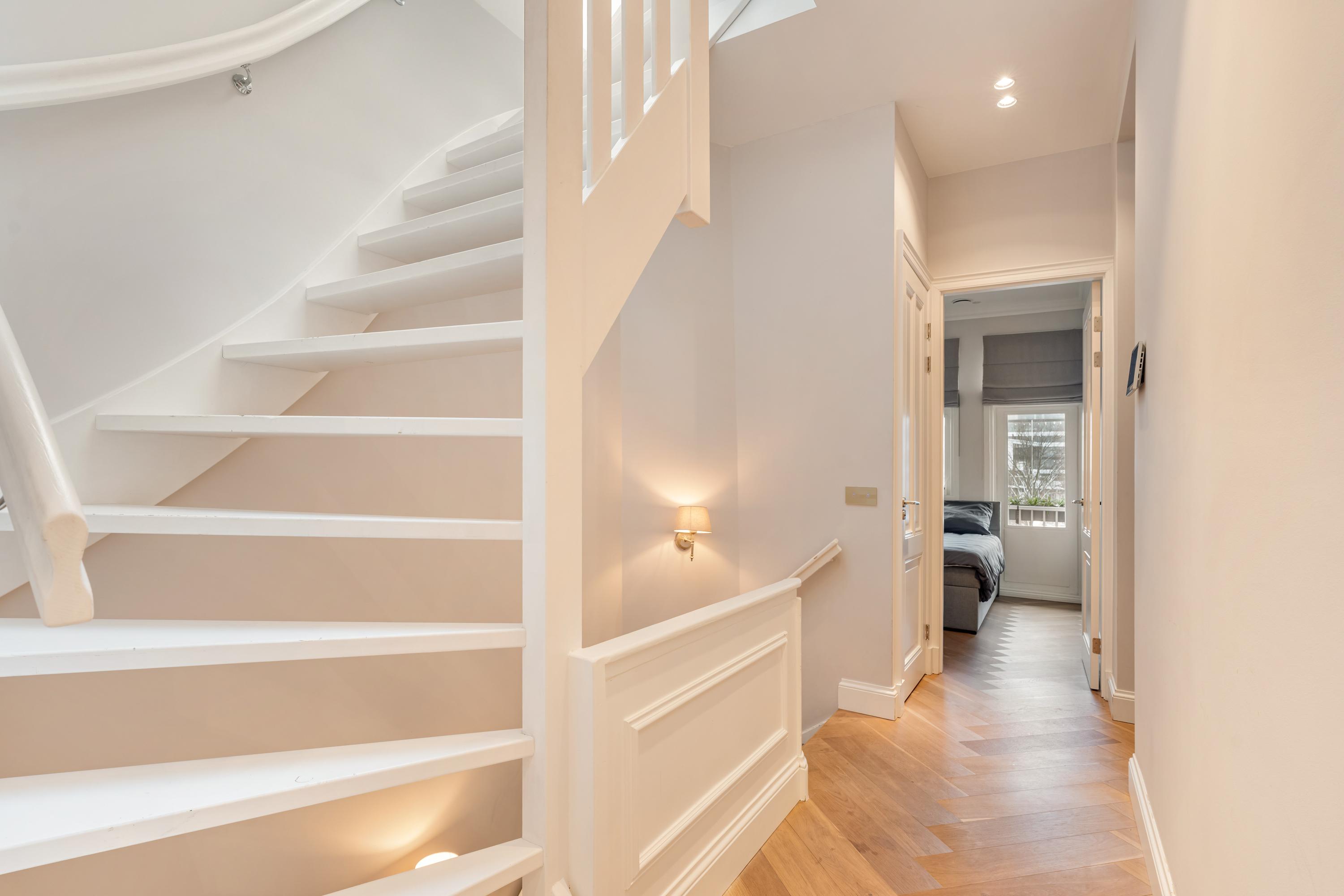 No expense has been spared during the renovation, with high-quality materials used throughout the luxurious finishes. The entire apartment features an oak herringbone floor with underfloor heating and elegant high skirting boards. All rooms are fitted with recessed spotlights, wall lighting, and decorative mouldings.