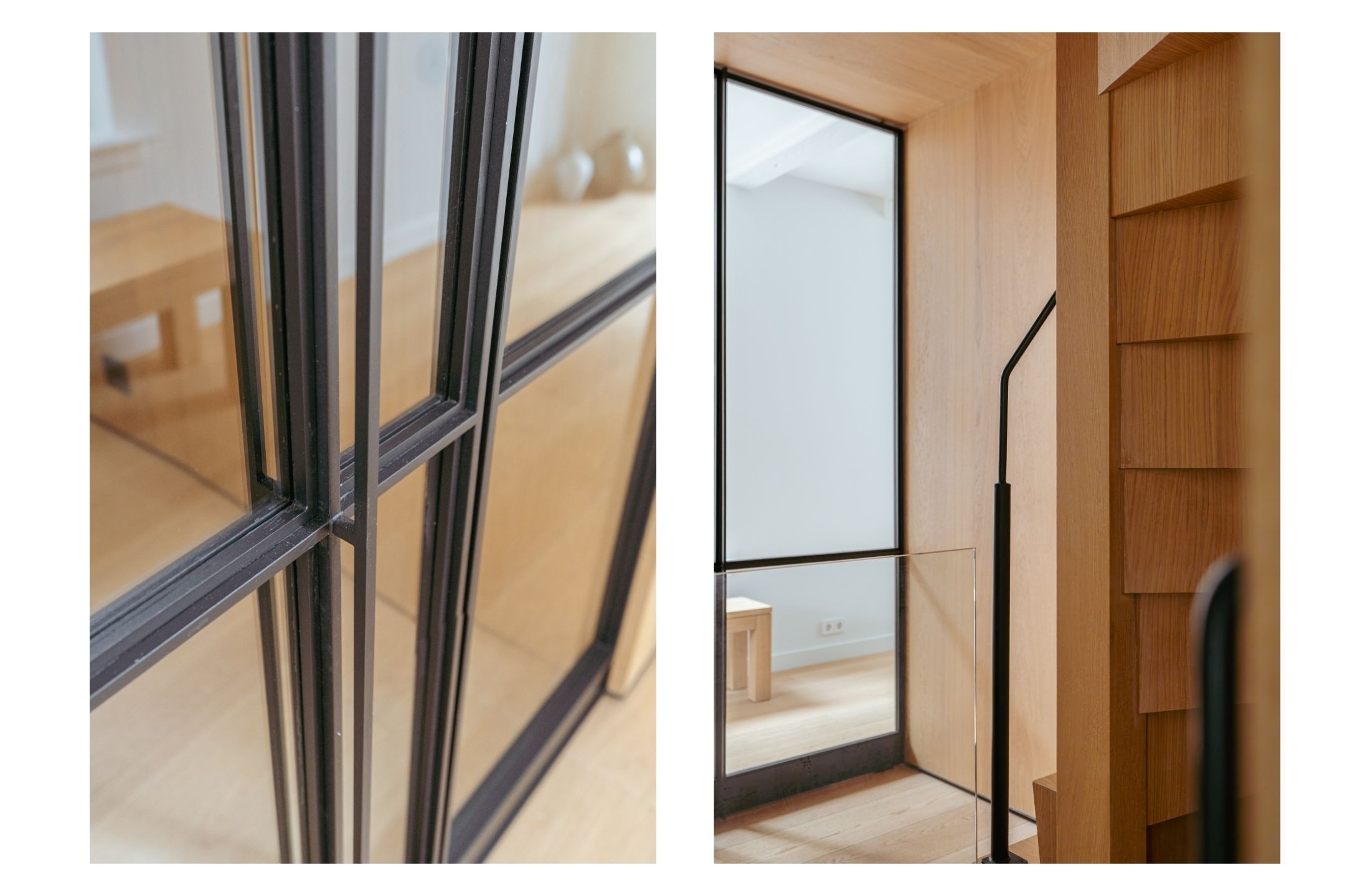 The entrance provides access to both the residence and the multifunctional commercial space on the ground floor. This space is finished with great attention to detail, exuding character through wooden elements, exposed ceiling beams, and high-quality materials. Large double doors at the front can be fully opened, creating an inviting look and allowing for ample natural light. Inside, the space is practical yet stylishly arranged. A compact but luxuriously finished kitchenette, a neat toilet, and a separate laundry and technical room complete this floor. A large skylight at the rear brings in abundant daylight, adding to the open and airy feel. Rear access to a private outdoor space is available, as well as a second entrance directly from the street — providing flexibility for use as a studio, home office, or practice space.