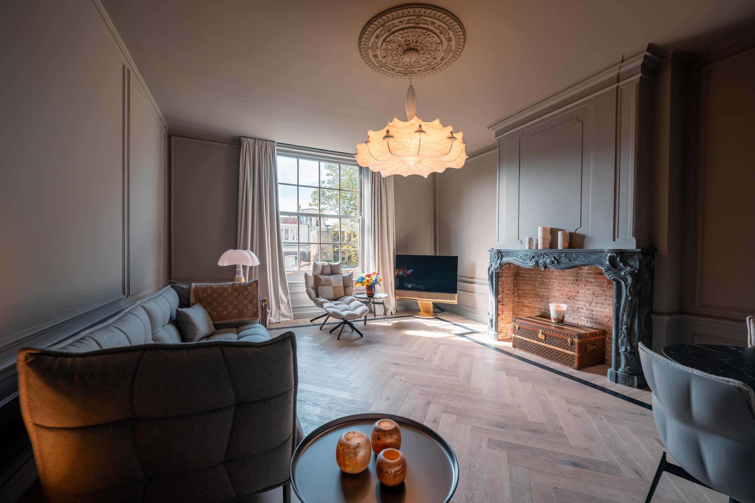 The spacious living room is a true showpiece. The classical stucco, decorative ceiling details, and an elegant ceiling rose give the room extra allure and warmth. At the center stands the (monumental) marble fireplace with open hearth, forming a stylish combination with the sleek, contemporary interior. The herringbone wooden floor with dark inlay emphasizes the length of the room and ties in beautifully with the refined wall finishes.
