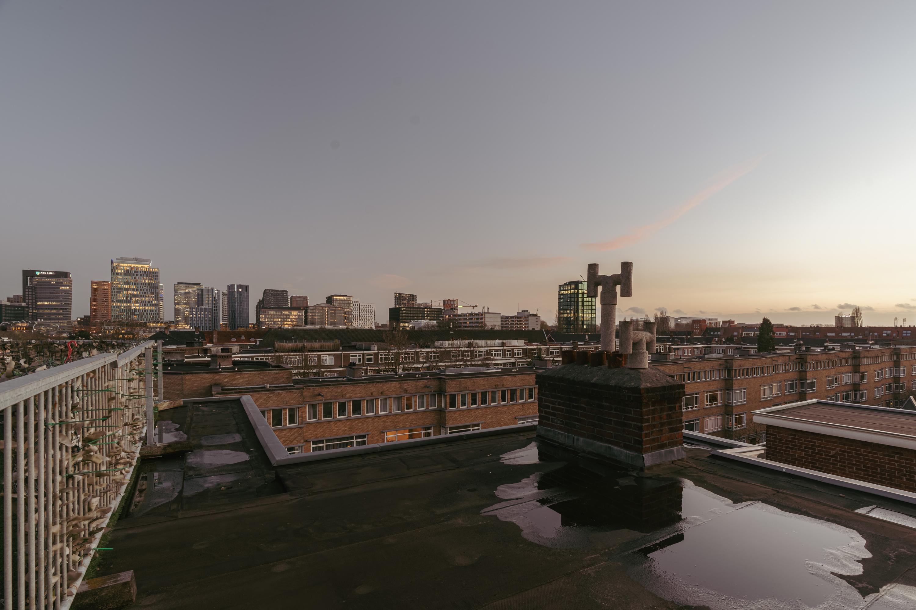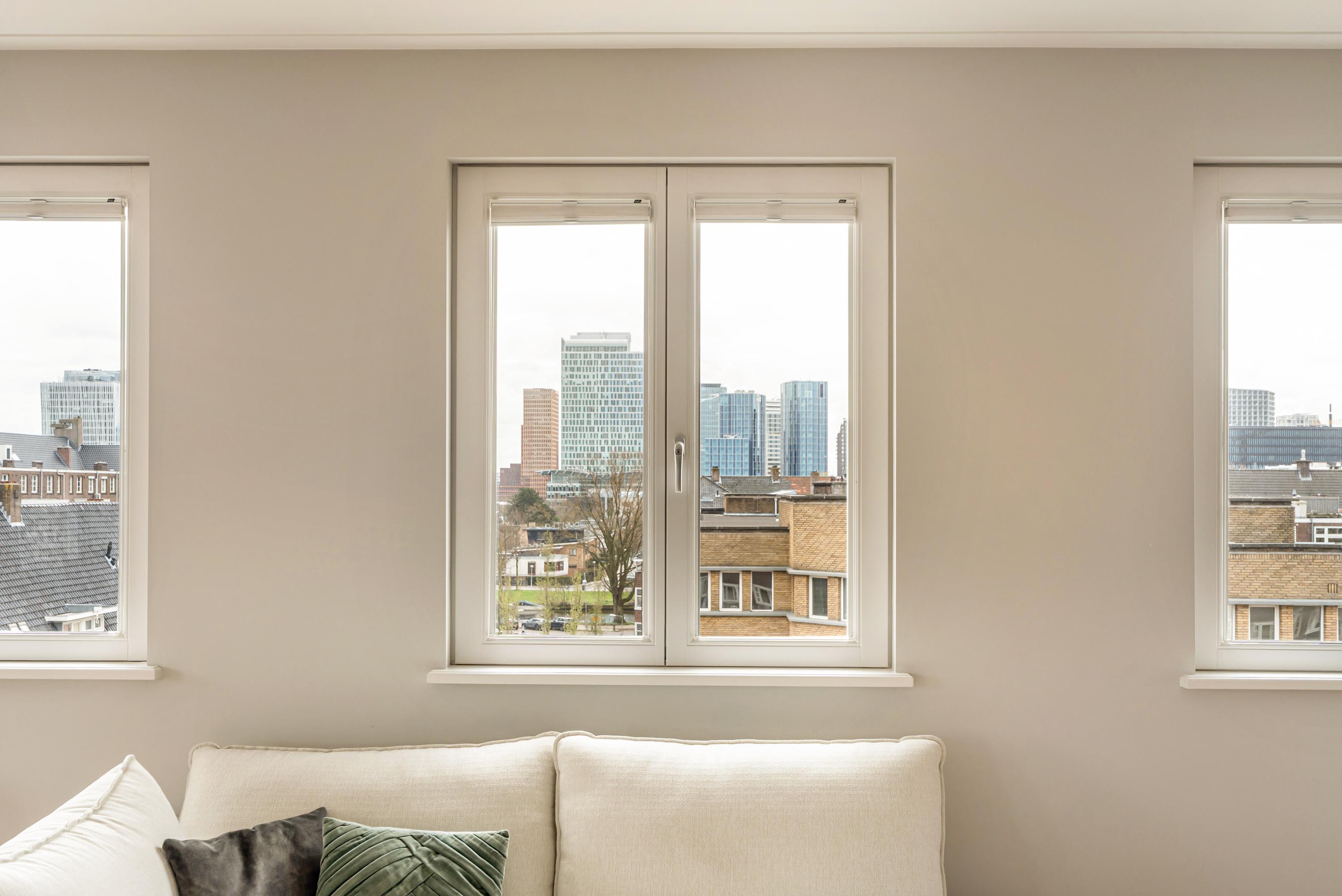 The adjacent living room fully benefits from its corner position and is exceptionally bright thanks to no fewer than eight windows. The unobstructed views over Minervaplein, Michelangelostraat, and the Zuidas skyline are impressive—especially atmospheric in the evening.