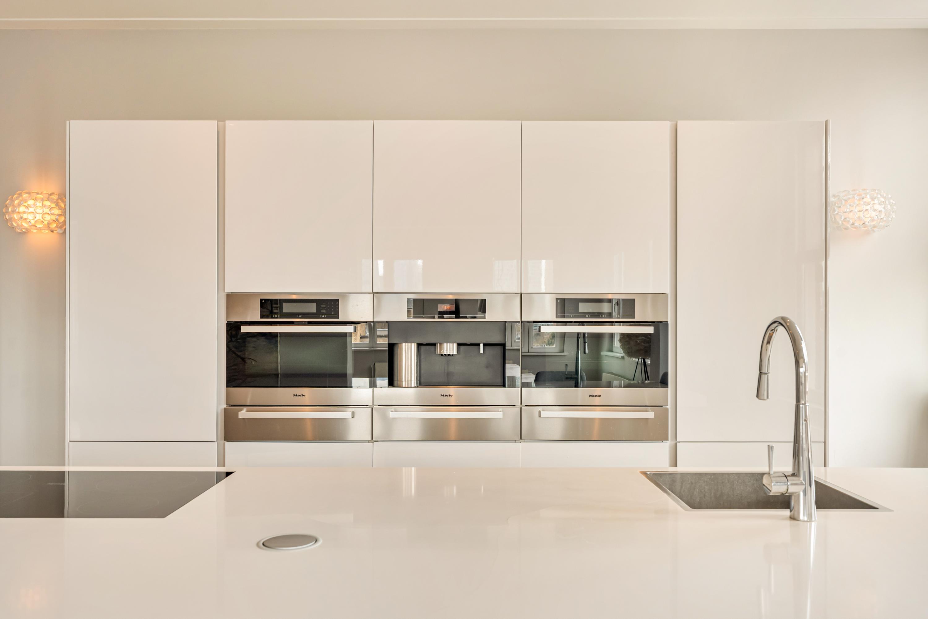 Entrance with wardrobe space leading into a central hallway that connects all rooms. The luxurious open-plan kitchen with cooking island forms the heart of the home and is equipped with high-quality Miele built-in appliances, including an induction hob, (combi) steam oven, convection oven with warming drawers, coffee machine, refrigerator, freezer, dishwasher, and wine climate cabinet. The island also features a comfortable bar seating area.