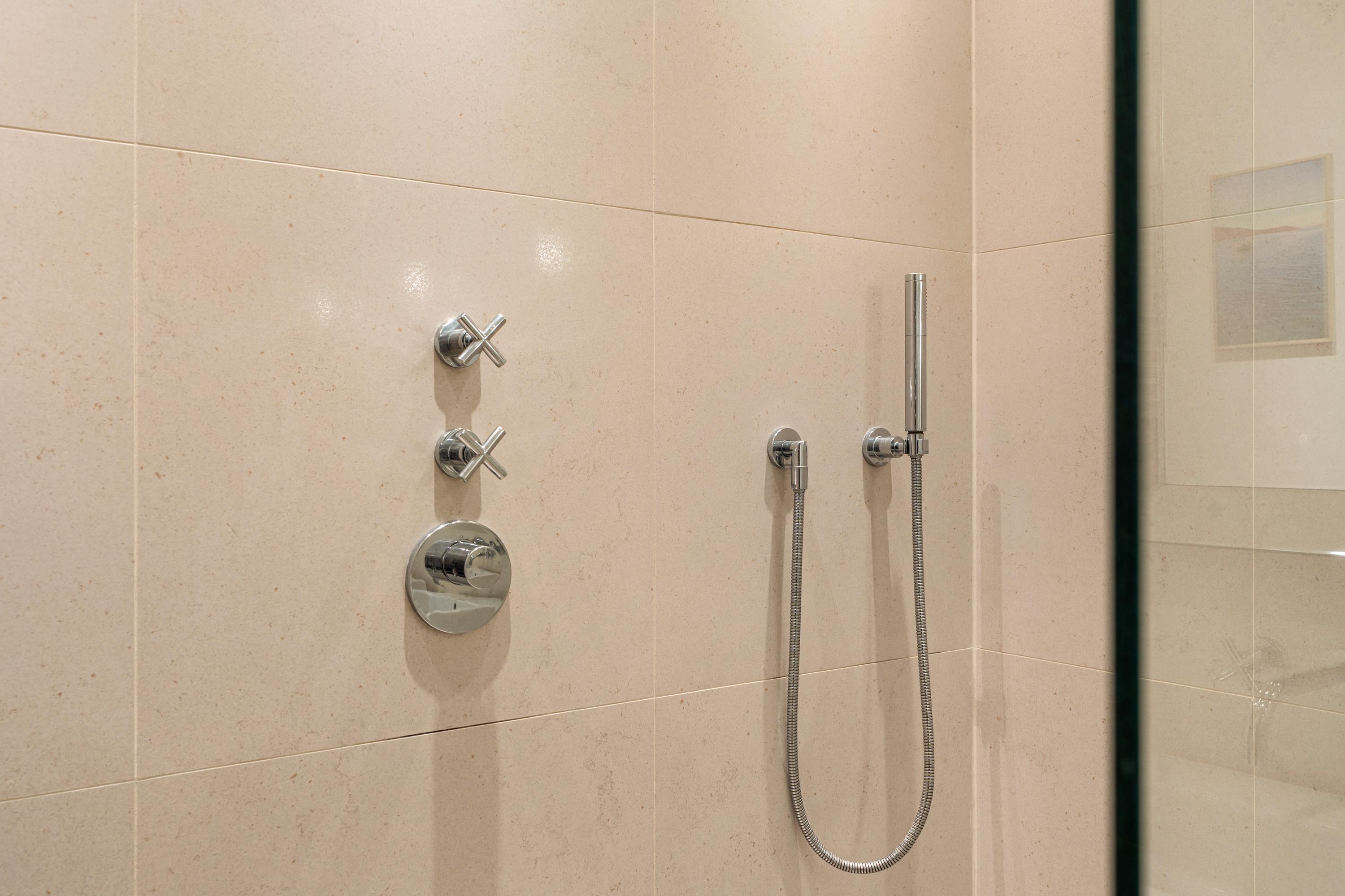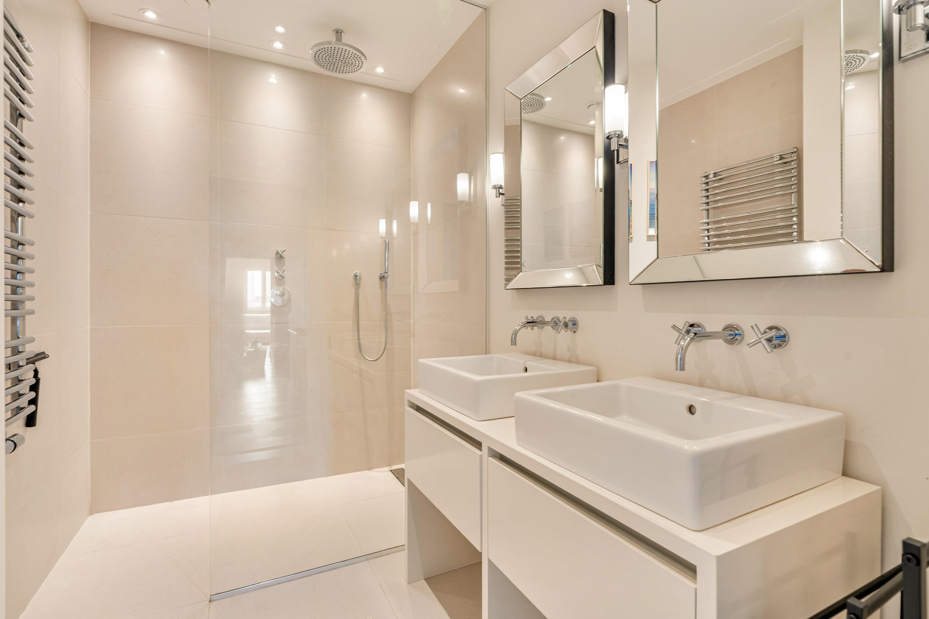 The well-appointed bathroom features a walk-in rain shower, double vanity unit, and underfloor heating.