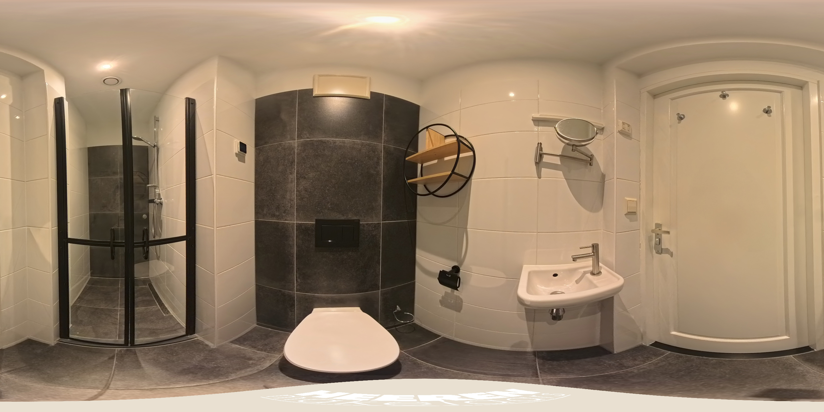 A second bathroom with toilet, sink, and shower is centrally located and accessible from the hall. There is also additional storage space in the form of two built-in cupboards next to the meter cupboard.