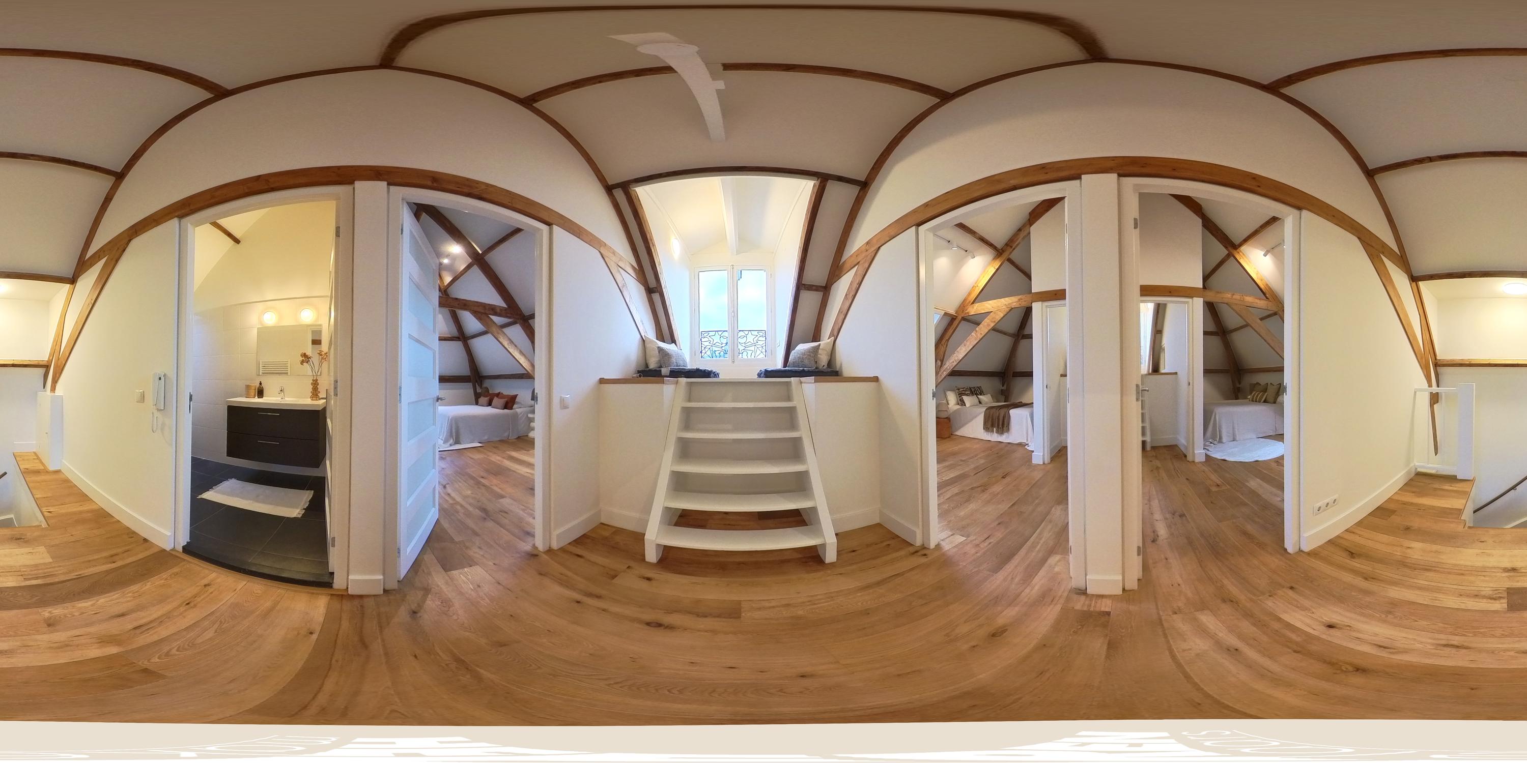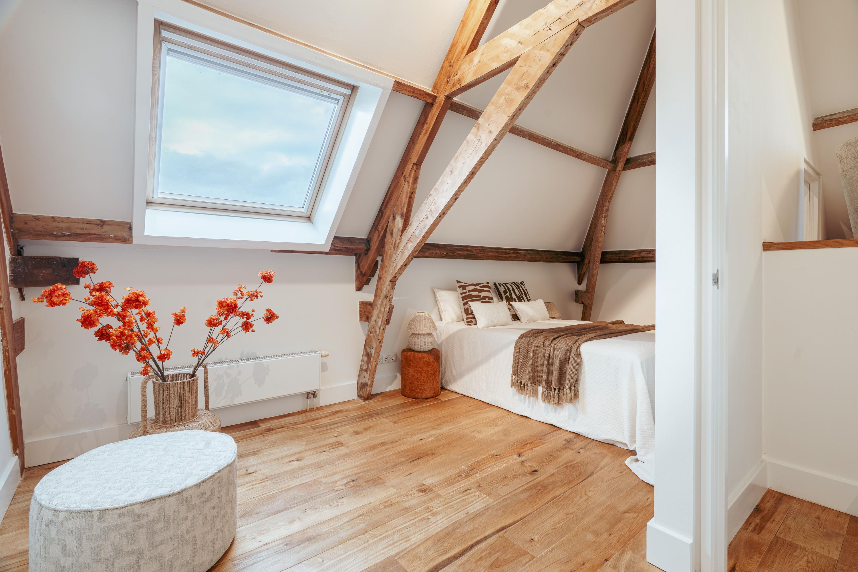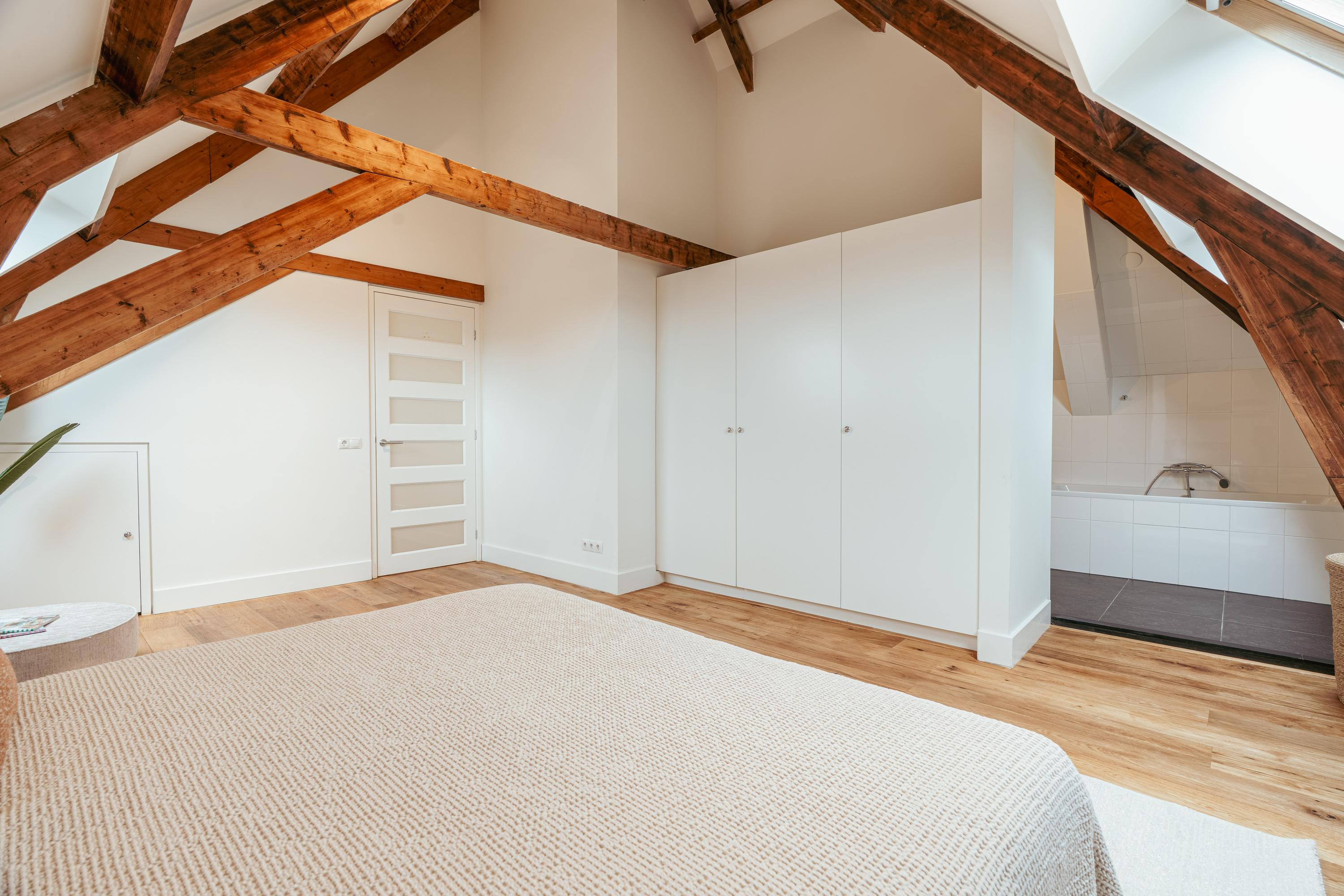 A special and playful feature is the two mezzanines between the rooms — inviting spots for reading or enjoying a cup of coffee. Under these mezzanines are integrated storage cupboards. A small portion of this floor has a ceiling height below 1.5 metres, fitting with the characteristic roof shape. Throughout all rooms, authentic beams remain visible, contributing to the charm of the home.