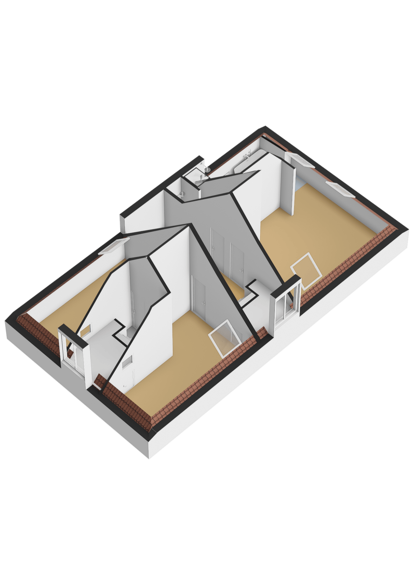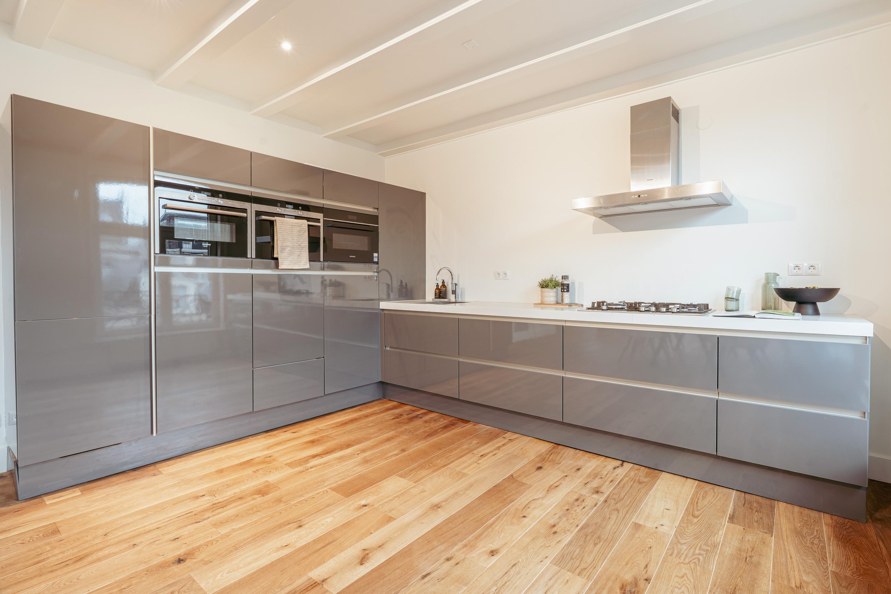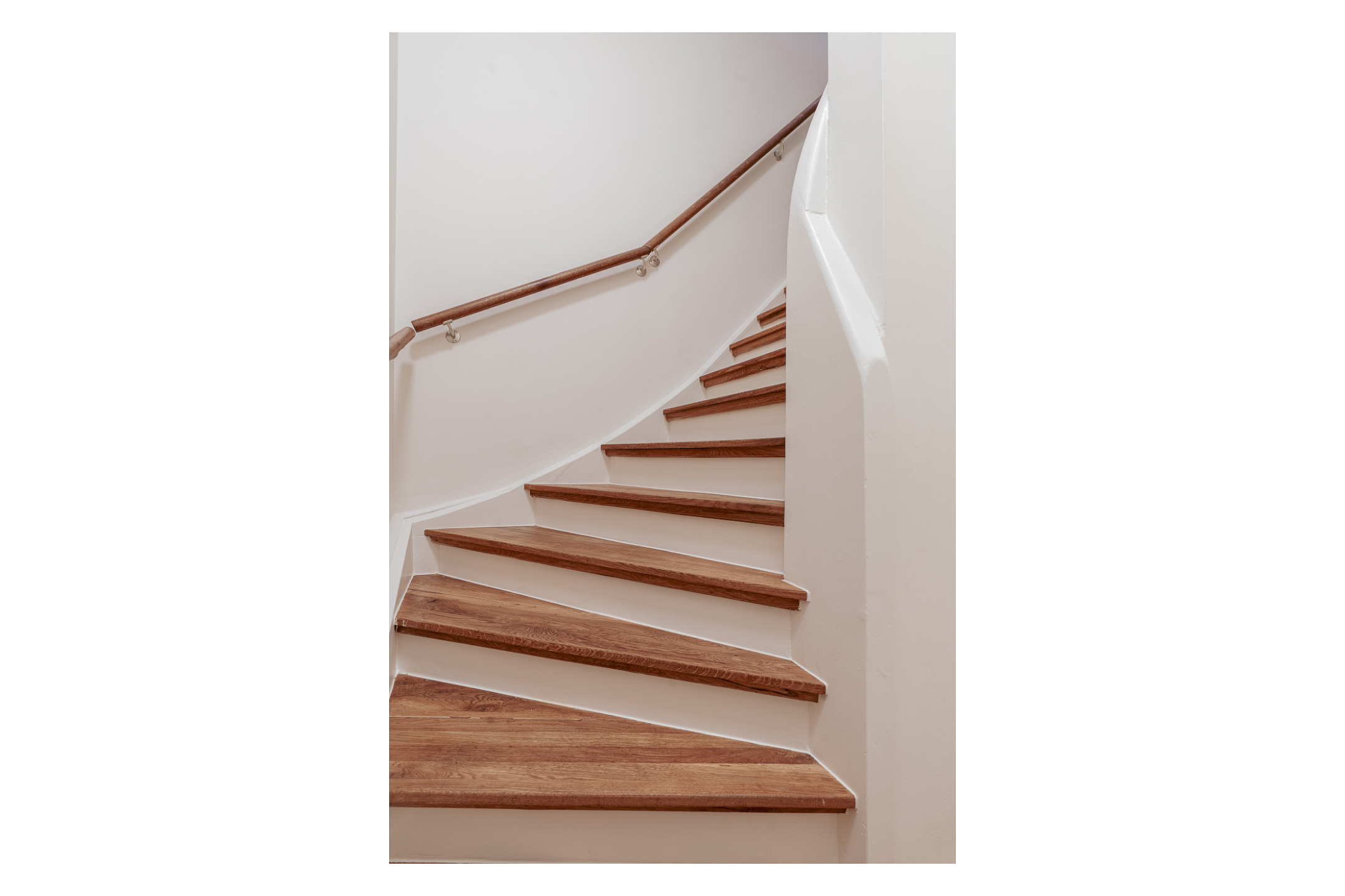 A special and playful feature is the two mezzanines between the rooms — inviting spots for reading or enjoying a cup of coffee. Under these mezzanines are integrated storage cupboards. A small portion of this floor has a ceiling height below 1.5 metres, fitting with the characteristic roof shape. Throughout all rooms, authentic beams remain visible, contributing to the charm of the home.