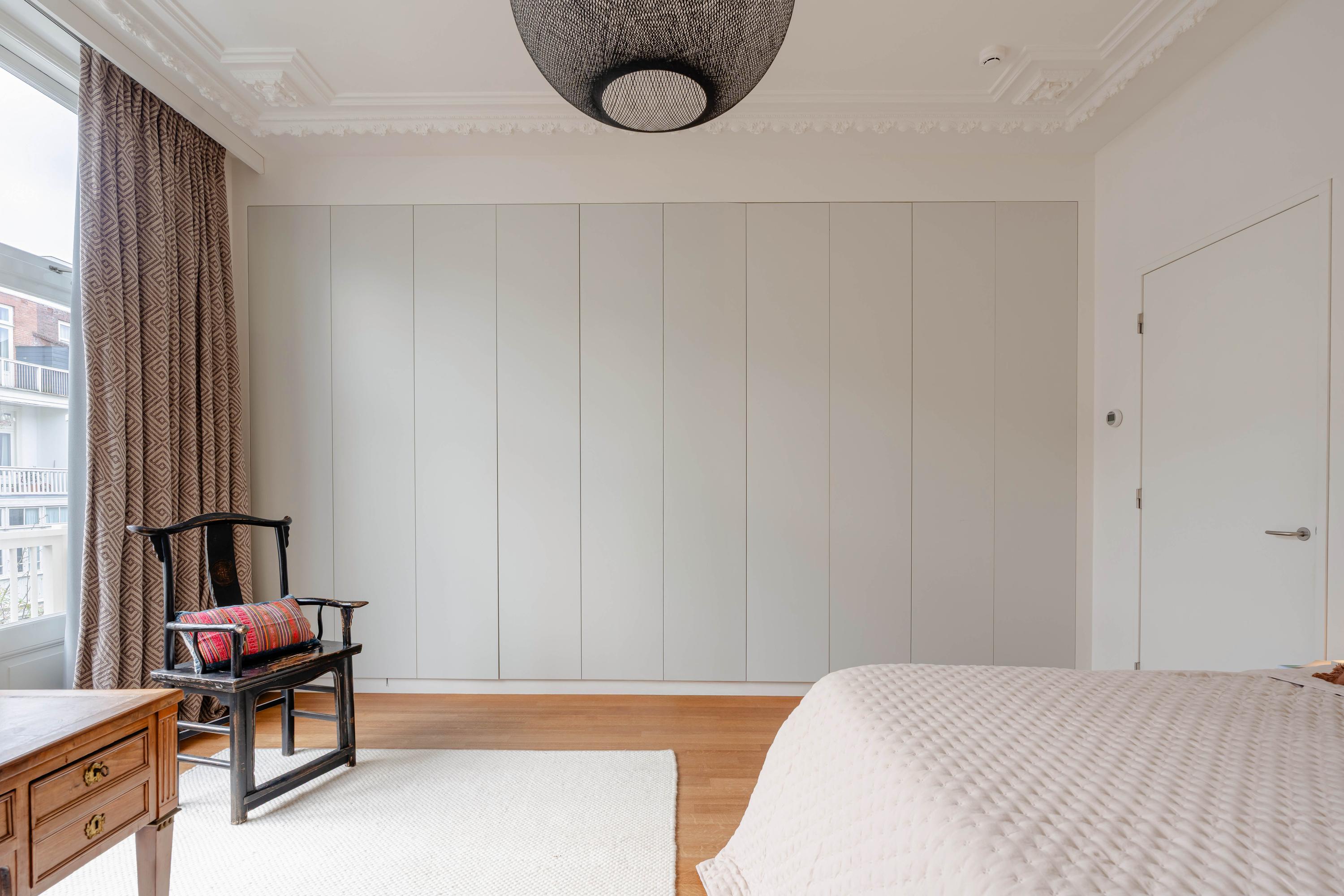 At the heart of the space is a large kitchen island with an inviting bar setup. Adjacent to the kitchen is a practical pantry, suitable for storing appliances and provisions. French doors provide access to the covered terrace and the sunny south-facing garden. The garden forms a natural extension of the kitchen, allowing you to enjoy a spacious and atmospheric living area during the summer months. Additionally, built-in cupboards and a separate toilet are present. The modern finish of the kitchen contrasts beautifully with the more classical elements found on the other floors.