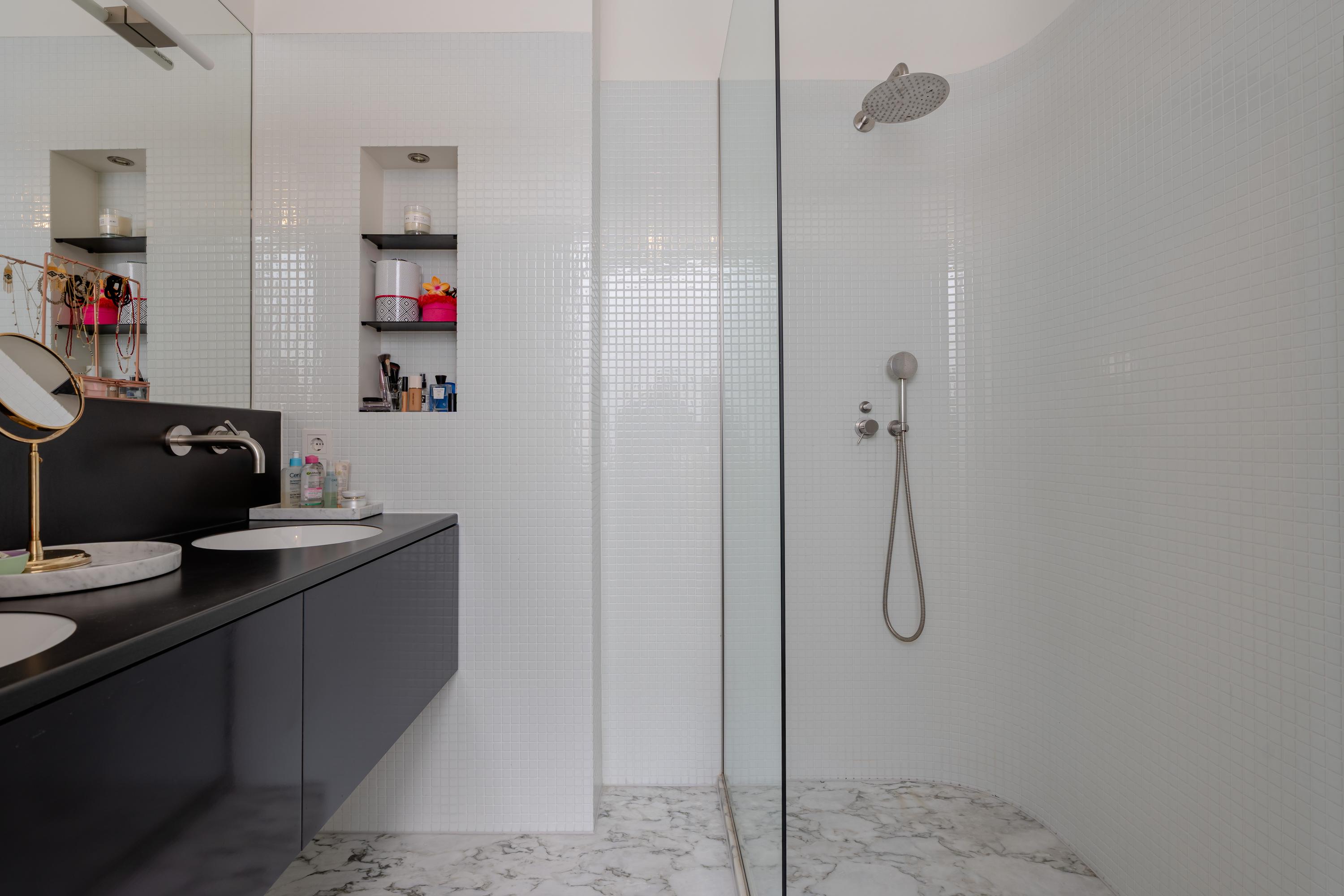 The second floor comprises two generously sized bedrooms. The master bedroom is located at the rear and features built-in wardrobes, French doors opening onto a balcony, and air conditioning. The second bedroom is situated at the front and also has access to a balcony. Centrally located on this floor is the luxurious bathroom, equipped with a bathtub, walk-in shower, and a double vanity unit. Original ornamental details have also been preserved on this level.