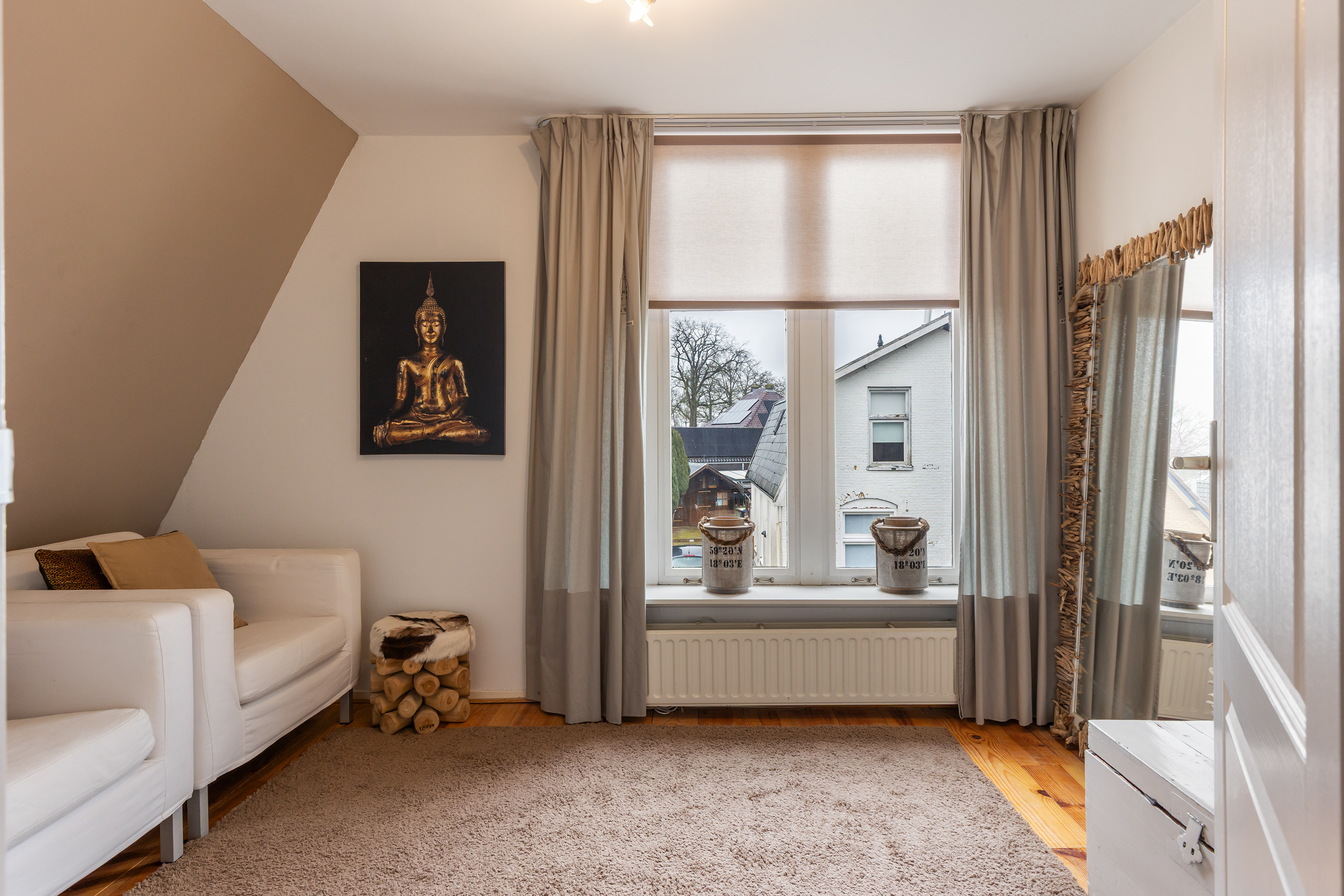 Behind a door there is a room with dormer window currently arranged as a lounge area. At the rear of the property there are two further spacious bedrooms of approximately 16 m² each. Both rooms have their own door leading onto the roof terrace. A practical walk-in closet is also located on this floor.
