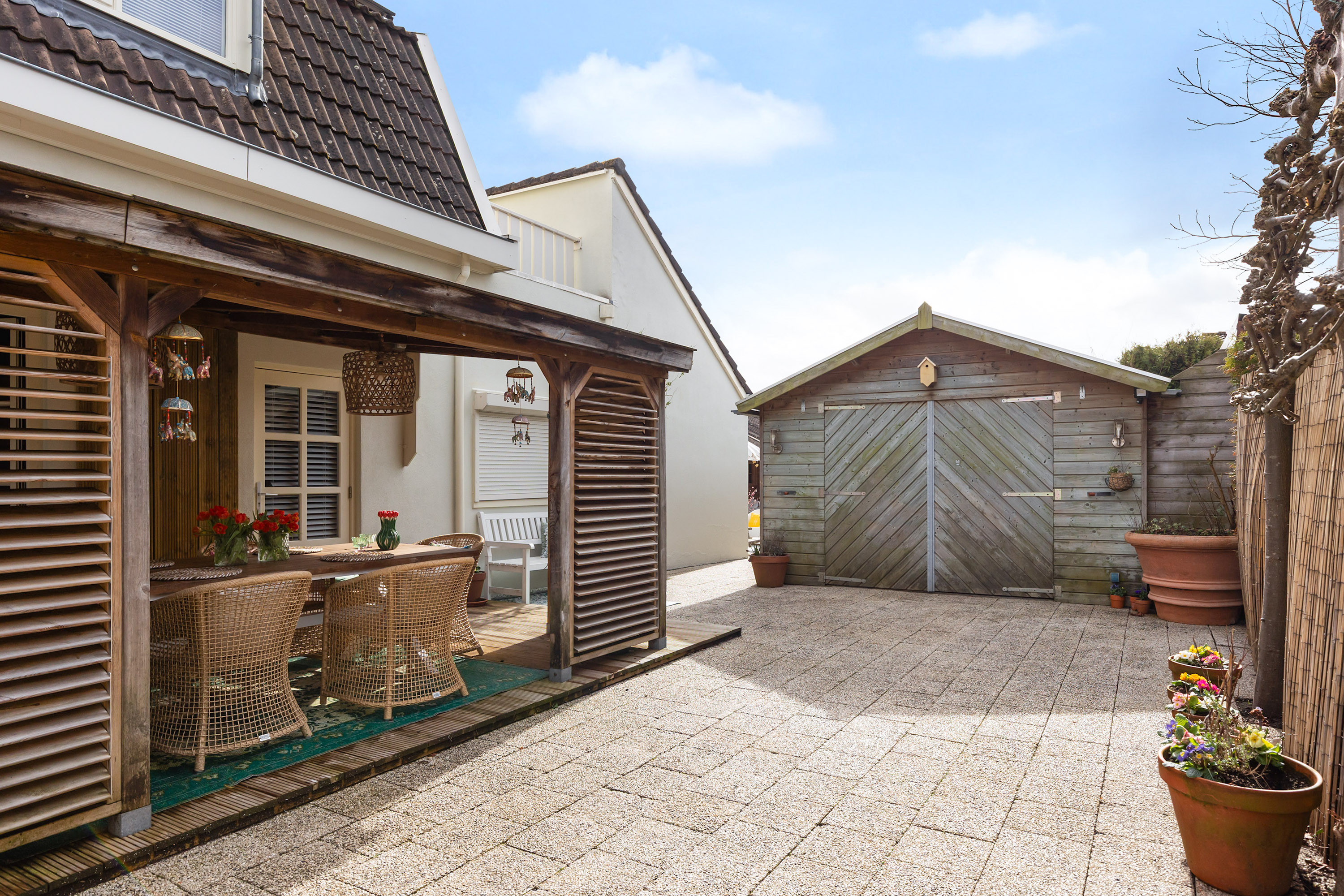 The second wooden outbuilding includes a covered veranda and offers approximately 28 m² of space. Together this forms an attractive and versatile outdoor area with many possibilities for relaxation, hobbies or storage.