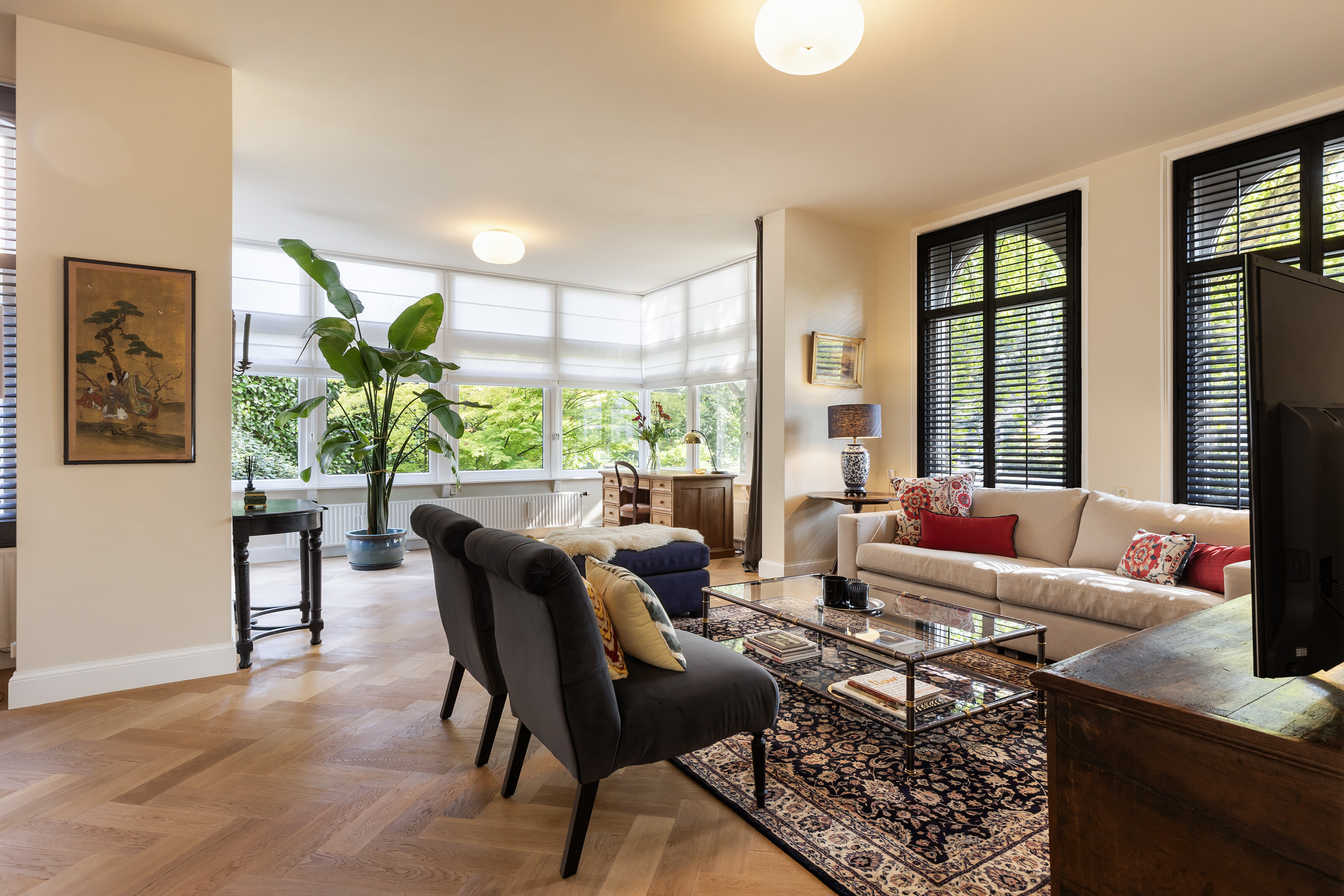 The spacious living room, with high decorative ceilings and large arched windows, exudes elegance and character. The sitting area offers views over the Oranjepark, while the bright conservatory with French doors to the garden provides a perfect spot to unwind. The combination of authentic details and black shutters creates a tasteful balance between light and privacy.