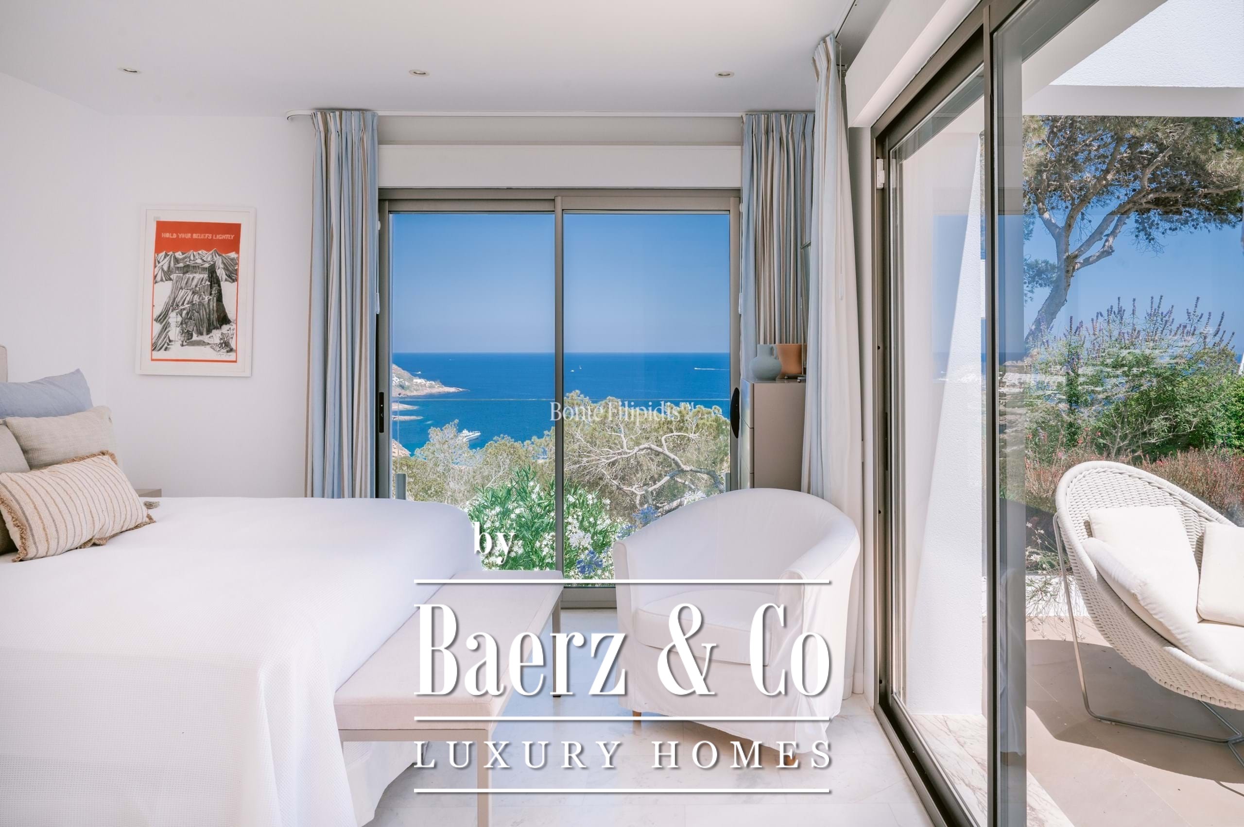 The upper level hosts a refined primary suite with a walk-in wardrobe, spa-inspired bathroom, and a private terrace overlooking the sea. Five guest bedrooms open directly to the pool deck, offering privacy and easy access to outdoor living.