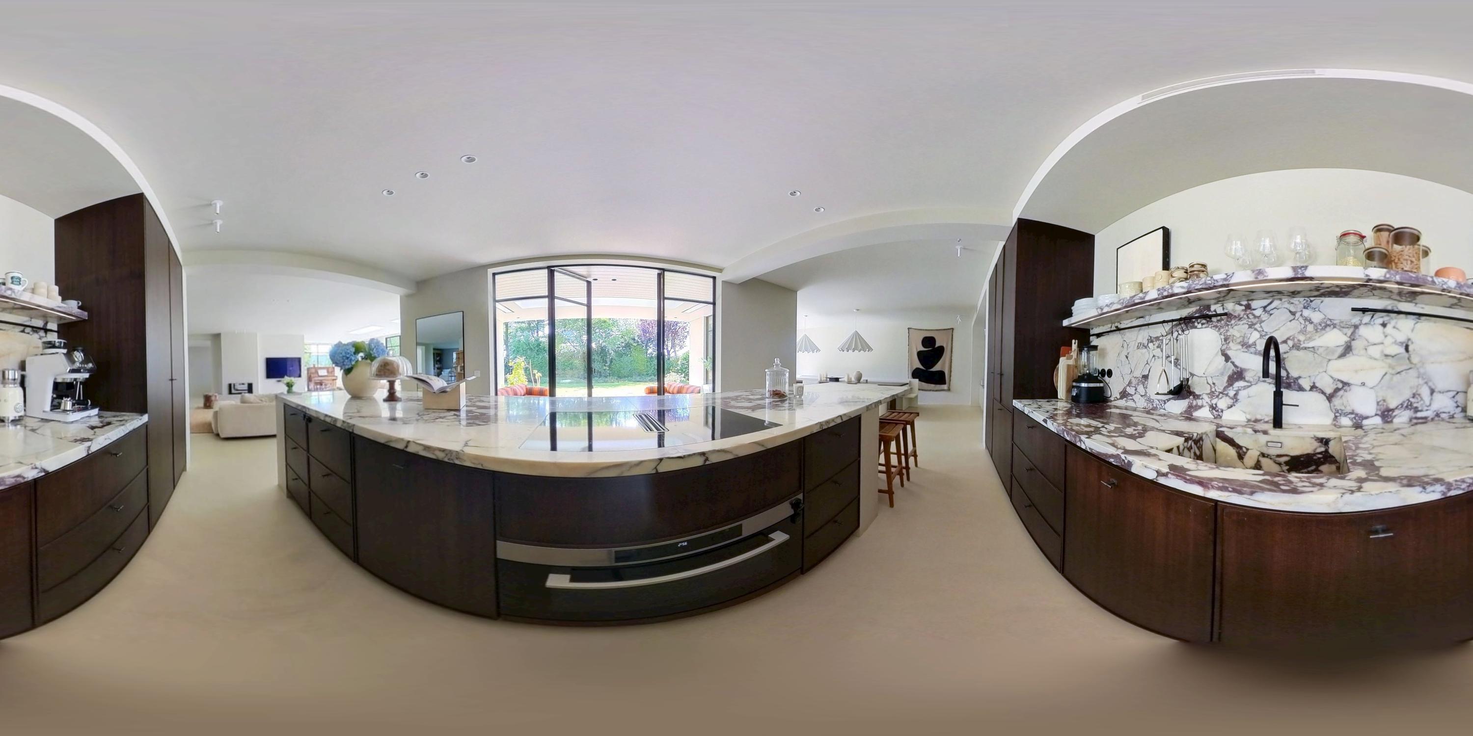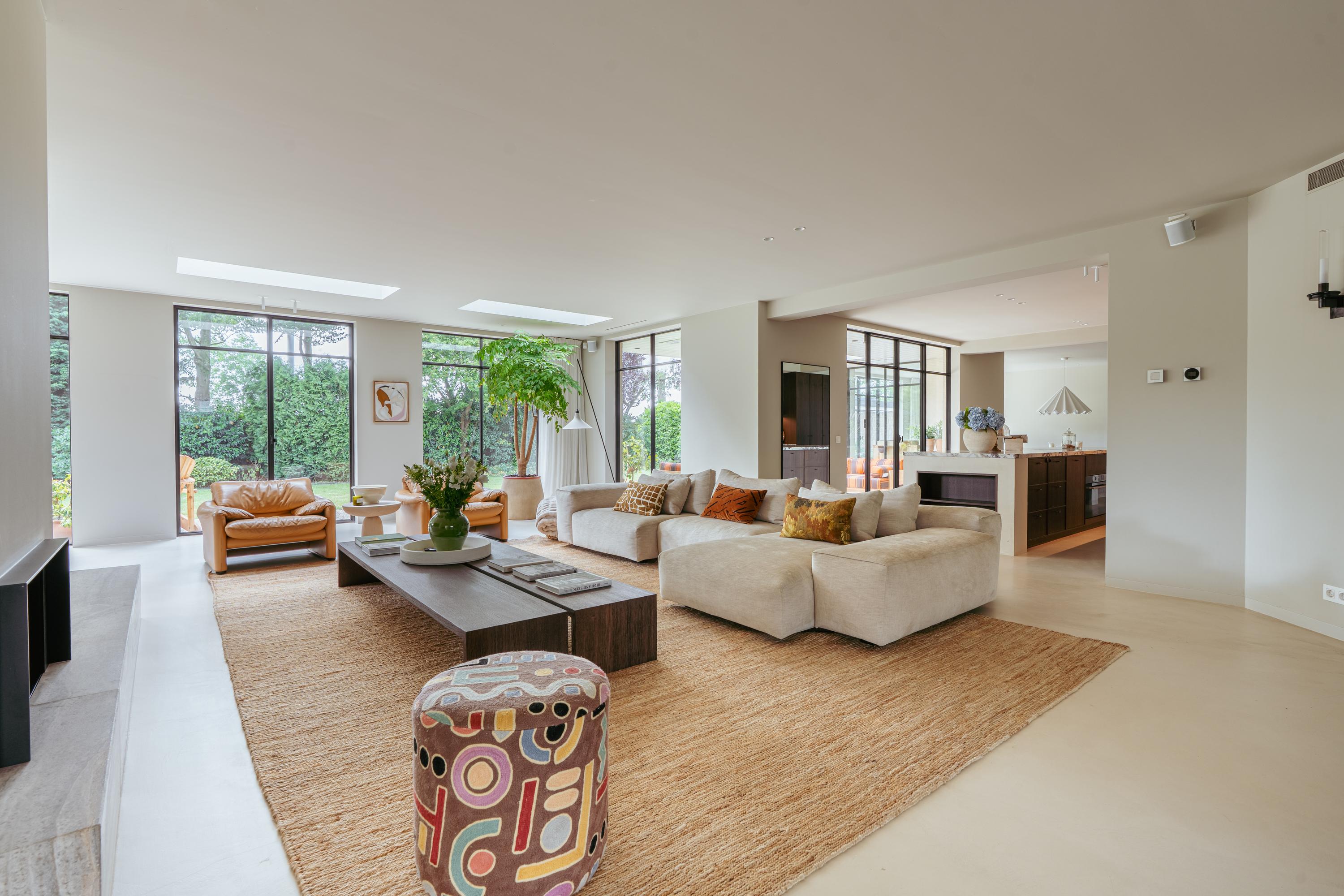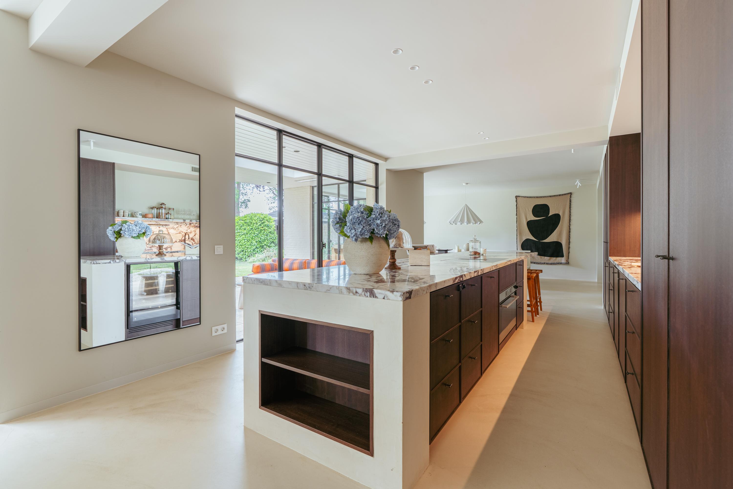 The expansive living room, featuring floor-to-ceiling windows and a stunning round bay window, is bathed in natural light, instantly creating a sense of space and tranquillity. The elegant fireplace forms a central feature of the open-plan living area, which flows seamlessly into the luxurious kitchen. The kitchen is equipped with high-end built-in appliances and modern conveniences, including a generous island of approx. 5 metres, Quooker tap, dishwasher, fridge/freezer combination, and an induction hob with integrated extractor. The exclusive book-matched marble worktop extends into the sink, giving the kitchen a refined and sophisticated finish. French steel doors open onto the delightful covered terrace and beautifully landscaped garden. Adjoining the kitchen is the spacious dining room.