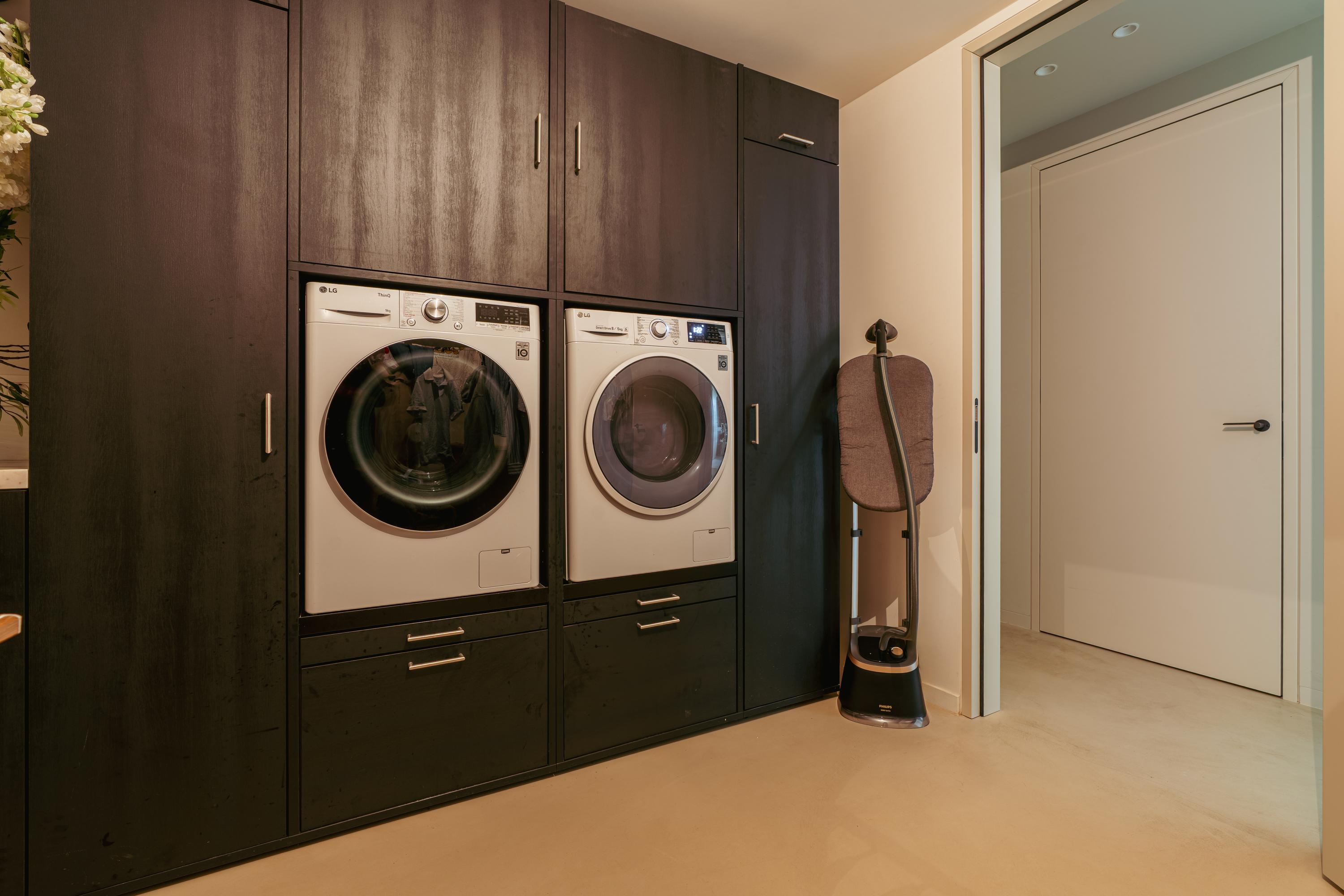 The elegant front garden leads to the impressive hallway, which provides access to all rooms on the ground floor. Immediately to the right is the spacious internal storage room housing the central heating system, laundry chute, water softener, and the home automation controls. Opposite, you will find a built-in cupboard and adjacent to it, the garage—currently set up as a fitness room. To the left of the hallway is a large guest WC with washbasin.