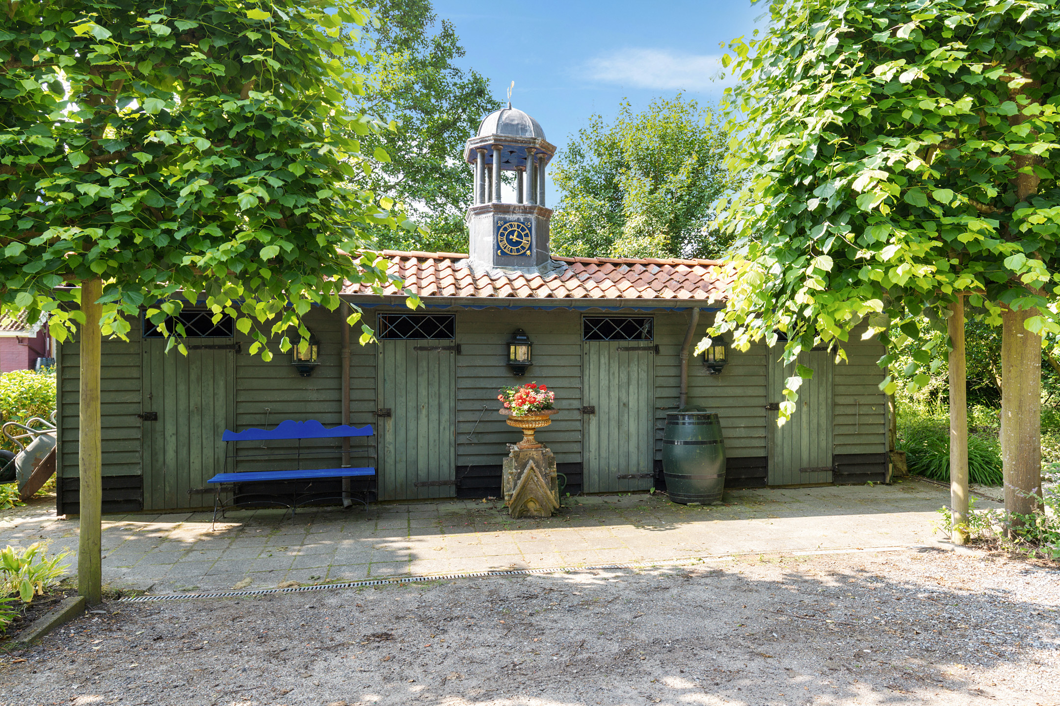 The elegant outbuilding, featuring long semicircular windows, offers stunning views of the garden. Currently used as office space, it is connected internally to a heated garage with loft, kitchenette, and toilet.
