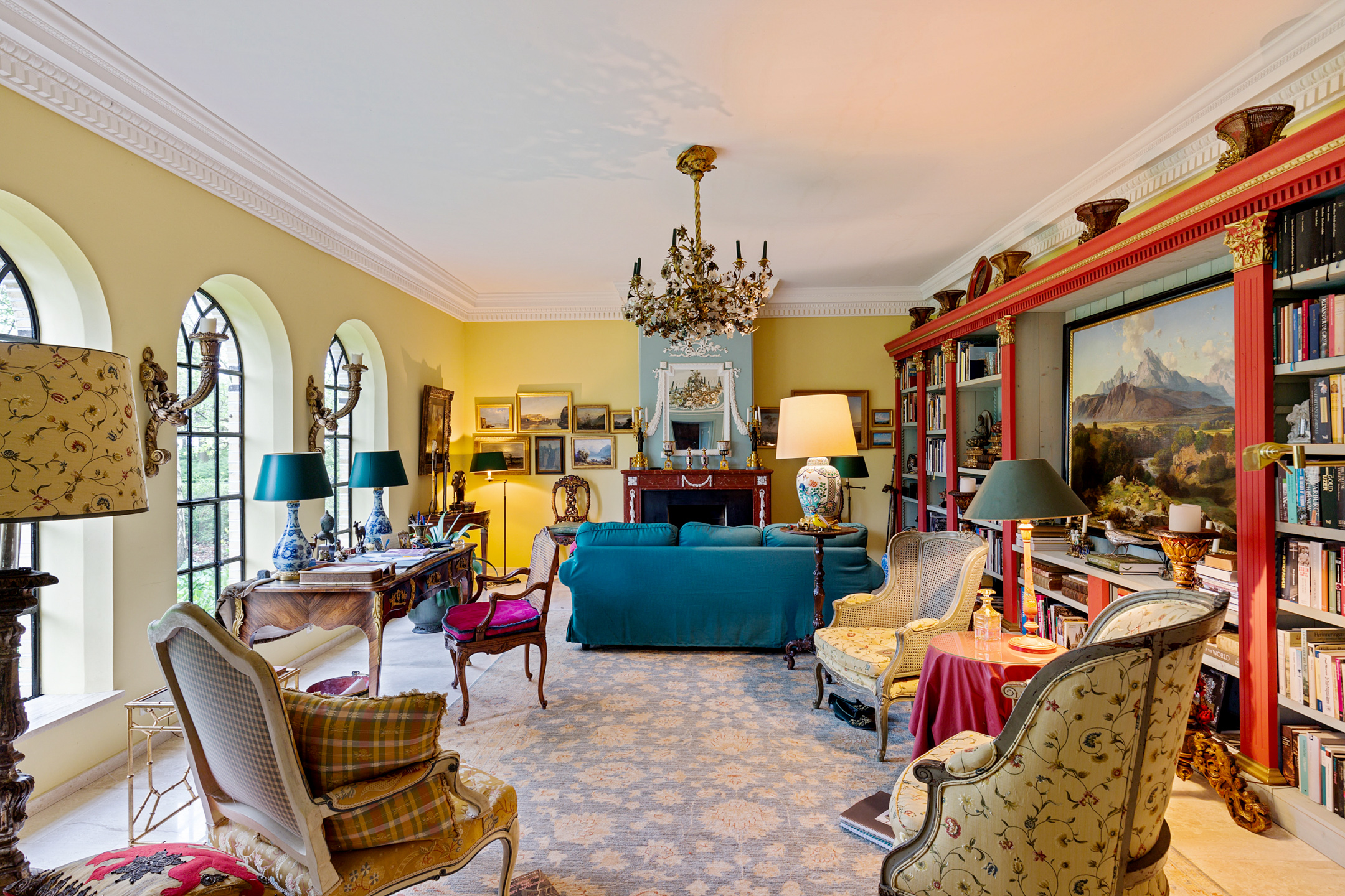 The sitting room and conservatory showcase unique period details, including a marble fireplace from an Amsterdam canal house (circa 1740) and French doors opening onto the garden. Beneath the conservatory lies a hidden wine cellar with an electric hatch, laid with 18th-century tiles, 17th-century oak wine racks, and original cabinet doors.