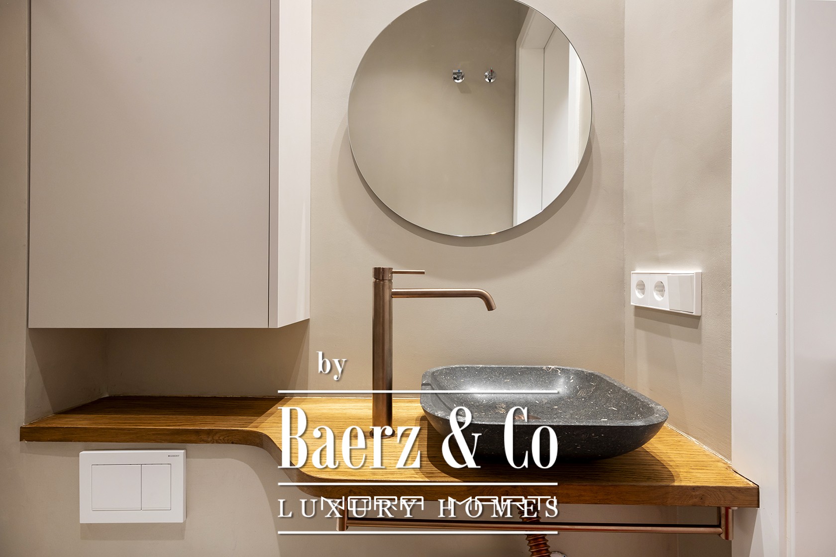 The apartment offers two well-proportioned bedrooms and two bathrooms, with an internal layout that instills a sense of openness and clarity. Restored galleries and windows shape the living experience, drawing in natural light and animating each space with warmth and rhythm throughout the day. Every lighting element has been chosen following an architectural light study, fostering a quietly sophisticated ambience from dawn to dusk.