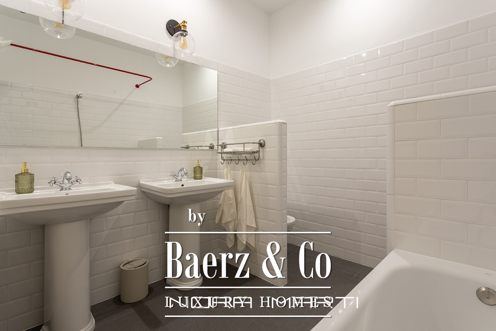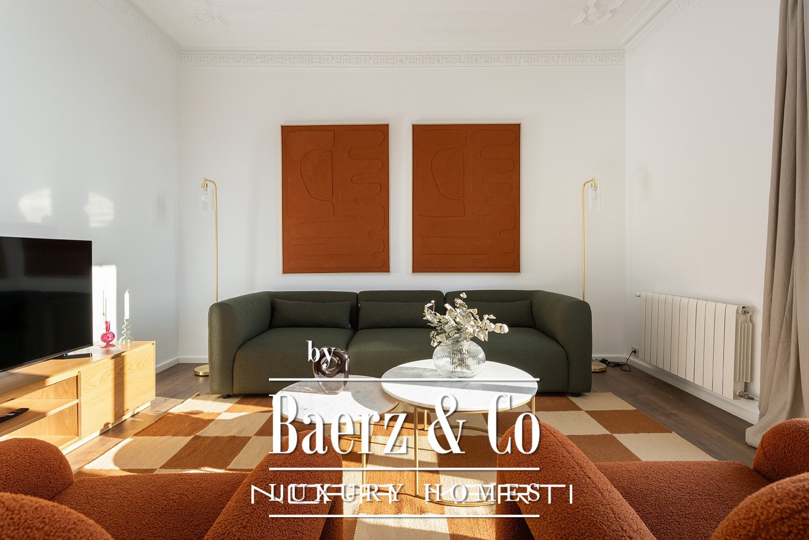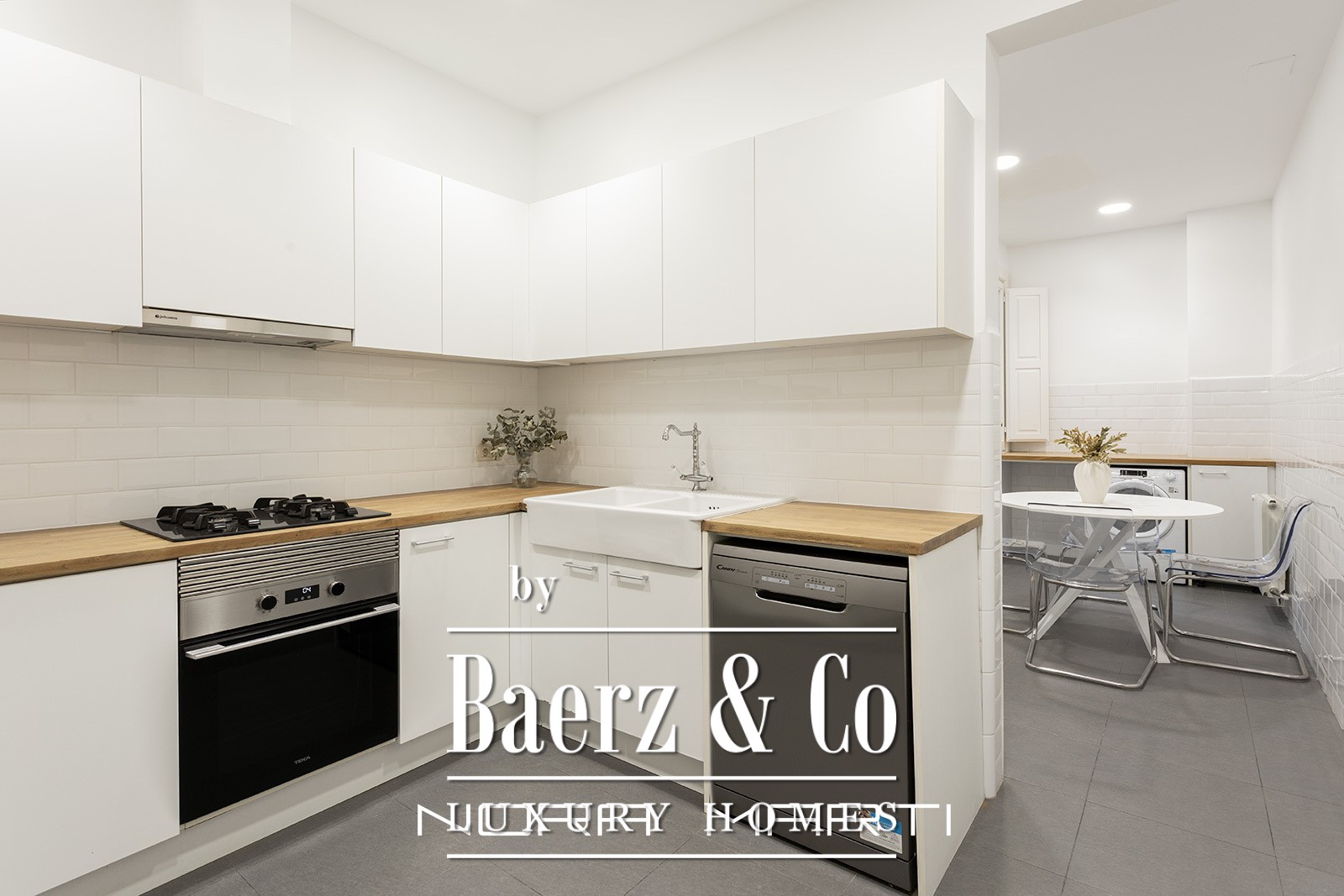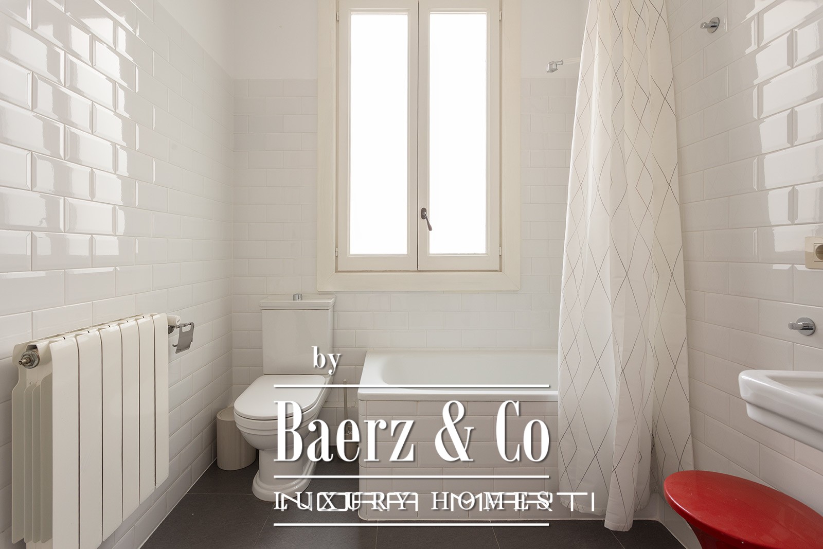 The 152 m² apartment has been extensively renovated, bringing contemporary sensibility to historic bones. Inside, refined modern furnishings lend clarity and cohesion, setting the tone for discreet urban living. The layout features three bedrooms, including one double and two singles, and two bathrooms, creating a balance of private and social spaces. The living room’s tall windows, characteristic of its era, saturate the interiors with natural light, enhanced by a favorable orientation and the warmth of parquet floors. A fully equipped kitchen with a breakfast area adds comfort to the daily rhythm.