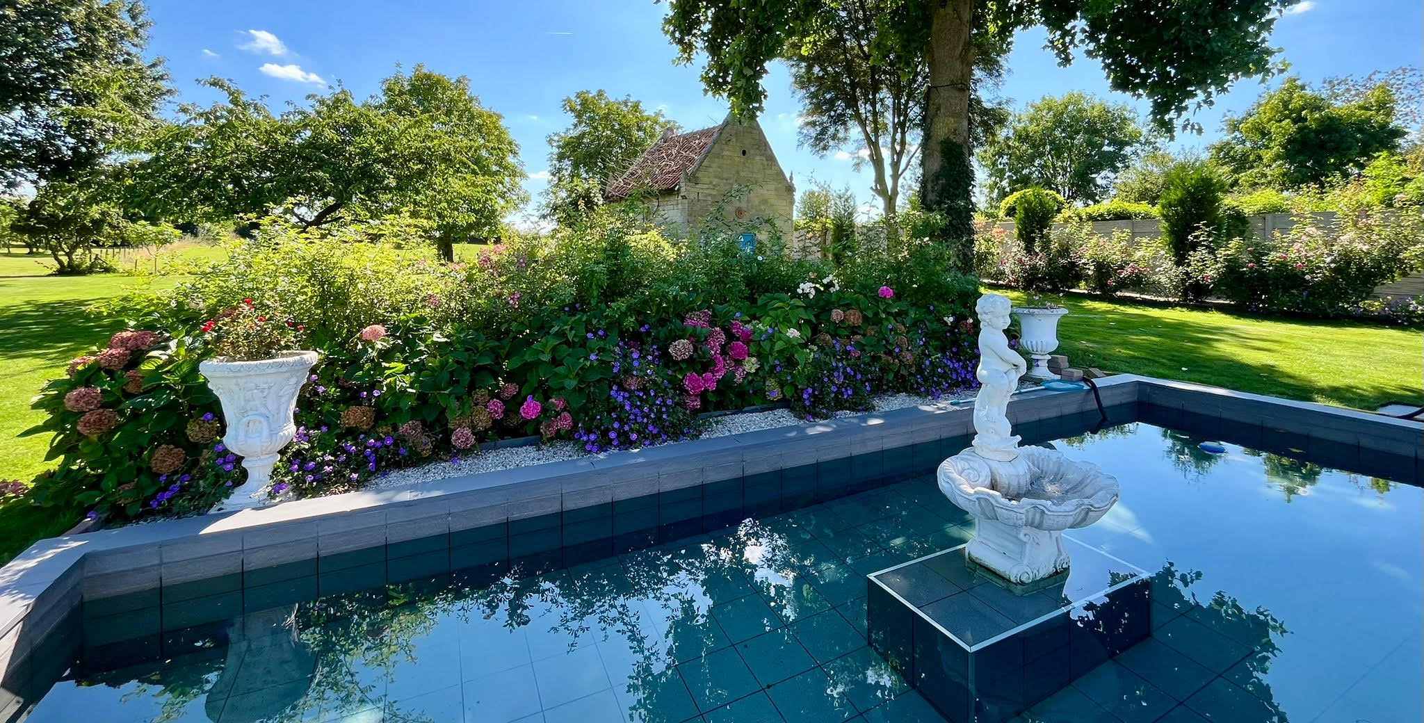 • native plant garden (roses intenational cultivars, hydrangeas, various trees and conifers) an exclusive landscaped garden design with a vibrant play of colors