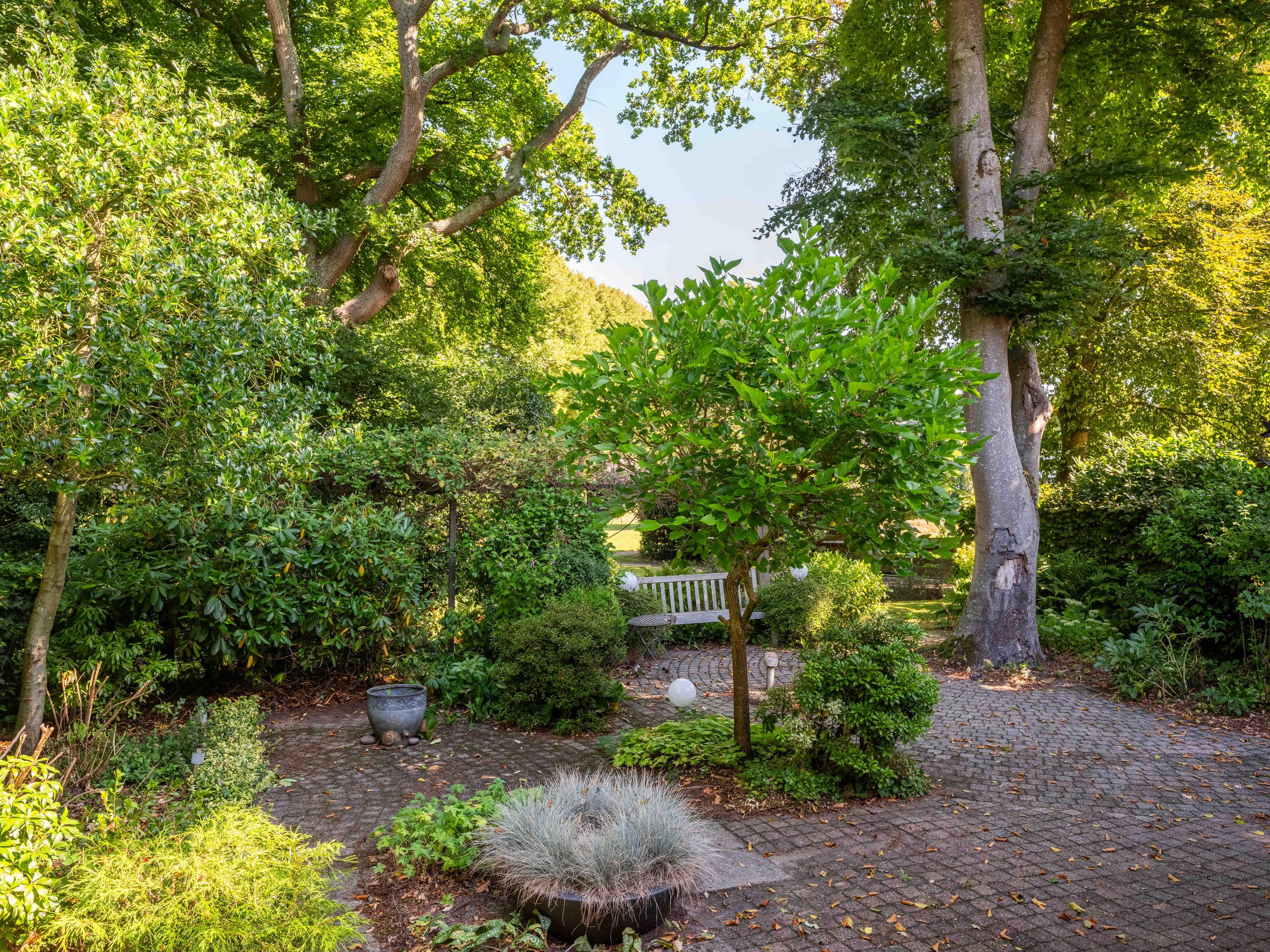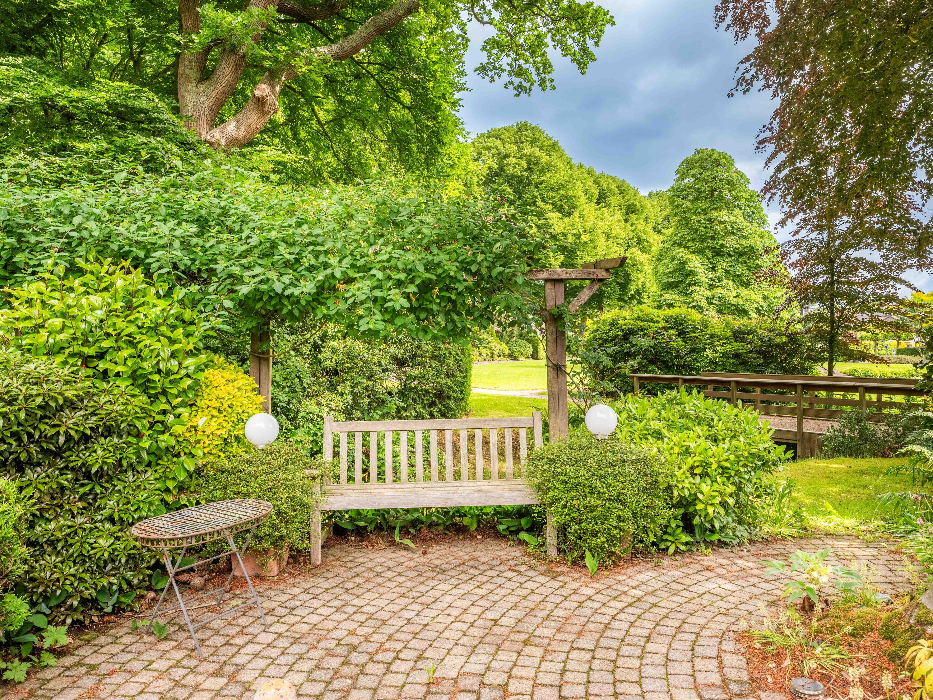 The garden is equipped with a sprinkler system and garden lighting.
