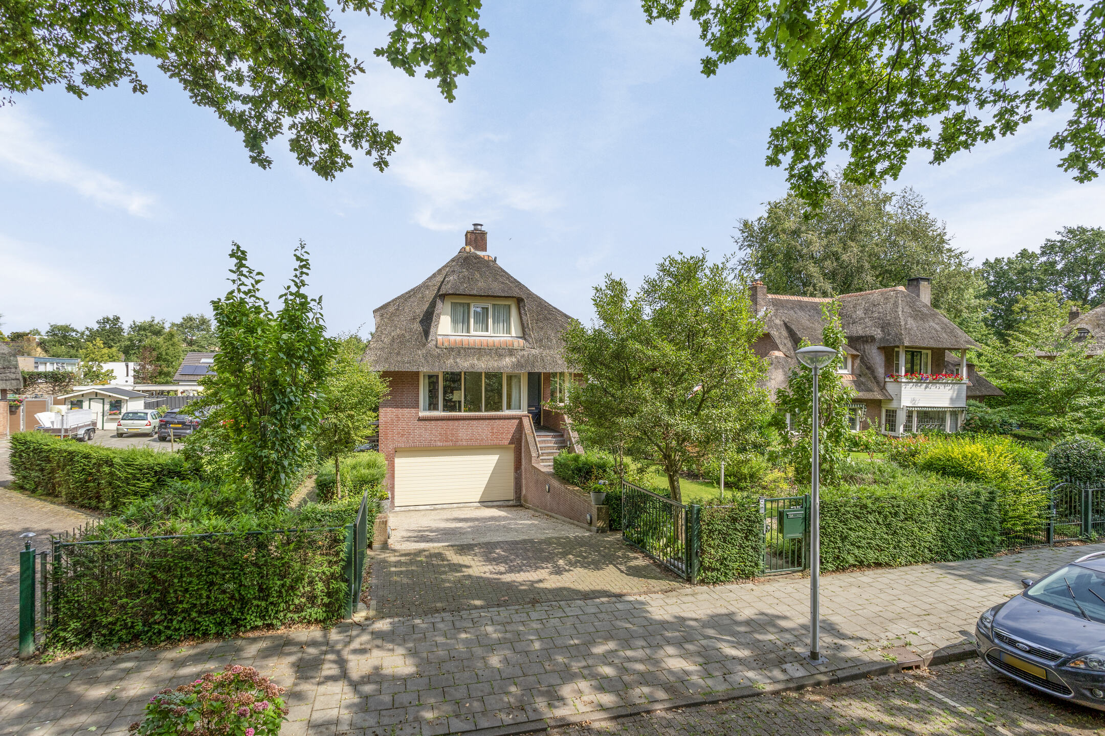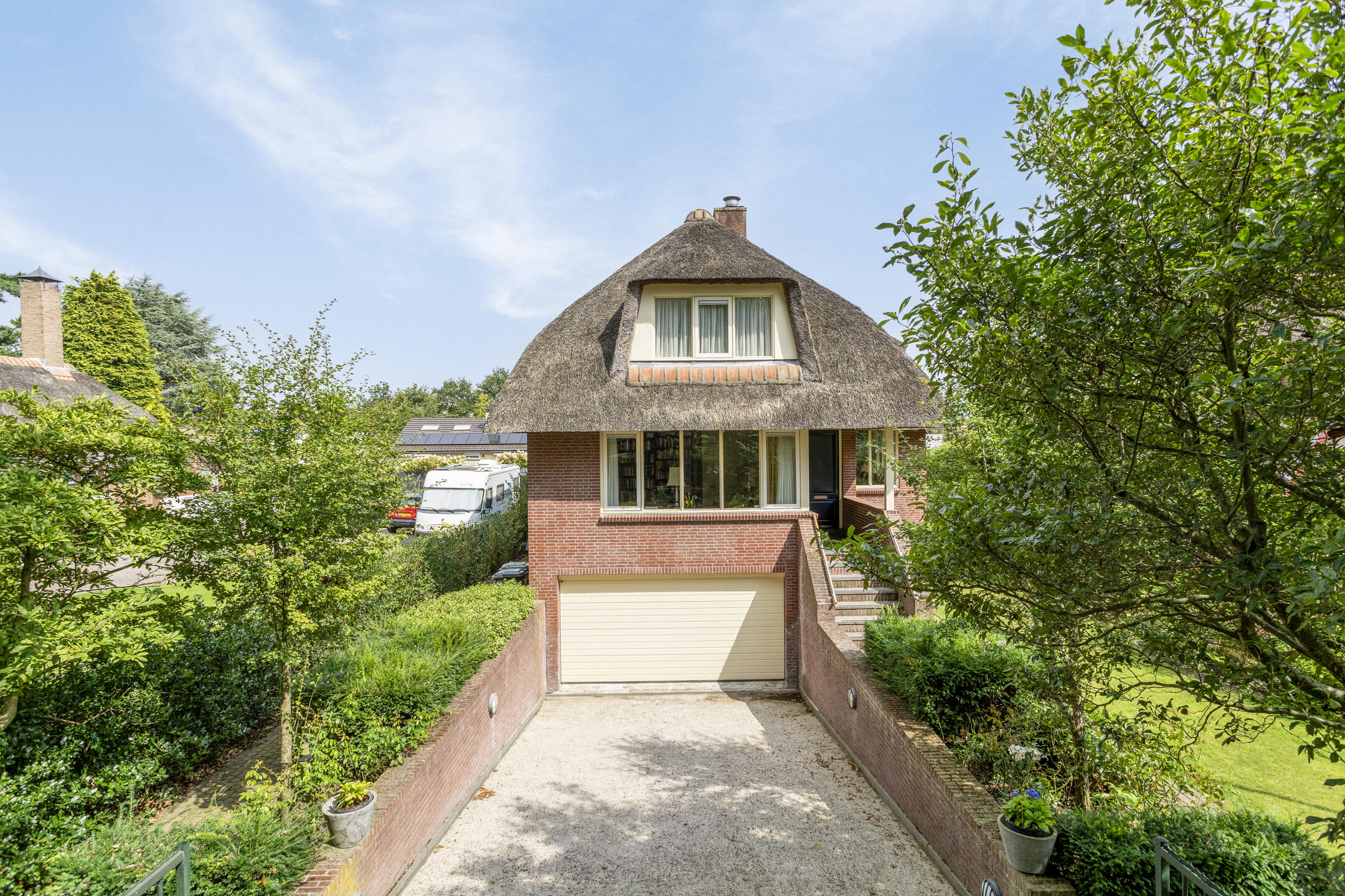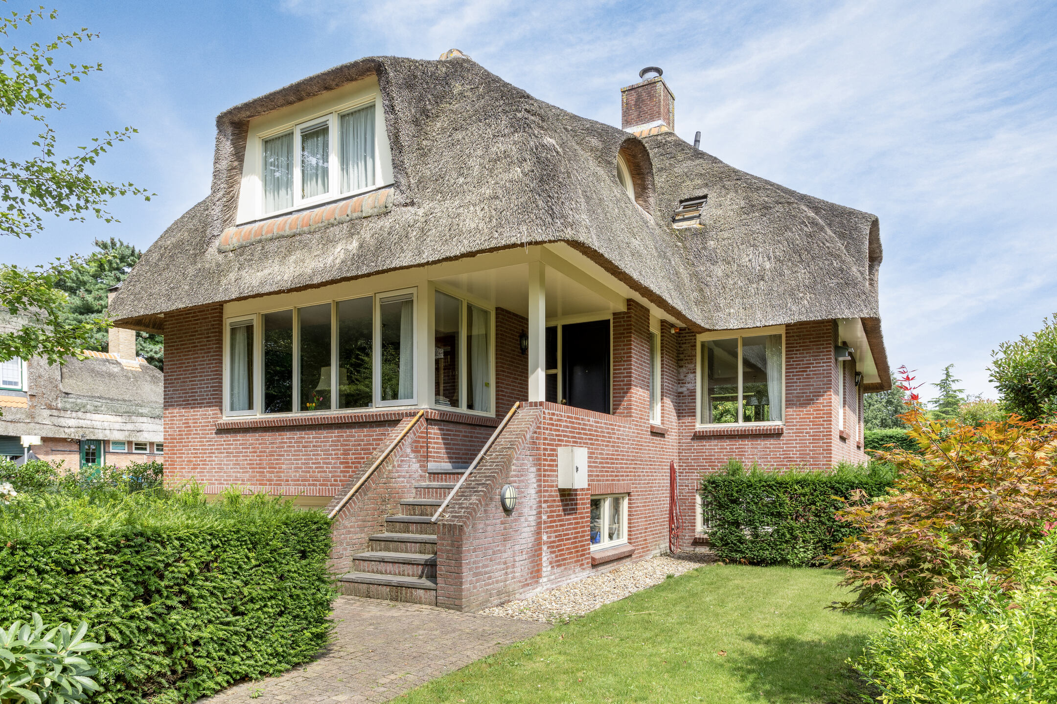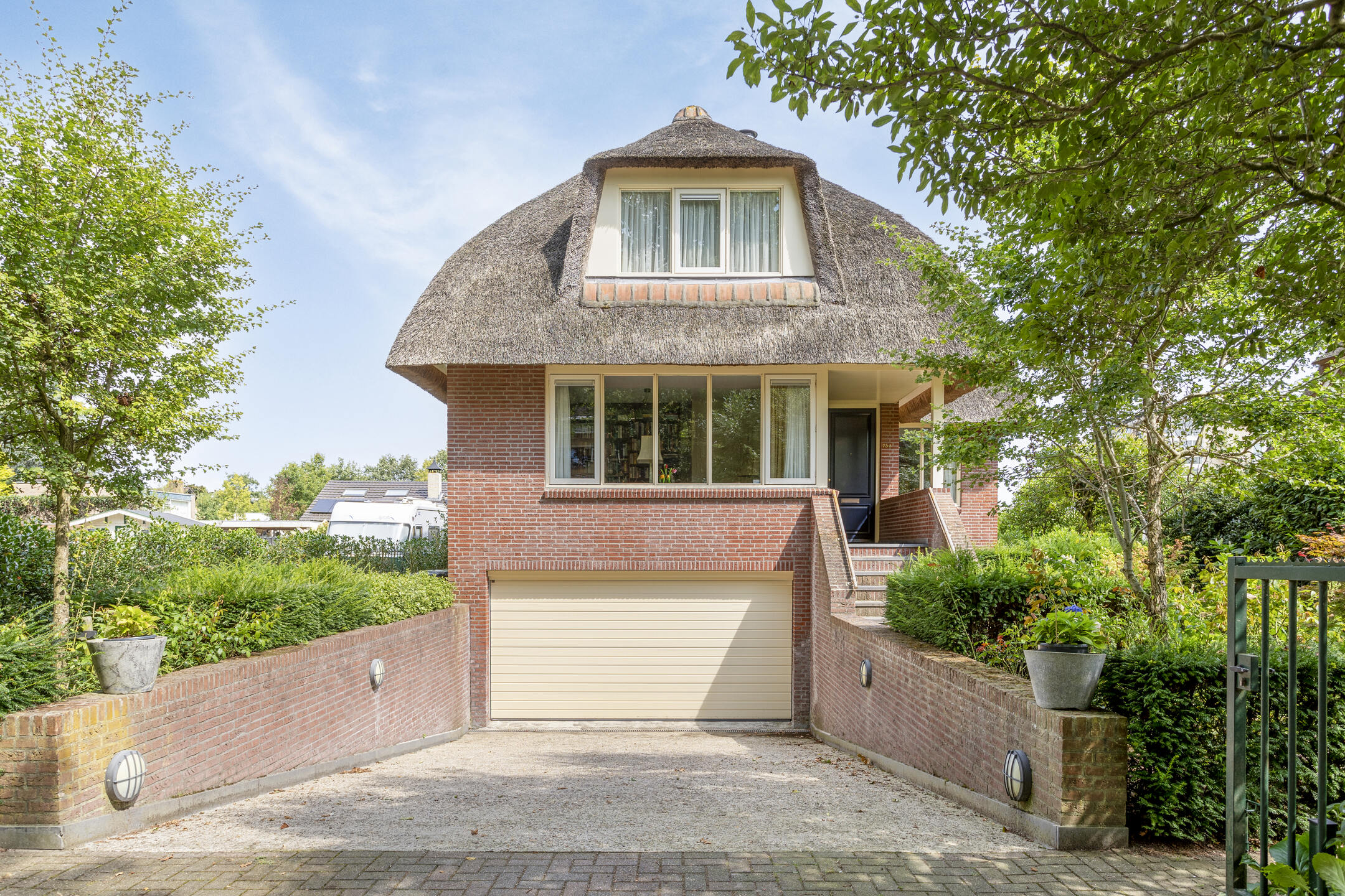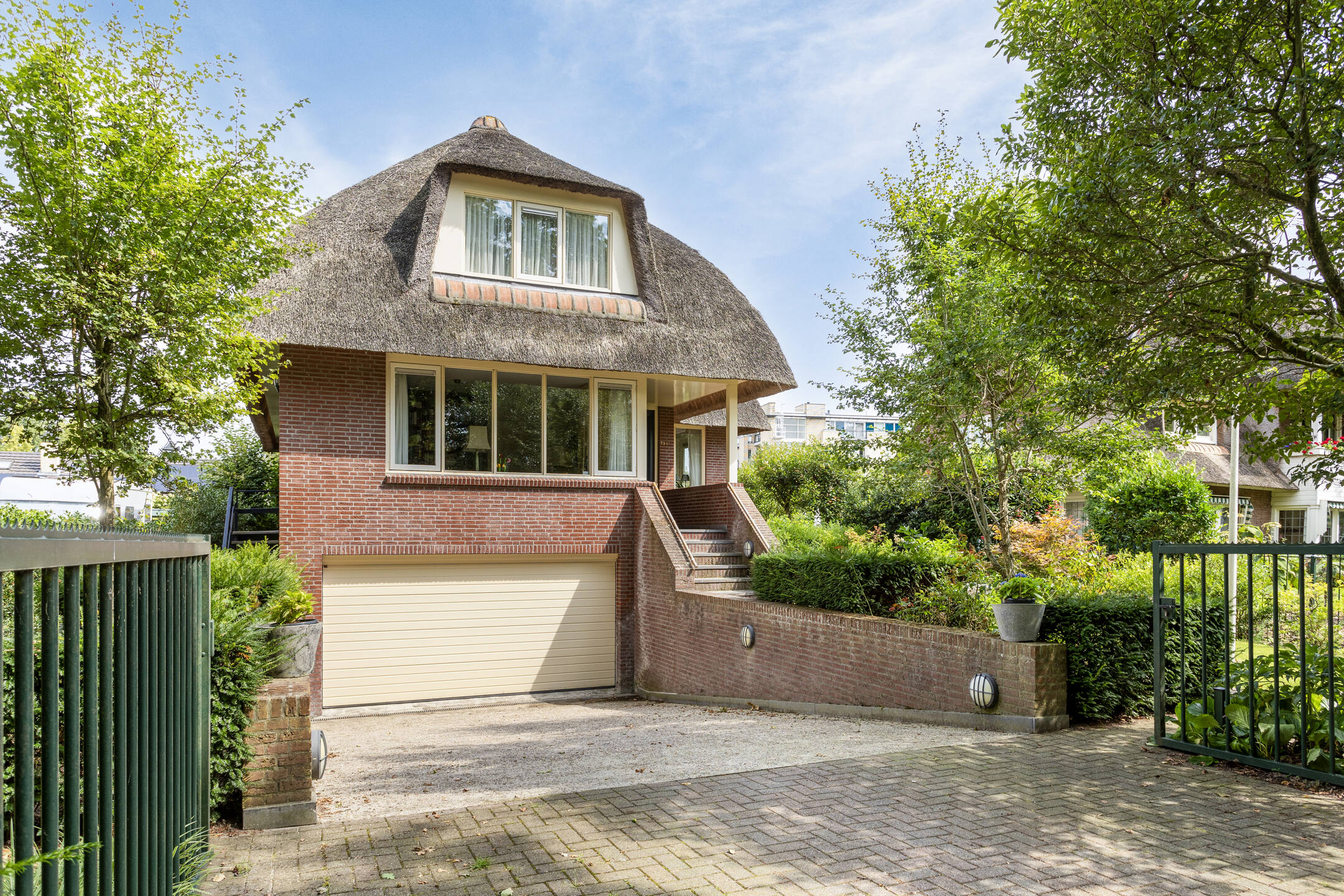 The architecture nods to the elegance of the 1930s with a distinctive thatched roof, enhancing its visual appeal. Within, solid oak flooring, smooth stucco finishes, and carefully considered spatial flow create a refined atmosphere. The expansive living and dining areas connect seamlessly to a landscaped garden and an inviting terrace, both designed for privacy and relaxation. A flexible ground floor office, five bedrooms, and a full basement with garage, wine cellar, and additional work or fitness rooms cater to diverse living and working needs.