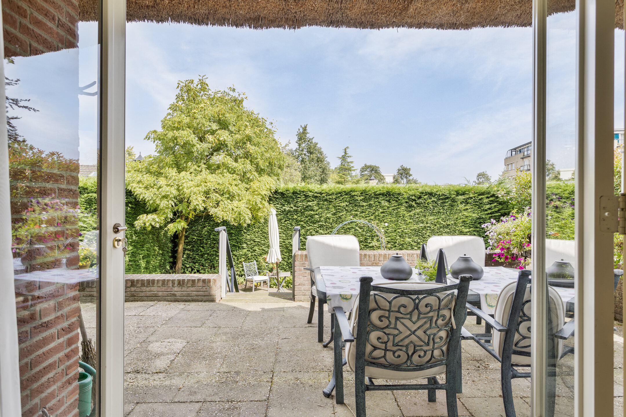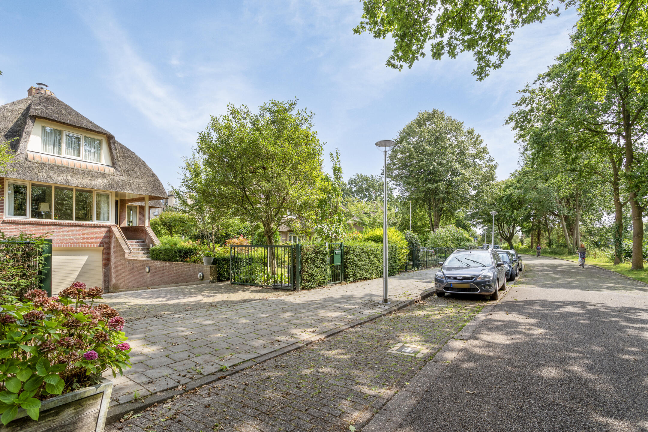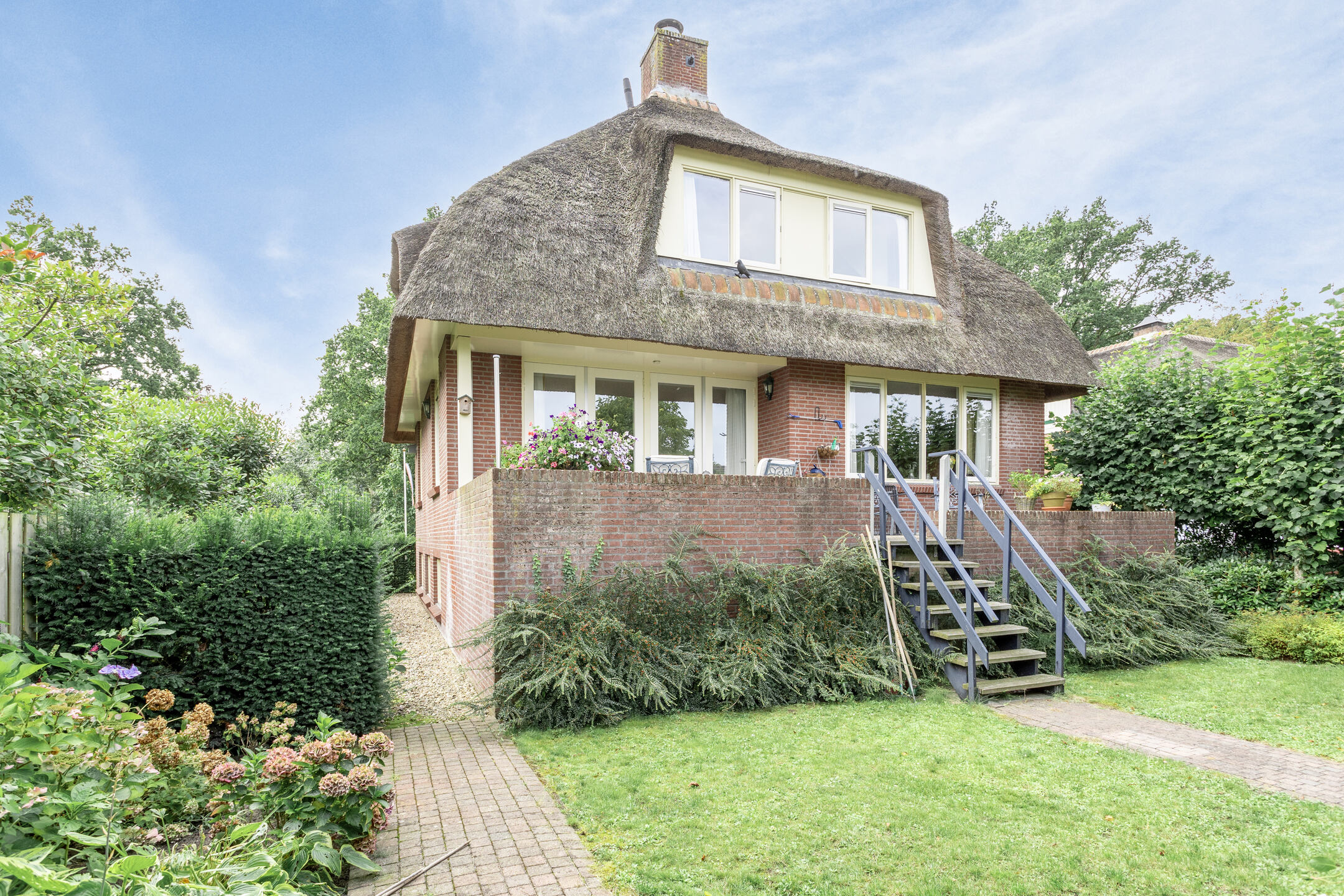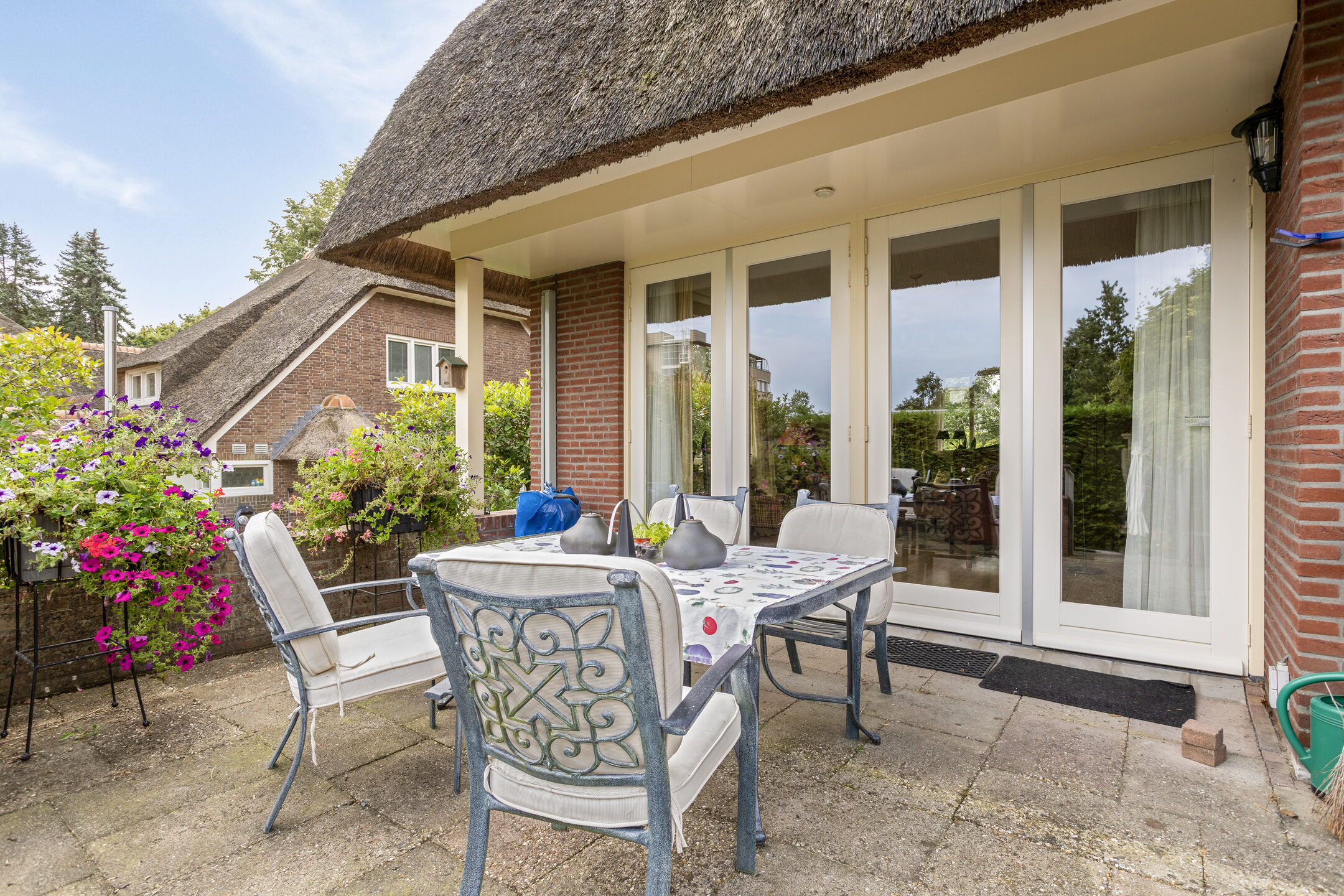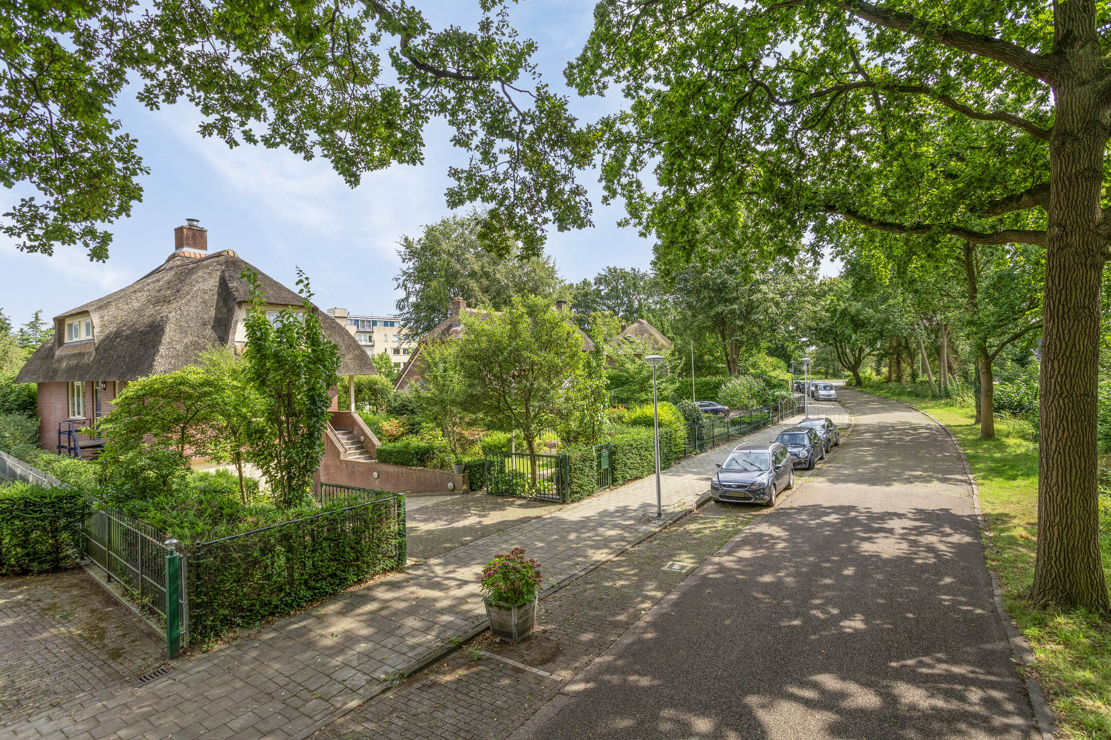 The architecture nods to the elegance of the 1930s with a distinctive thatched roof, enhancing its visual appeal. Within, solid oak flooring, smooth stucco finishes, and carefully considered spatial flow create a refined atmosphere. The expansive living and dining areas connect seamlessly to a landscaped garden and an inviting terrace, both designed for privacy and relaxation. A flexible ground floor office, five bedrooms, and a full basement with garage, wine cellar, and additional work or fitness rooms cater to diverse living and working needs.