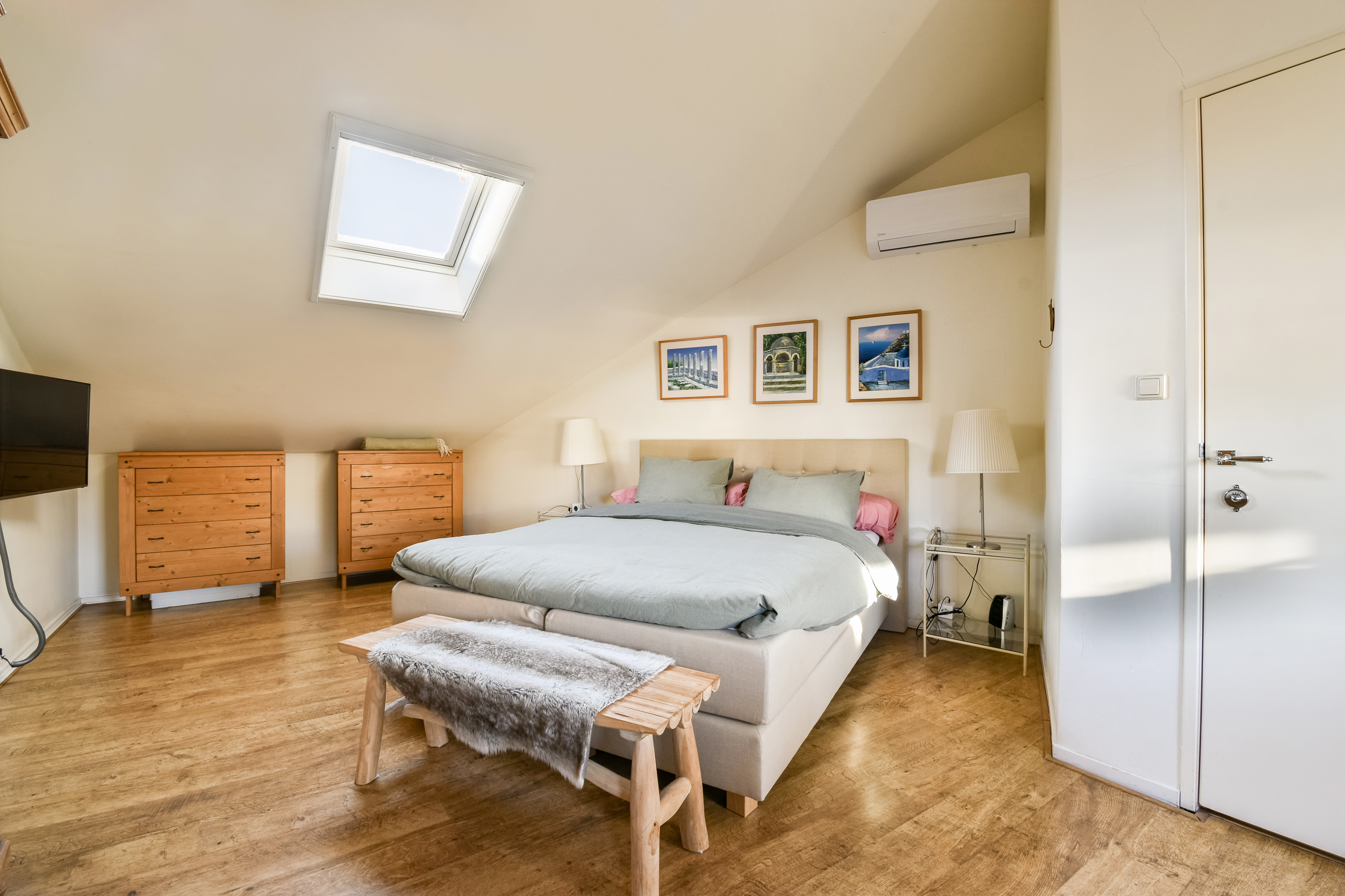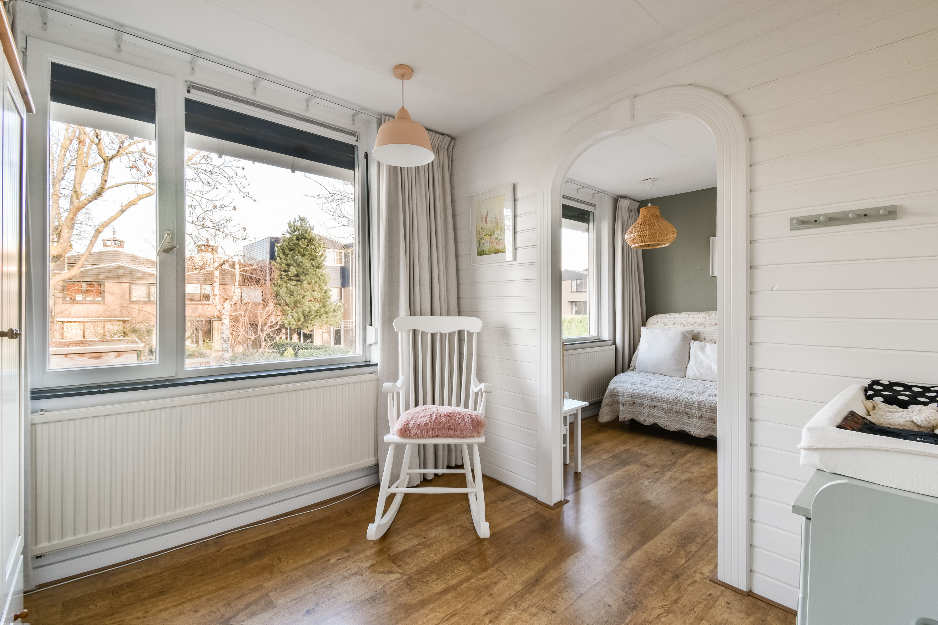 On the ground floor, the entrance opens into a spacious living room with air conditioning and a fireplace, complemented by wide doors leading directly to the garden and sunny patio. Adjacent to the kitchen equipped with built-in appliances lies a utility room and indoor storage. The massief oak flooring throughout the main level introduces warmth, while an extra versatile room opens onto the garden, providing possibilities for home office or creative pursuits.