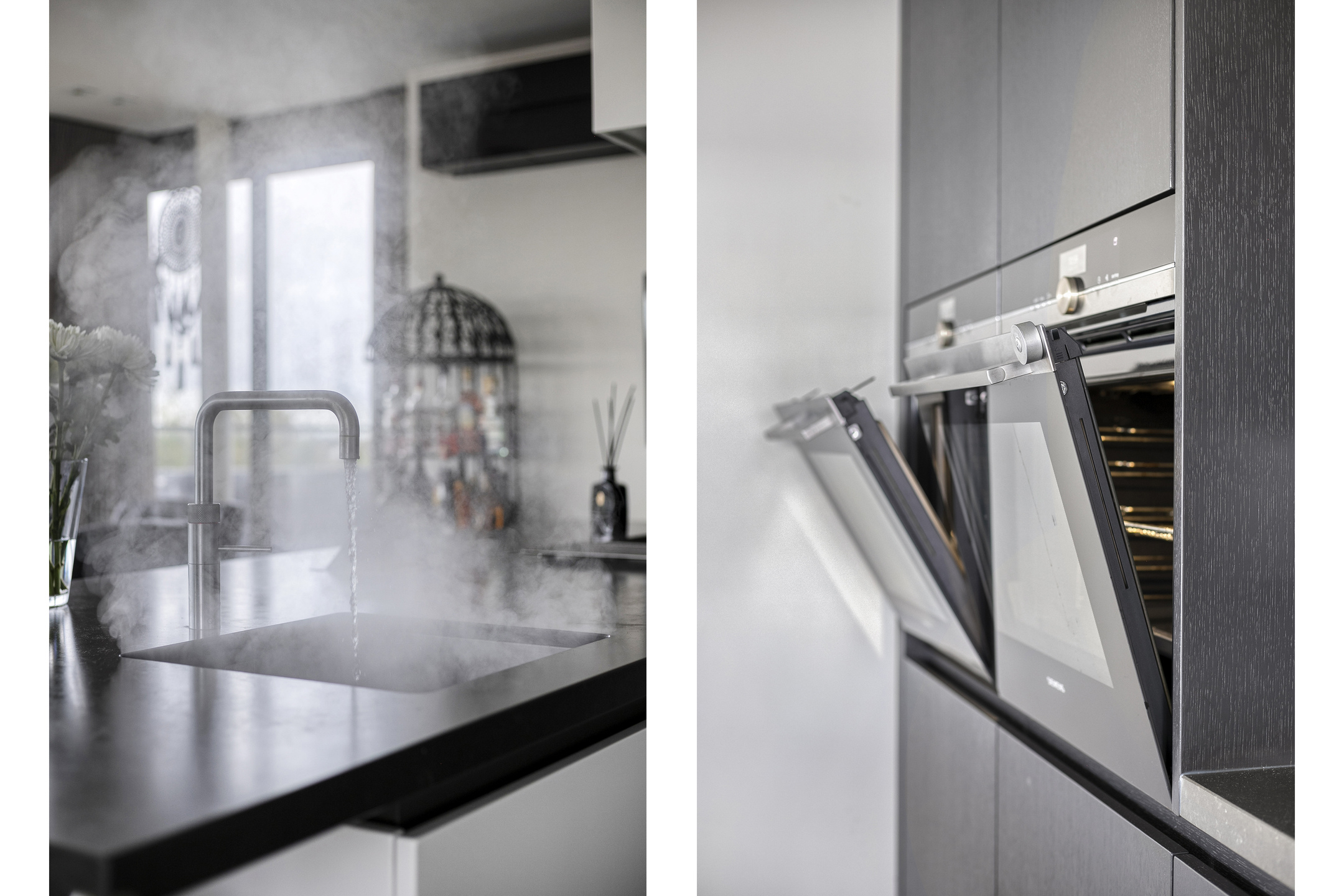 The modern open-plan kitchen with cooking island is equipped with various high-end built-in appliances, including a Quooker, gas stove, extractor hood, combination microwave, convection oven with steam function, fridge-freezer combination, and dishwasher.