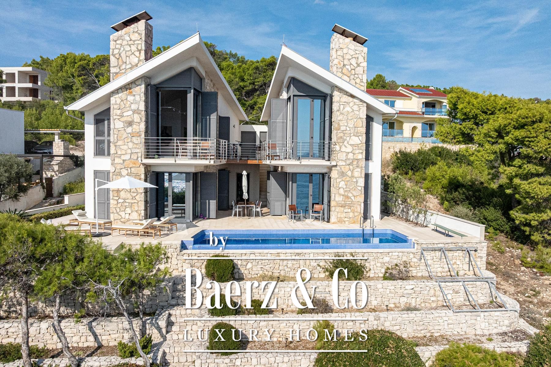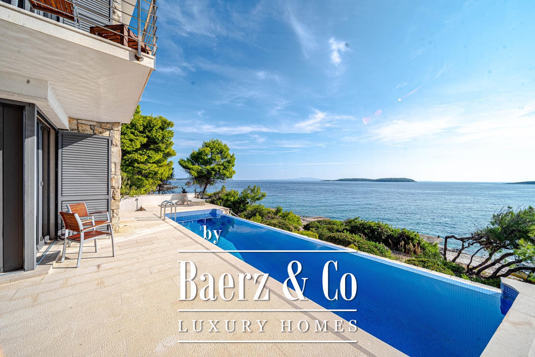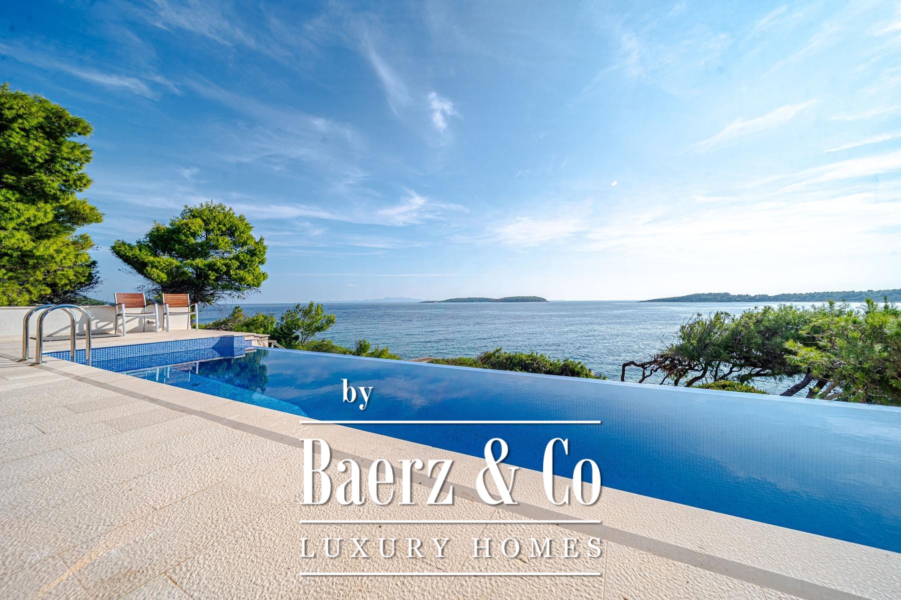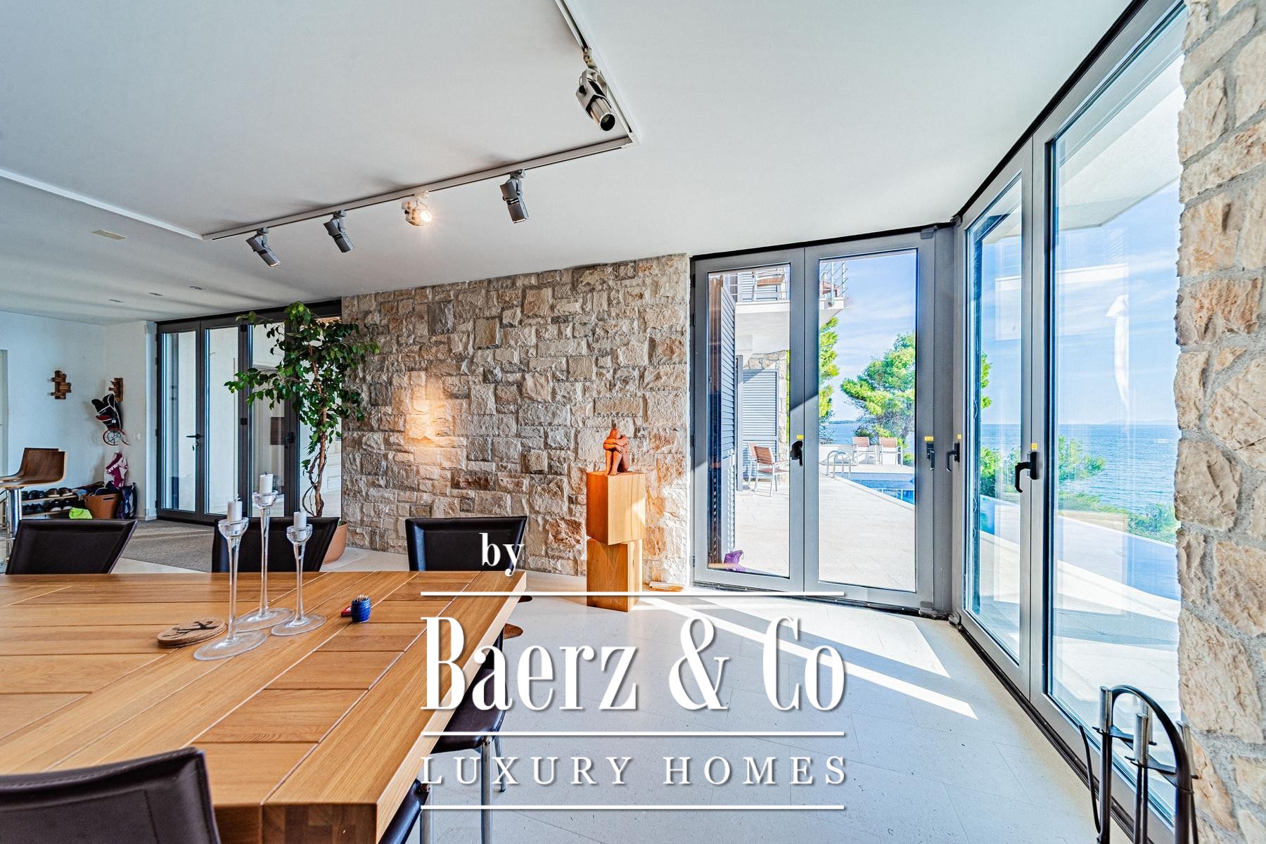 This villa Blato is set directly on the seashore in Croatia, presenting 260 m² of interior living across a 500 m² plot. Architectural clarity defines the residence, composed of two independent units linked by broad terraces, each functioning as a self-contained home. The main floor of both units offers combined living, dining, and kitchen spaces, while upstairs, each provides two bedrooms, all with en suite bathrooms and private terraces.