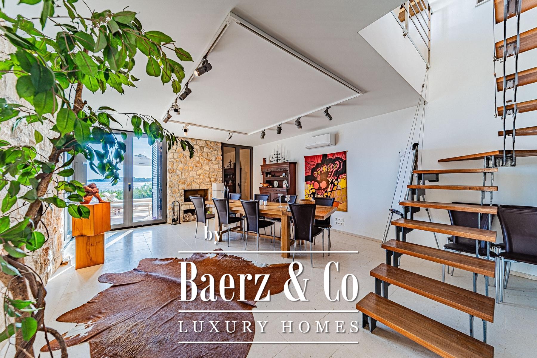 The landscape in front of the villa features pale stone paving, a swimming pool and dedicated areas for sunbathing, all designed to encourage easeful living by the sea. A pedestrian path brings you just 15 metres to the water, where a small pier allows for boat mooring and private retreat. Throughout, the materials and interior finishes display thoughtful attention to detail, imparting a sense of understated exclusivity.