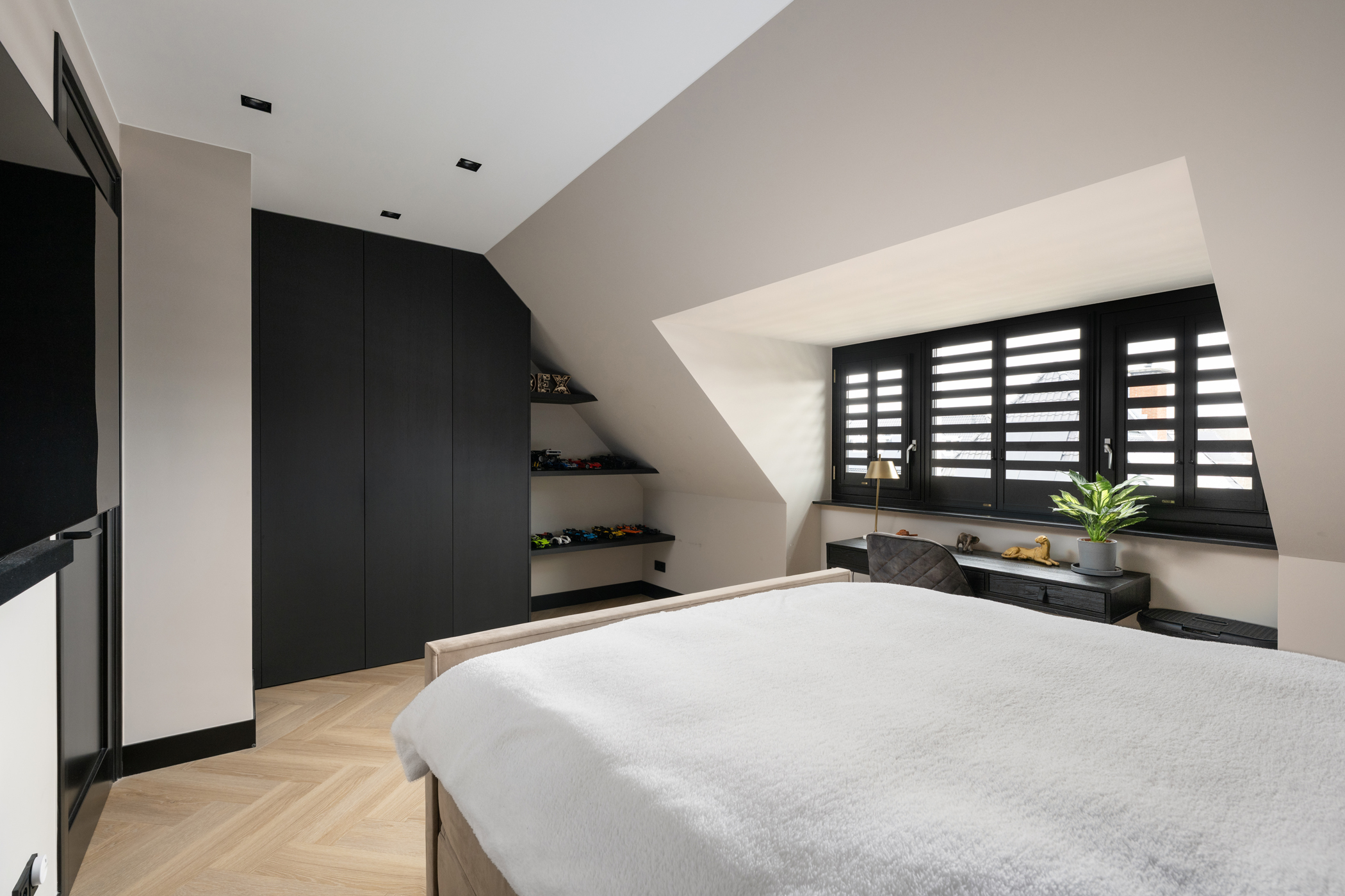 At the front you will find the third bedroom, equipped with air conditioning and built-in wardrobes hidden behind a stylish slatted wall.
