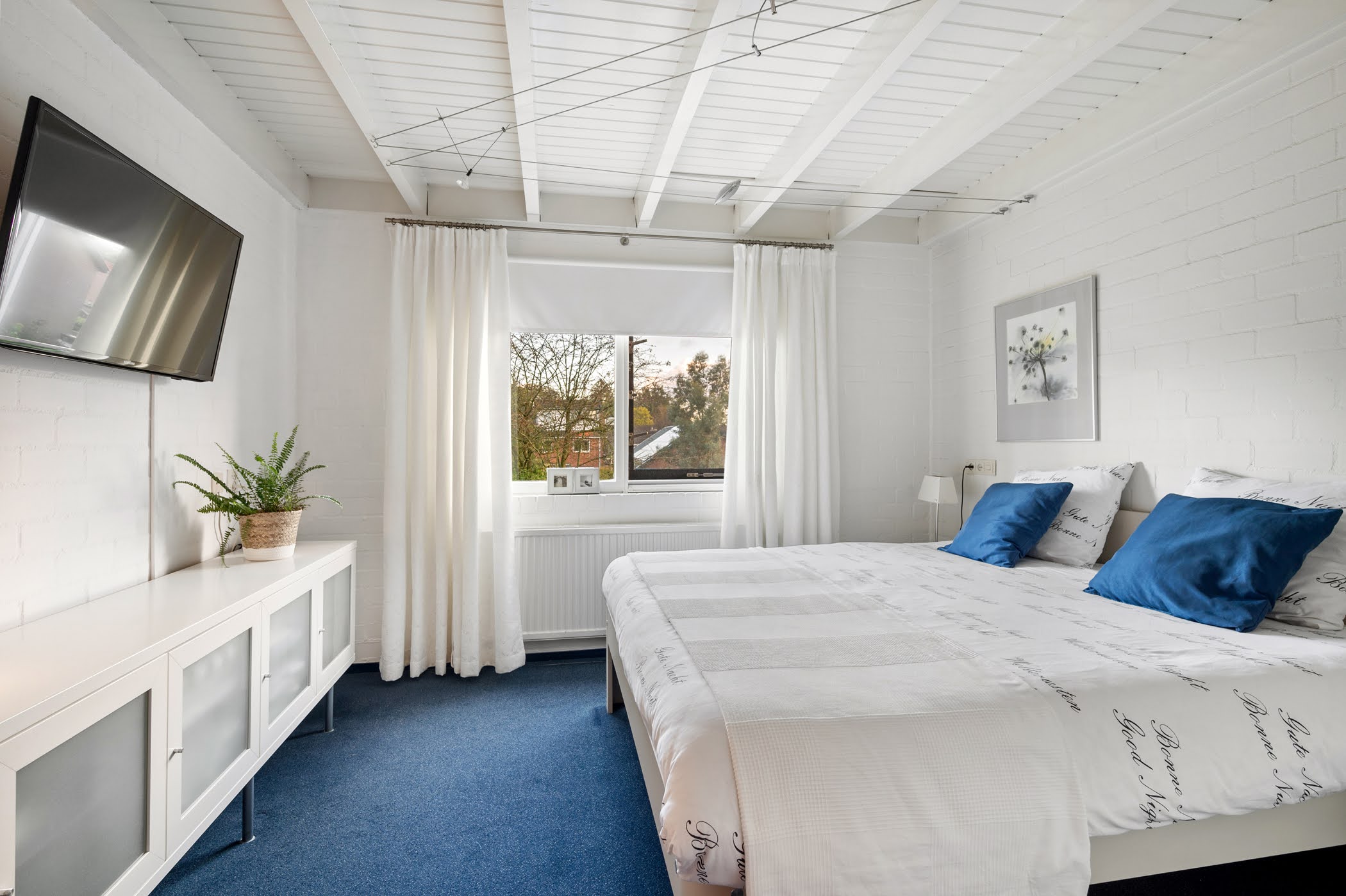 Both bedrooms face the garden, are carpeted, and have Velux skylights.