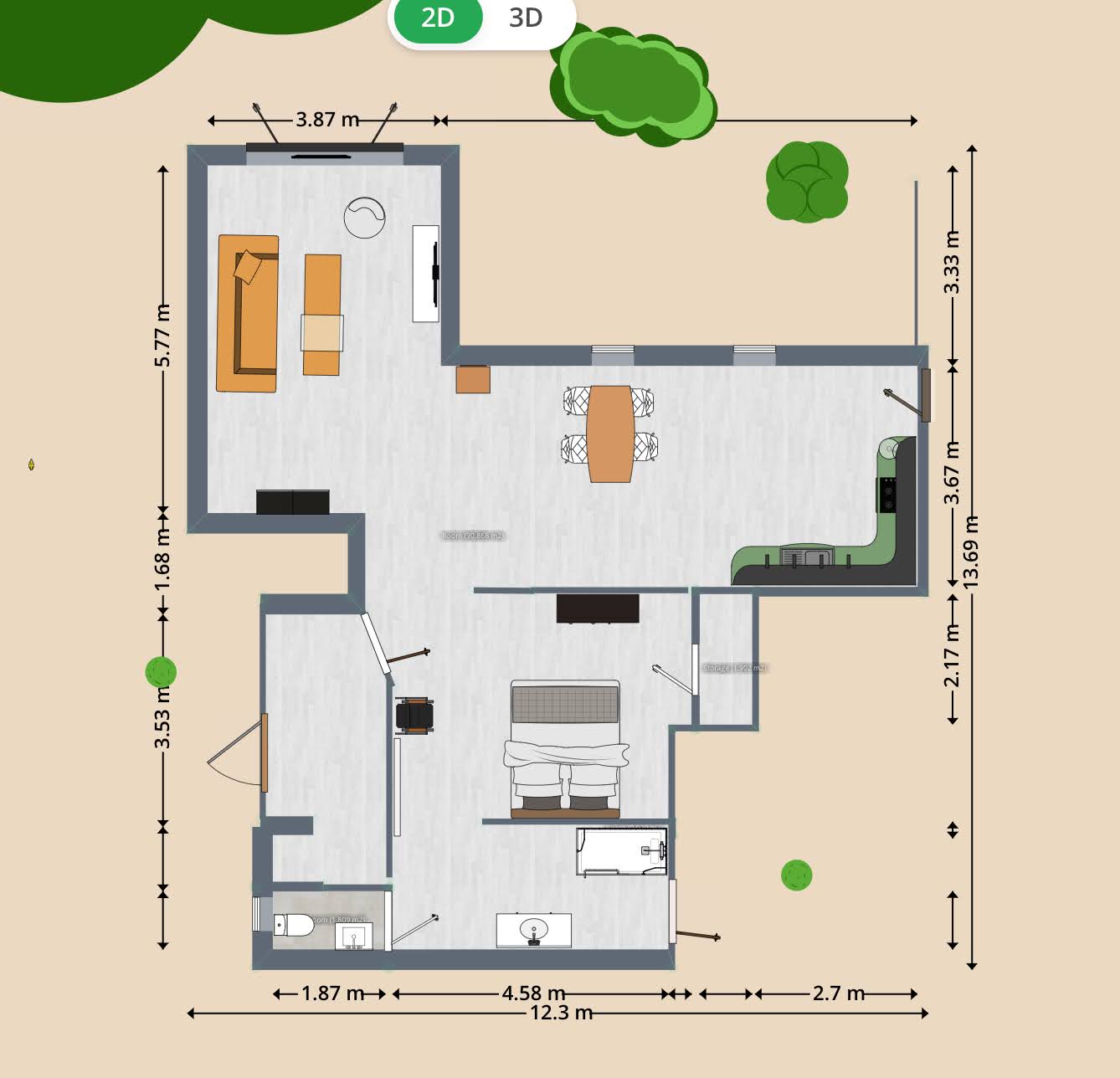 Entrance hall with meter cupboard, wardrobe, toilet, and access to the living room. From the hall, you enter the living room, which connects to the open kitchen and the conservatory.