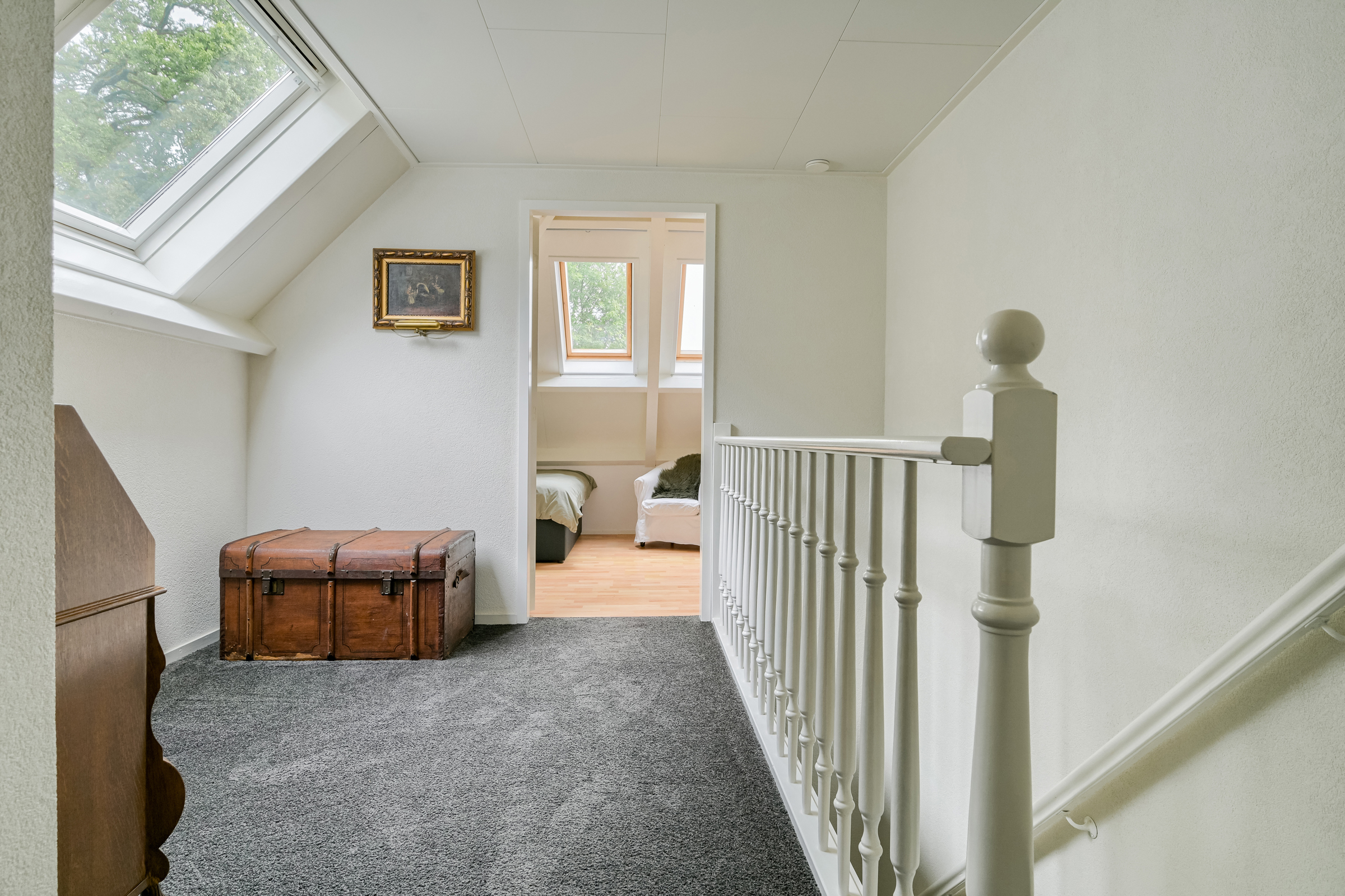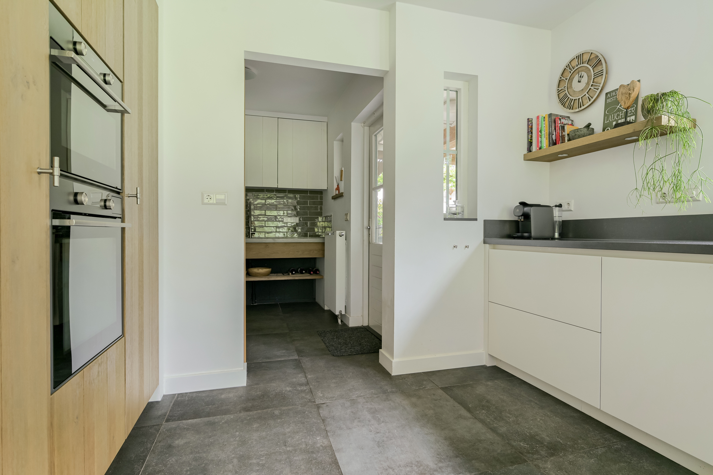 The beautiful, fully enclosed garden surrounds the home, offering maximum privacy and blending seamlessly into the natural surroundings. Several terraces have been laid out around the house with clean-lined concrete tiles. A veranda is situated between the house and the outbuilding and continues alongside and behind the outbuilding, offering wonderful views of the garden. Part of the veranda is equipped with patio heating. The garden includes a large lawn, a fruit orchard, and various trees and hedges. A lovely pond is located next to the house. The driveway, finished with decorative paving, leads to both the carport (space for two vehicles) and the large barn.