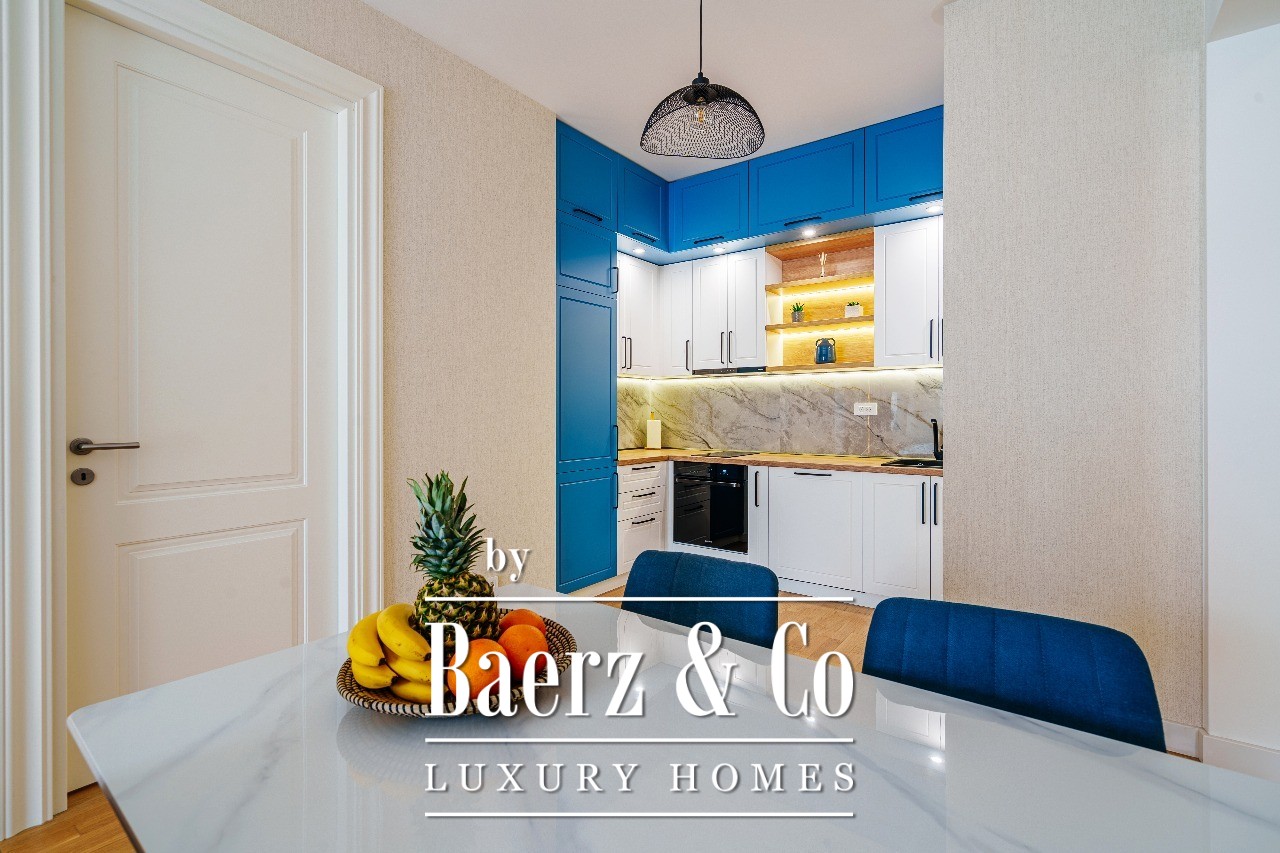 Apartment Budva offers 65 m² of refined living space, just 300 metres from the Adriatic shore and three kilometres from Budva’s vibrant centre. Situated on the eleventh floor of a fourteen-storey building, this fully furnished apartment commands views of the sea and surrounding mountains, setting an unhurried cadence to daily life. The layout features a living room with a kitchen and dining area, two bedrooms, two bathrooms, and a terrace that opens to the landscape beyond.