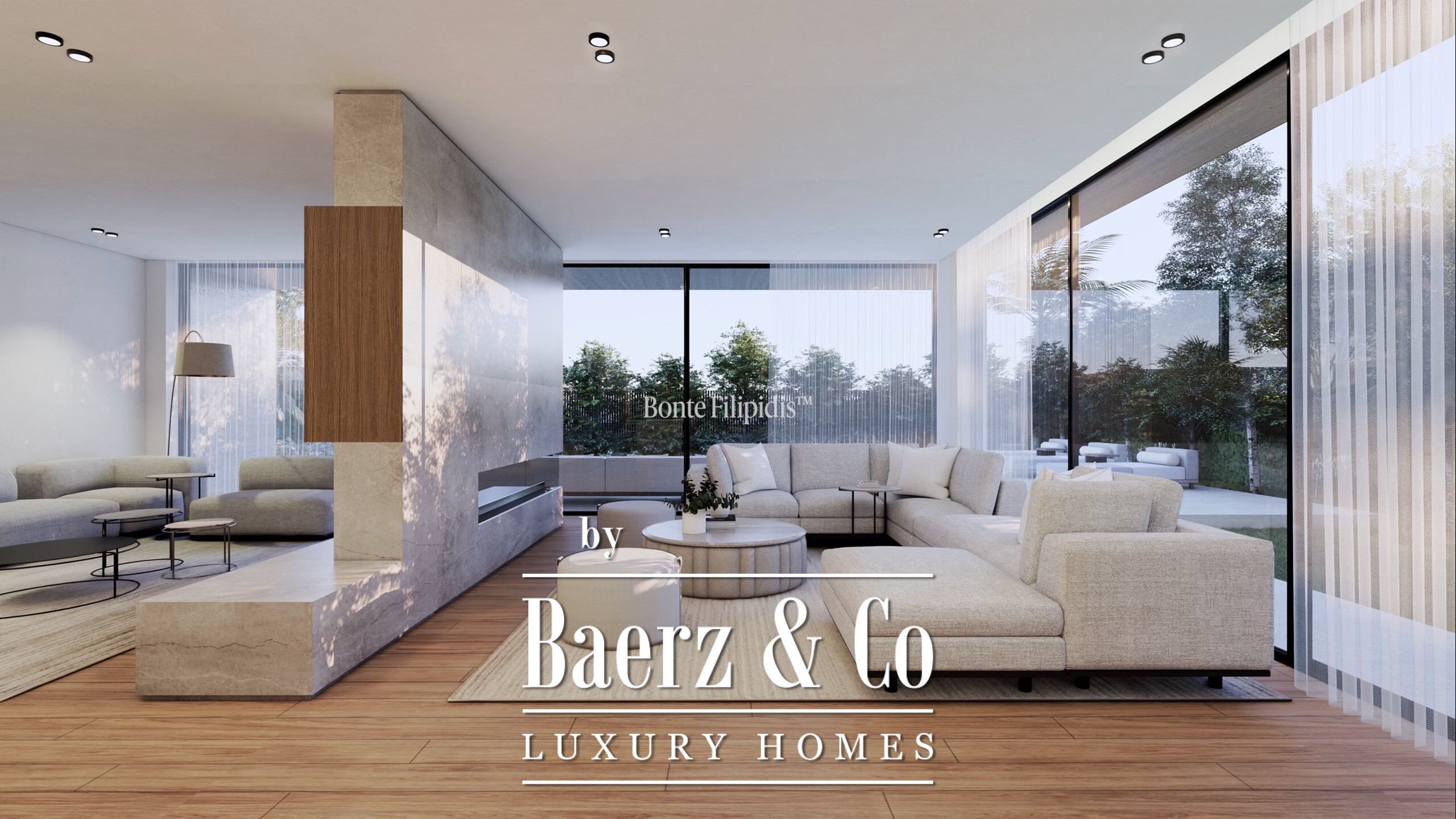 The villa’s technology includes underfloor heating, VRF/VRV air conditioning, Sonos integrated sound, a home automation system, CCTV, EV charging, and an ethernet network. Oak flooring by Havwoods and a travertine façade frame the living spaces, and Laufen and Dornbracht finishes define the bathrooms.