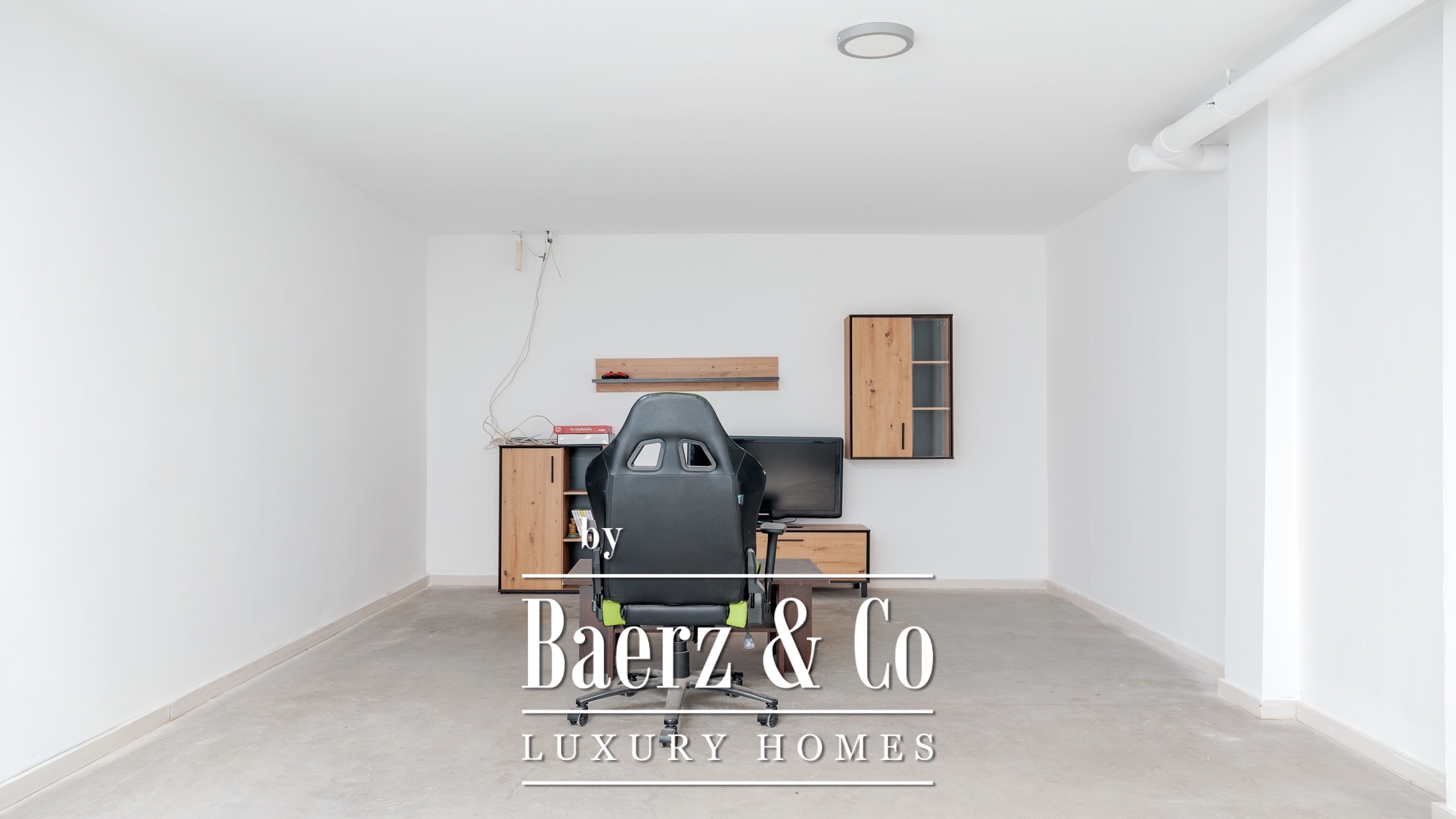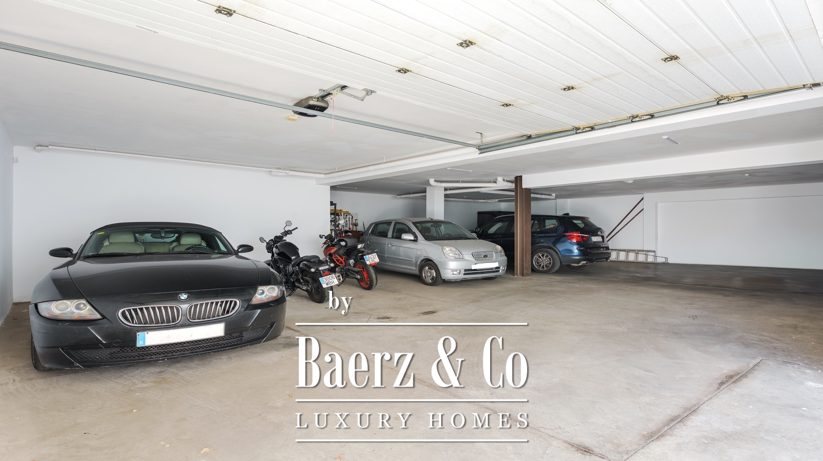 A closed garage for several cars, next to a spacious multifunctional lounge, perfect as a gym, games room or private cinema. It also has a storage room and laundry room.