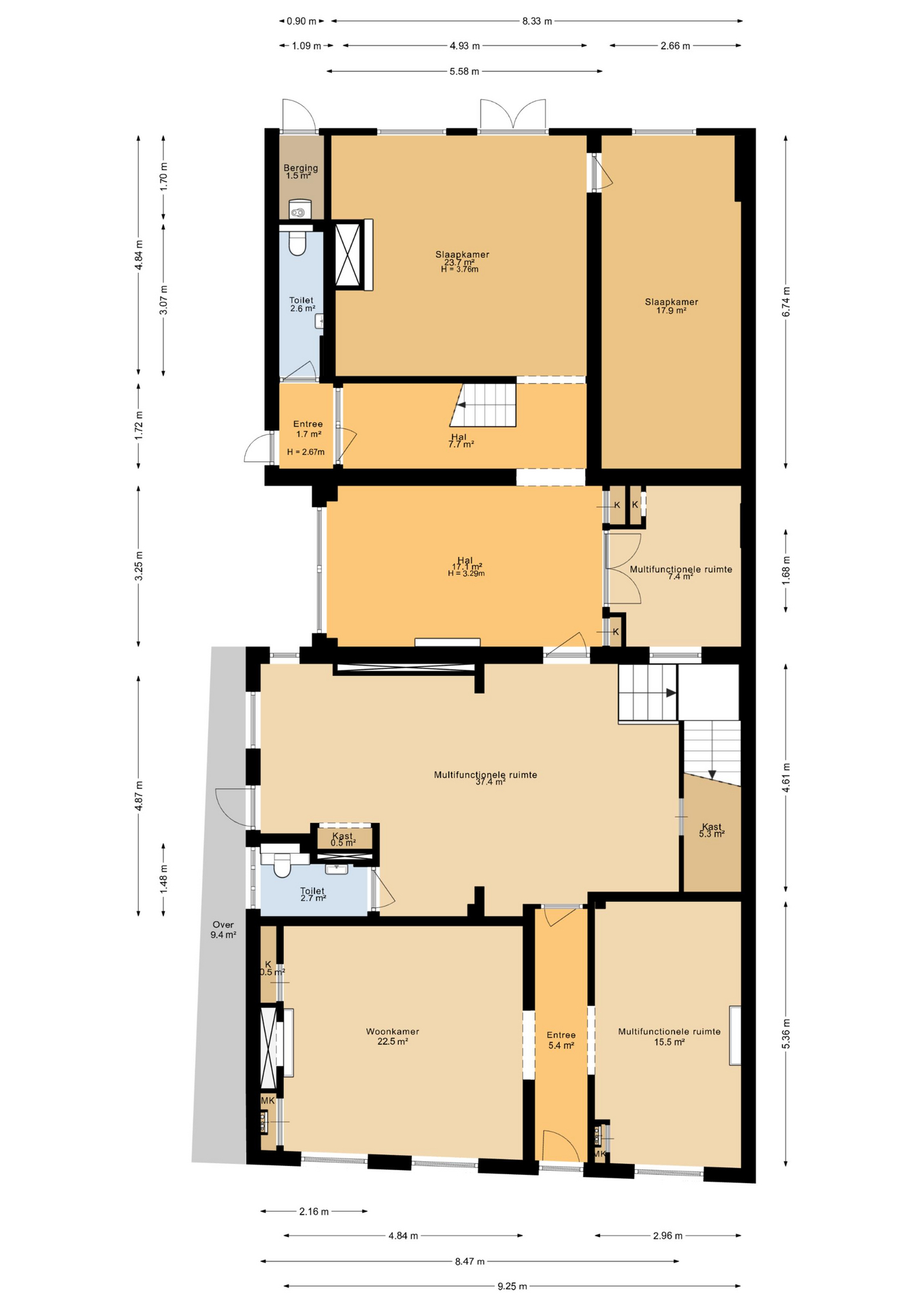 A beautiful floor showcasing the original roof structure. At the front is a bright, multifunctional space. Additionally, there is a large storage room and a toilet. Extra daylight enters through newly installed, high-placed windows above the mezzanine.