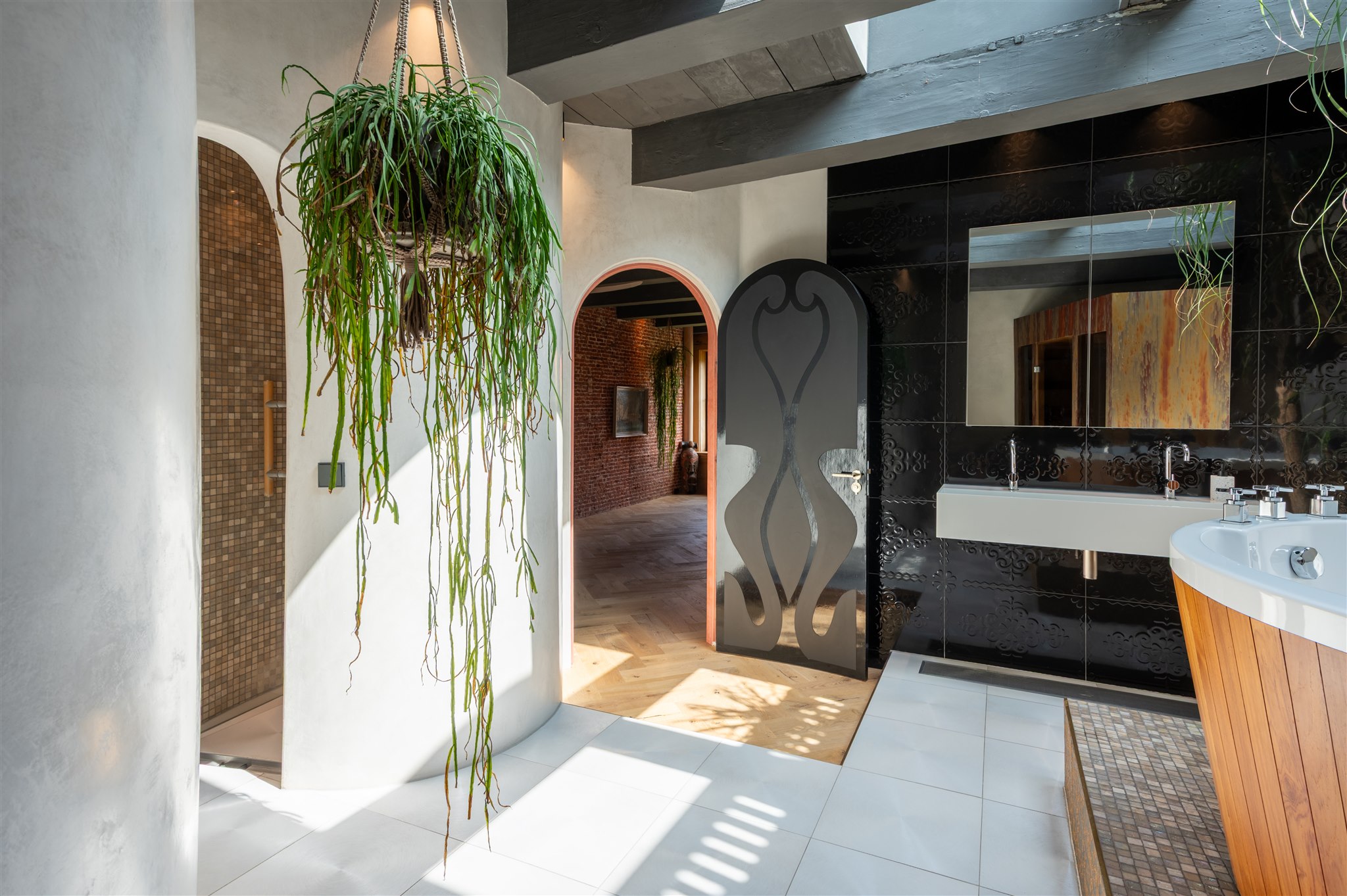 A broad landing opens onto two spacious bedrooms and a spectacular wellness area complete with walk-in shower, double washbasin, round bathtub, and sauna. The architecture is enriched with soft curves and organic shapes that provide a natural flow between the spaces.