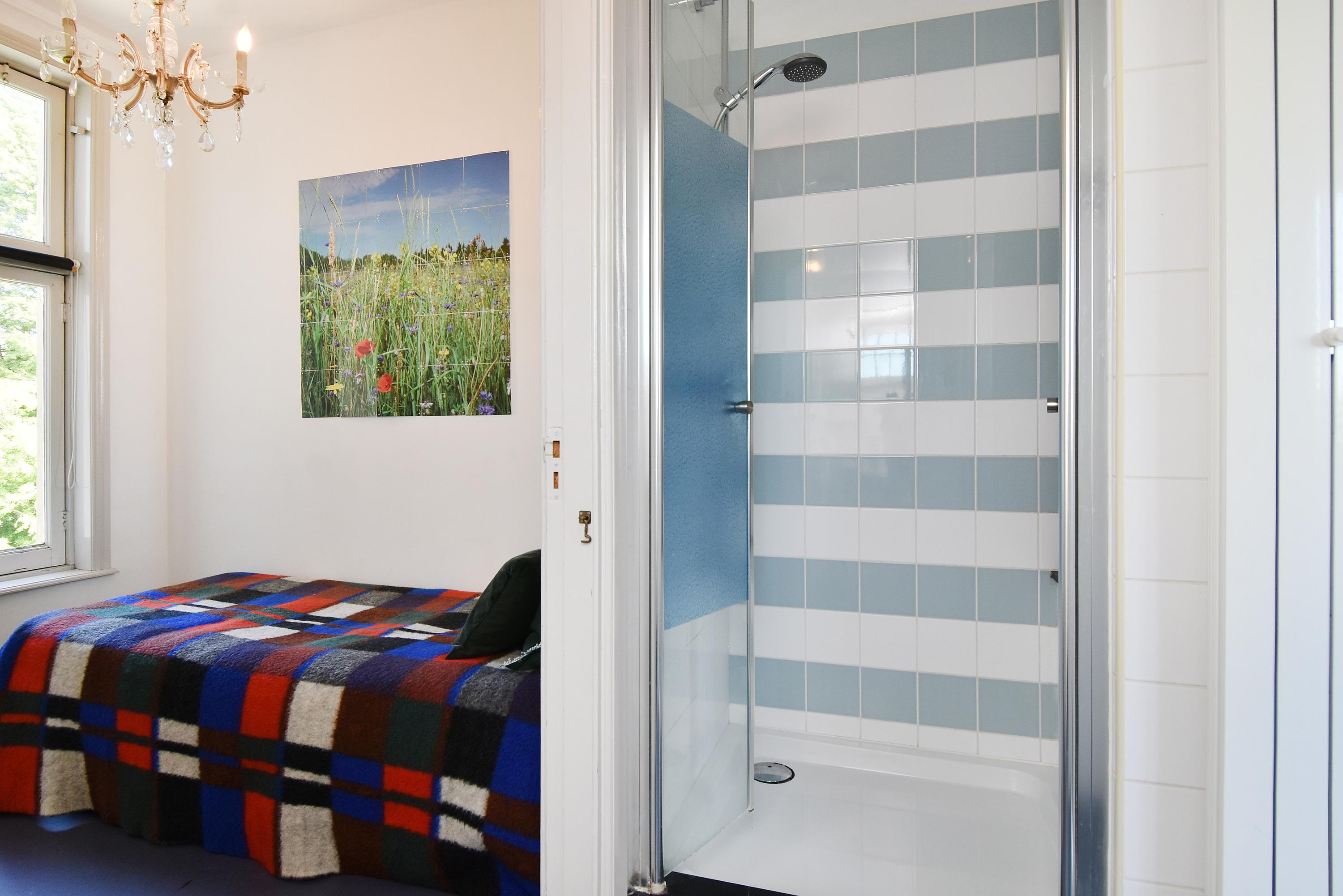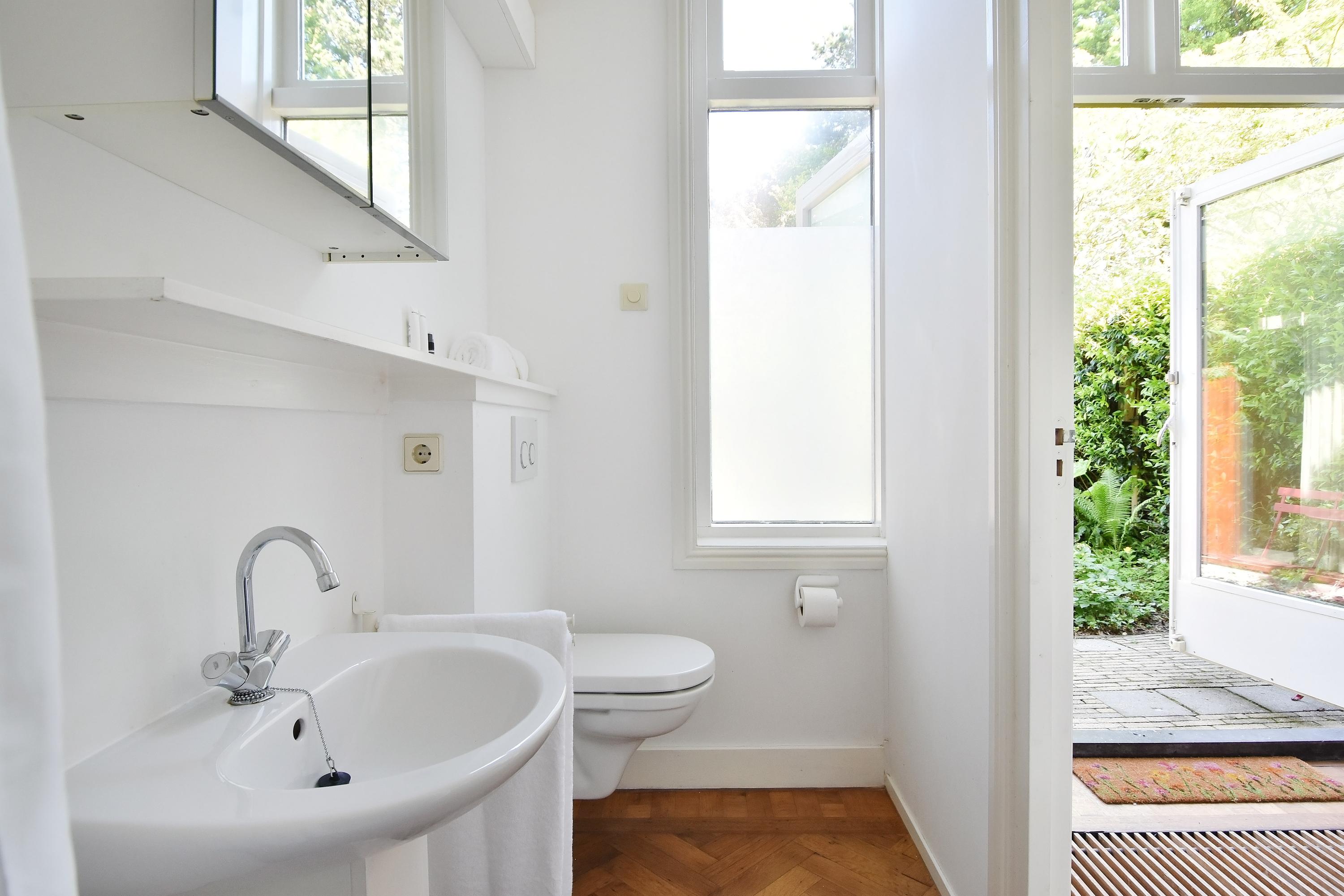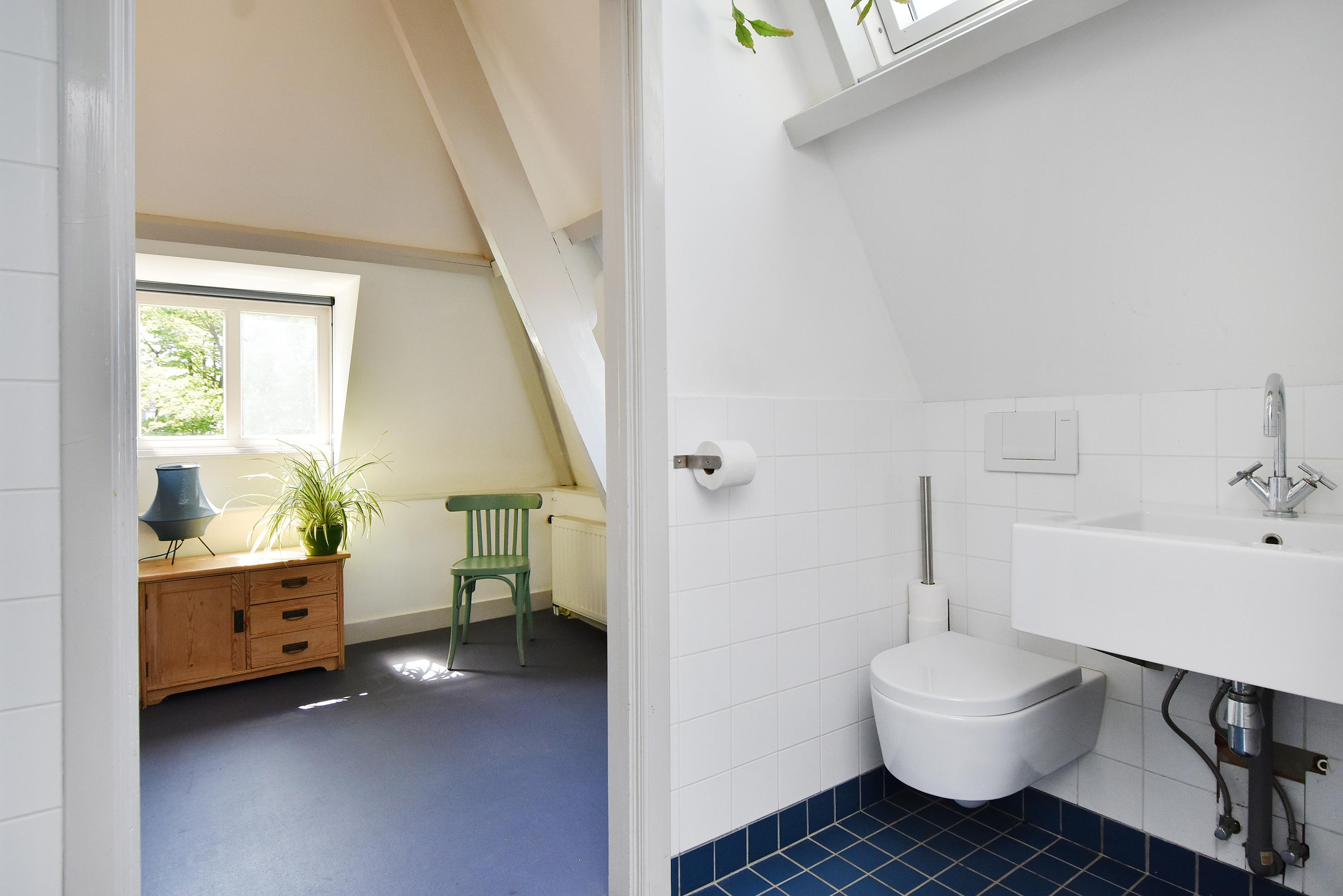 The top floor, with its bright landing and side windows, offers sweeping views of Delft’s towers. This level includes a bathroom with shower, sink, and fourth toilet, plus a rear-facing bedroom. At the front, you’ll find the generous master bedroom with ample wardrobe space. In the center is a large storage/laundry room with abundant storage, central heating boiler, washing machine, and dryer connections, with access to the roof via loft ladder. At the rear, there are two further spacious bedrooms, one of which features its own en suite bathroom with shower, sink, and fifth toilet.