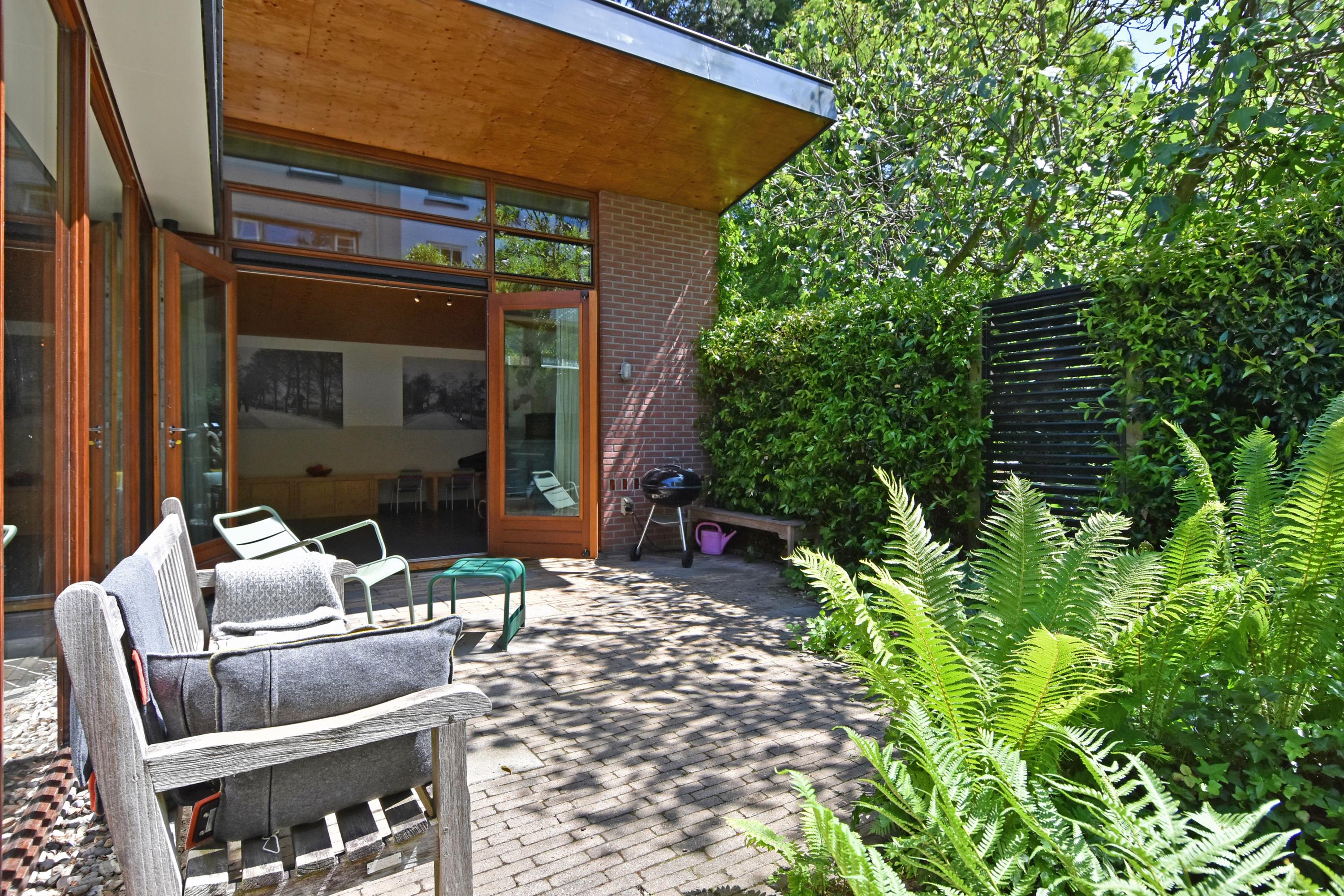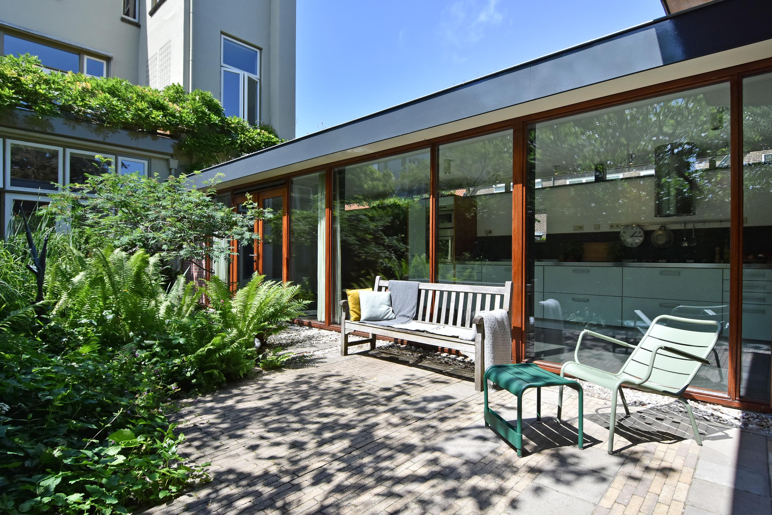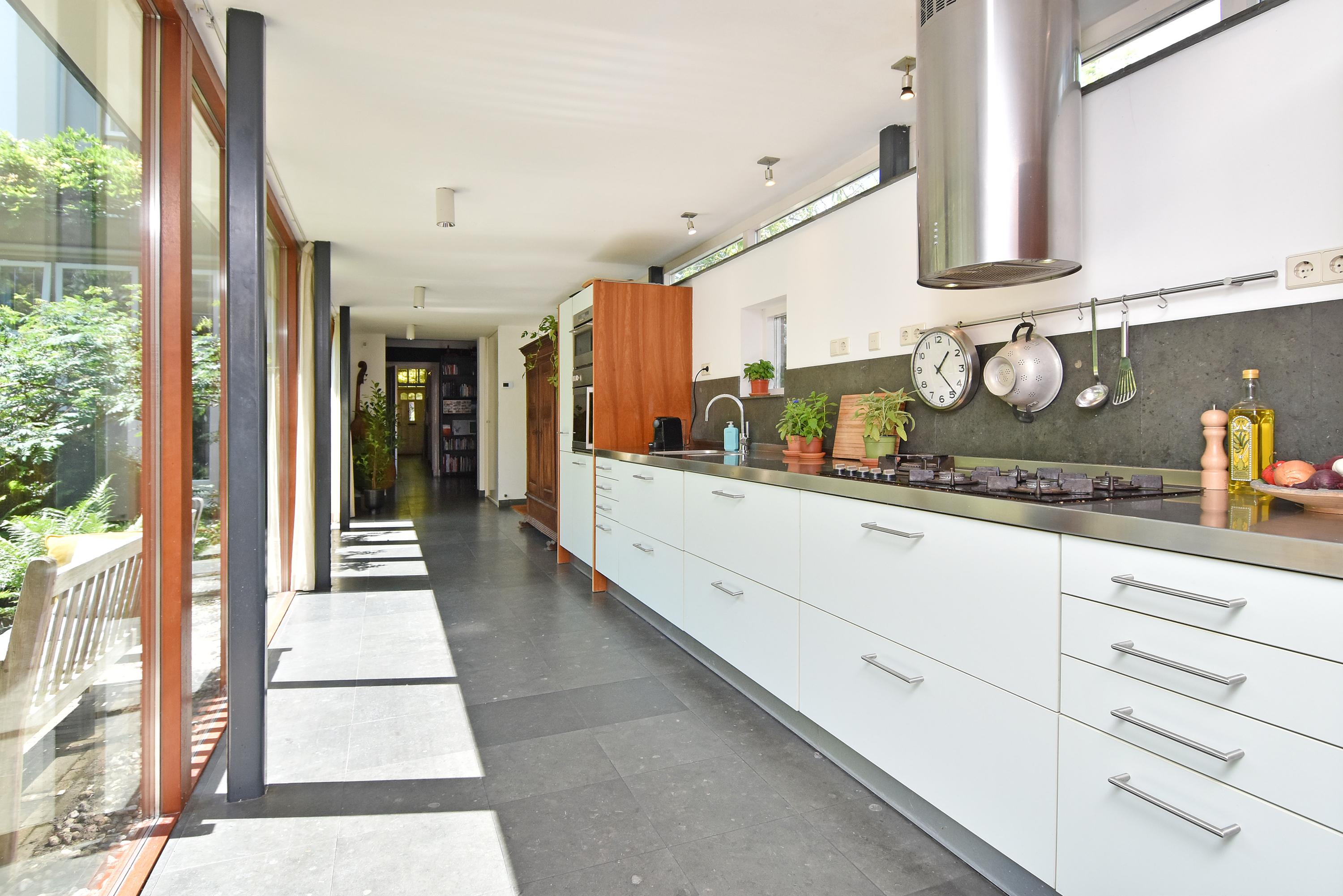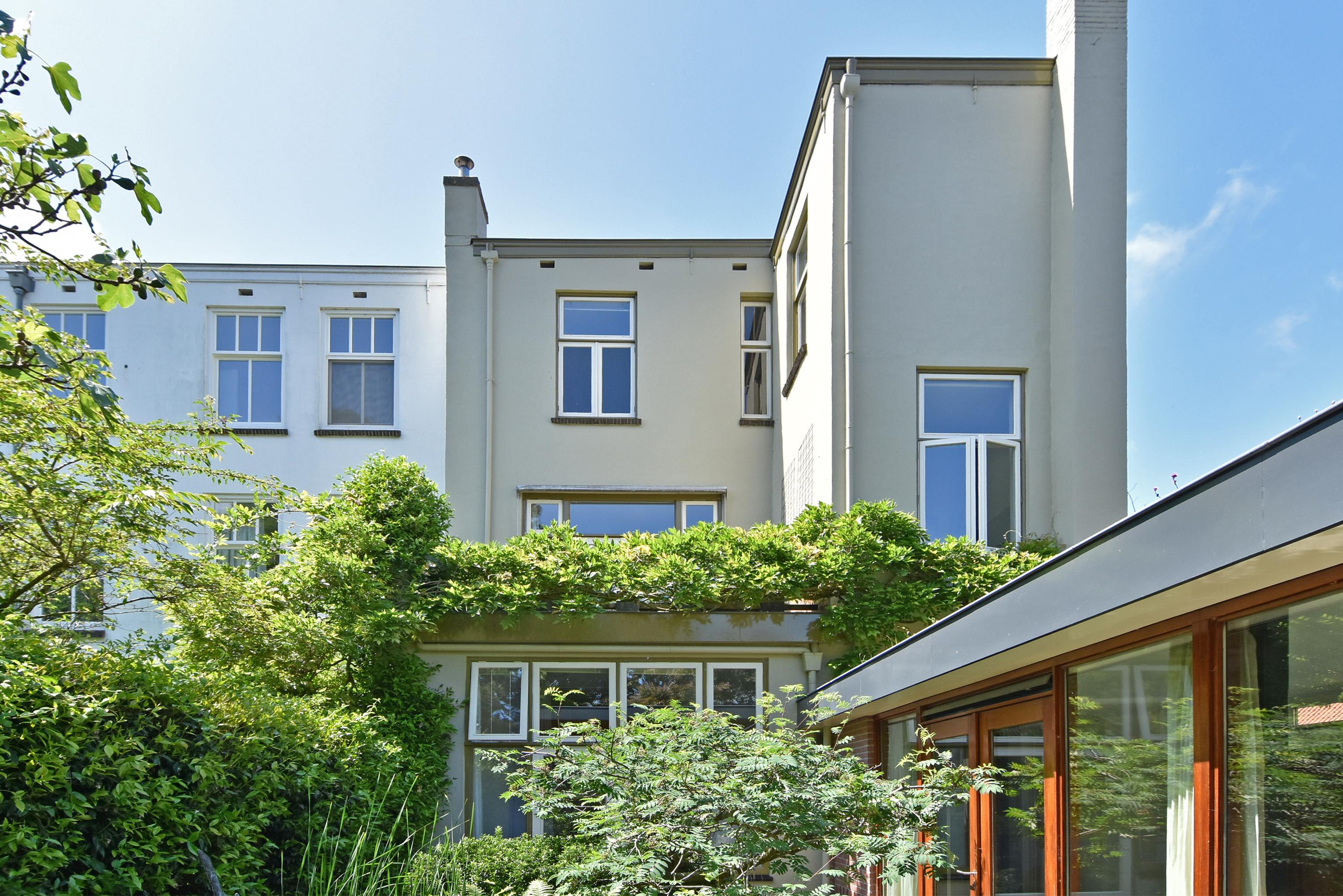 A modern extension forms a remarkable combination with the historic house. Here you will find a fully equipped and spacious kitchen, featuring a large block with stainless steel countertop, drawer units, excellent workspace, and many (designer) built-in appliances. Large windows provide unique views of the beautifully landscaped, lush, and sunny garden. Adjoining is a generous dining and music room, which also opens onto the back garden via French doors. This dining room also connects to the large garage at the rear, which benefits from daylight and can also be accessed via the side street.