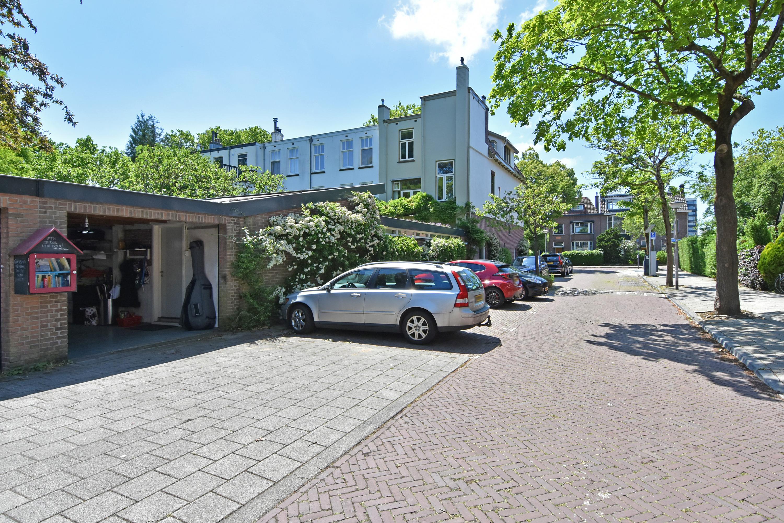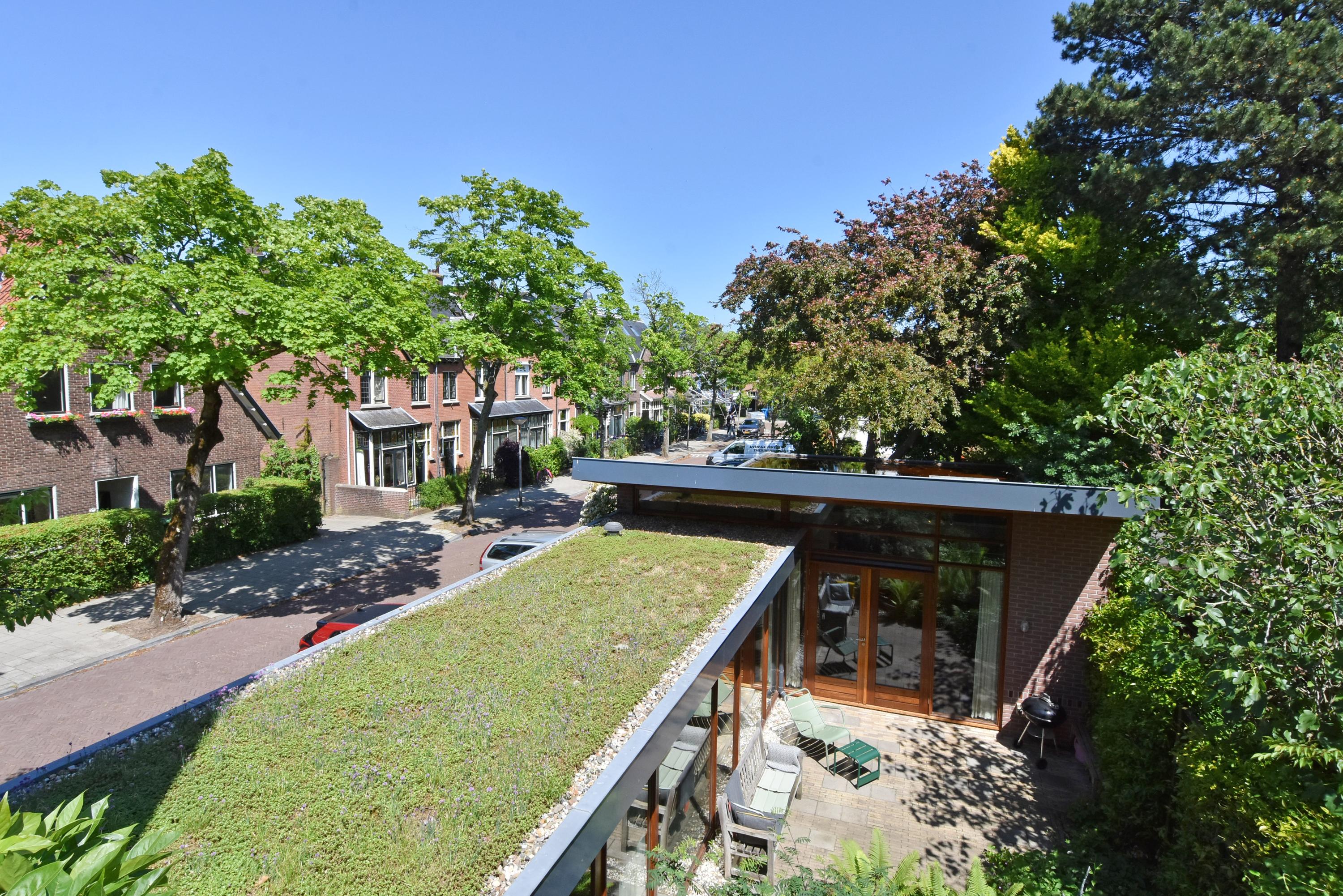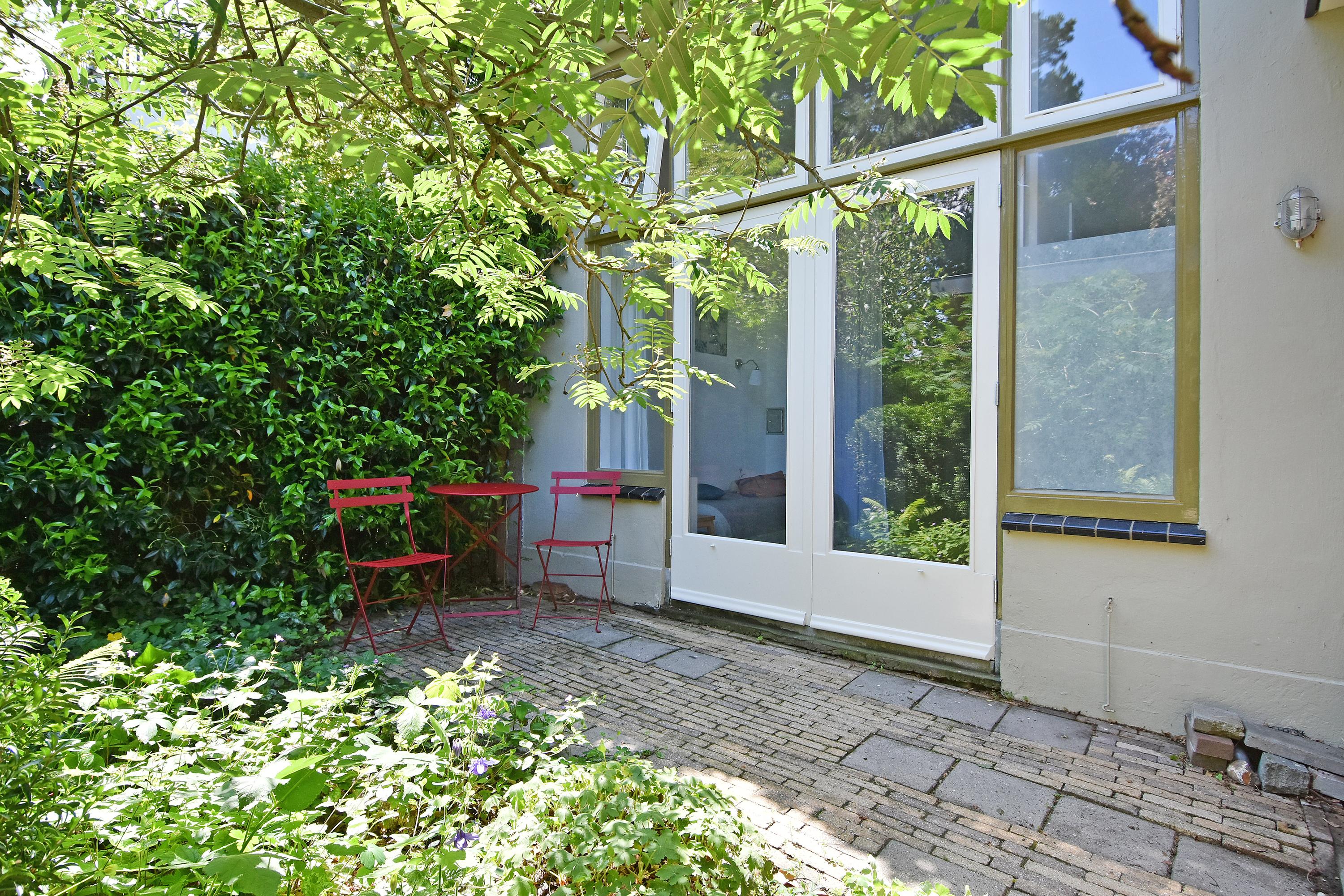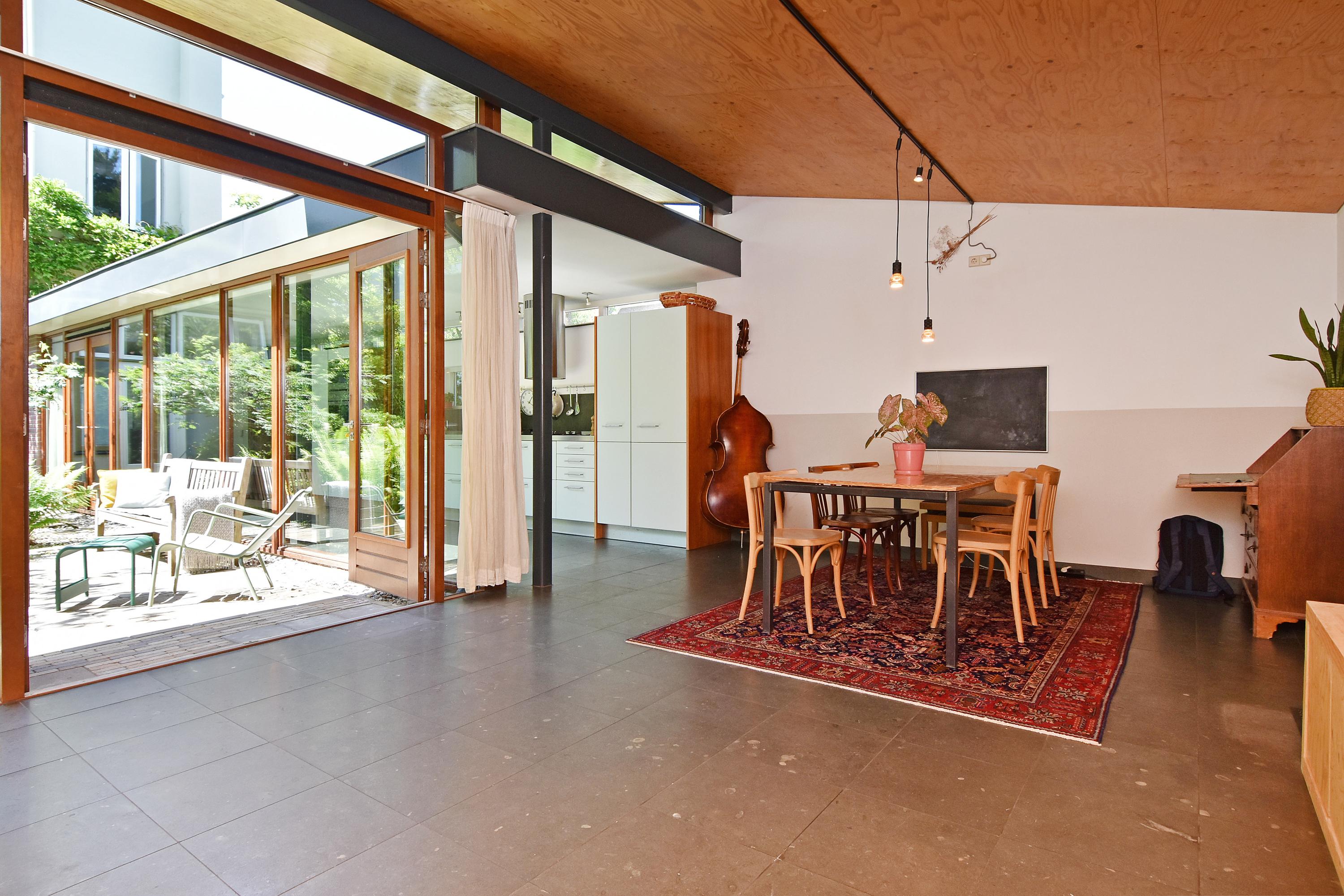 A modern extension forms a remarkable combination with the historic house. Here you will find a fully equipped and spacious kitchen, featuring a large block with stainless steel countertop, drawer units, excellent workspace, and many (designer) built-in appliances. Large windows provide unique views of the beautifully landscaped, lush, and sunny garden. Adjoining is a generous dining and music room, which also opens onto the back garden via French doors. This dining room also connects to the large garage at the rear, which benefits from daylight and can also be accessed via the side street.